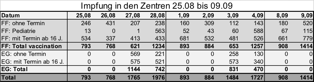 12 Daten für die mobile Impfung, 24 Standorte, mehr als 3600 injizierte Dosen: Dies ist die Erfolgsbilanz der mobilen Impfung, die im August im Kanton Freiburg gestartet ist. Die erste Tour mit Erstimpfungen endete Anfang September. In den meisten Fällen konnte die Anzahl Impfdosen der Nachfrage angepasst werden. Seit dem 9. September verabreichen die mobilen Teams an den gleichen Standorten die 2. Impfdosis. Erstimpfungen sind je nach Logistik des Standorts weiterhin möglich.