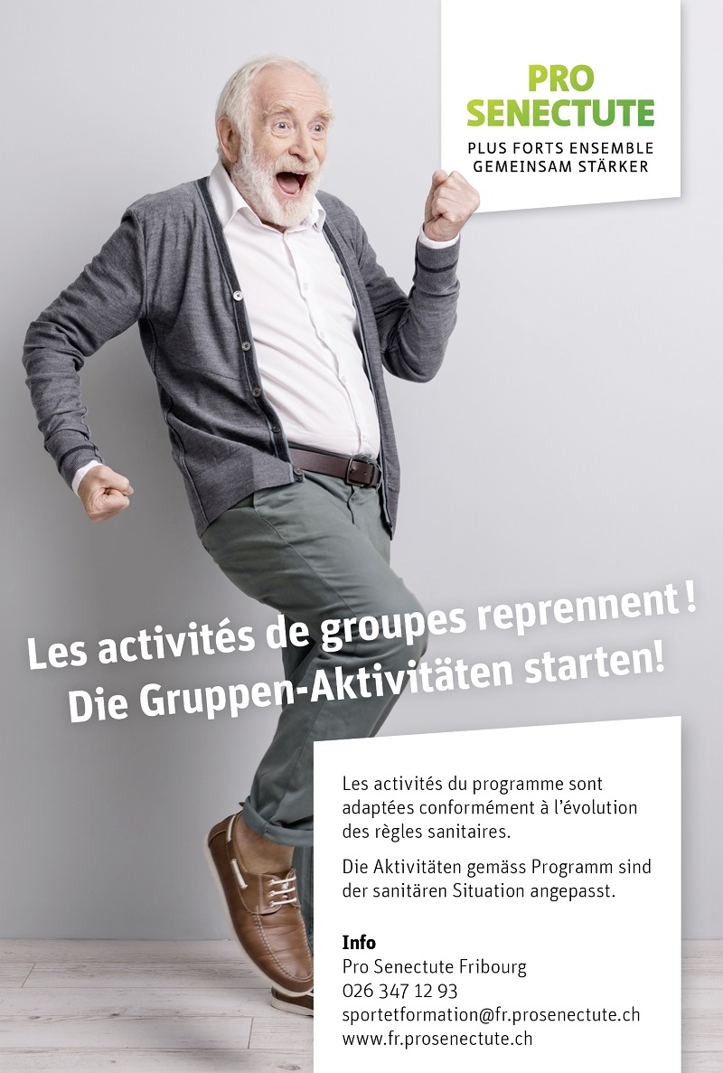 - Melden Sie sich bis zum 8. Mai 2021 an, telefonisch unter 026 347 12 93 oder per E-Mail an sportetformation@fr.prosenectute.ch. Achtung: Aufgrund der Sicherheitsmassnahmen ist die Platzzahl beschränkt. Pro Senectute Freiburg gibt den Interessierten bei der Anmeldung gerne Auskunft über die noch verfügbaren Plätze.