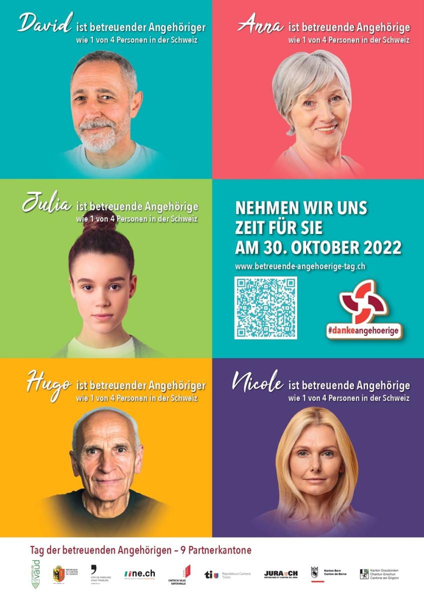 Neun Kantone – Waadt, Genf, Neuenburg, Wallis, Freiburg, Jura, Bern, Graubünden, Tessin – haben sich zusammengeschlossen, um ihre Einwohnerinnen und Einwohner anlässlich des Tages der betreuenden Angehörigen am 30. Oktober zu mobilisieren. Sie laden Sie alle ein, sich Zeit für die betreuenden Angehörigen in Ihrem Umfeld zu nehmen, ihnen eine Nachricht zu schreiben, eine kleine Freude zu machen, mit ihnen Kaffee zu trinken oder ihnen achtsam zuzuhören. Weitere Ideen für den 30. Oktober und alle anderen Tage des Jahres finden Sie auf www.betreuende-angehoerige-tag.ch . Bei dieser Gelegenheit wird auch daran erinnert, dass es wichtig ist, regelmässige Momente der Erholung einzuplanen, um sich selber Sorge zu tragen und Energie zu tanken.
