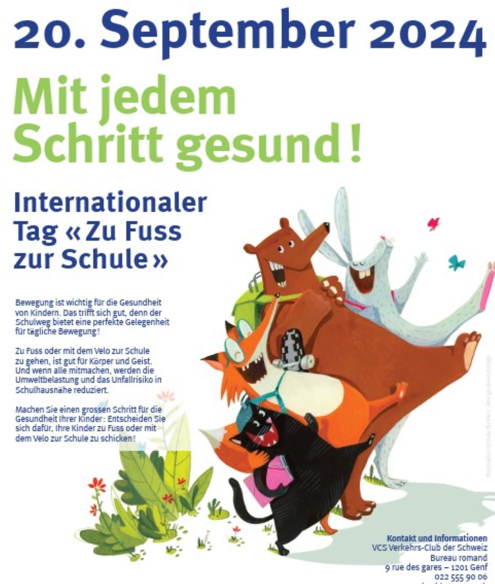 Der Verkehrs-Club der Schweiz (VCS) organisiert jedes Jahr im Rahmen der Europäischen Mobilitätswoche den Internationalen Tag «Zu Fuss zur Schule». Er setzt dabei jeweils den Schwerpunkt auf ein bestimmtes Thema im Zusammenhang mit der Schulwegsicherheit oder den zahlreichen Vorteilen, zu Fuss oder mit dem Velo zur Schule zu gehen. Der diesjährige Tag steht im Zeichen der Gesundheit; Langsamverkehr auf dem Schulweg ist nämlich wesentlich für die körperliche und geistige Gesundheit der Kinder und trägt zu einem nachhaltigen Lebensumfeld für alle bei.