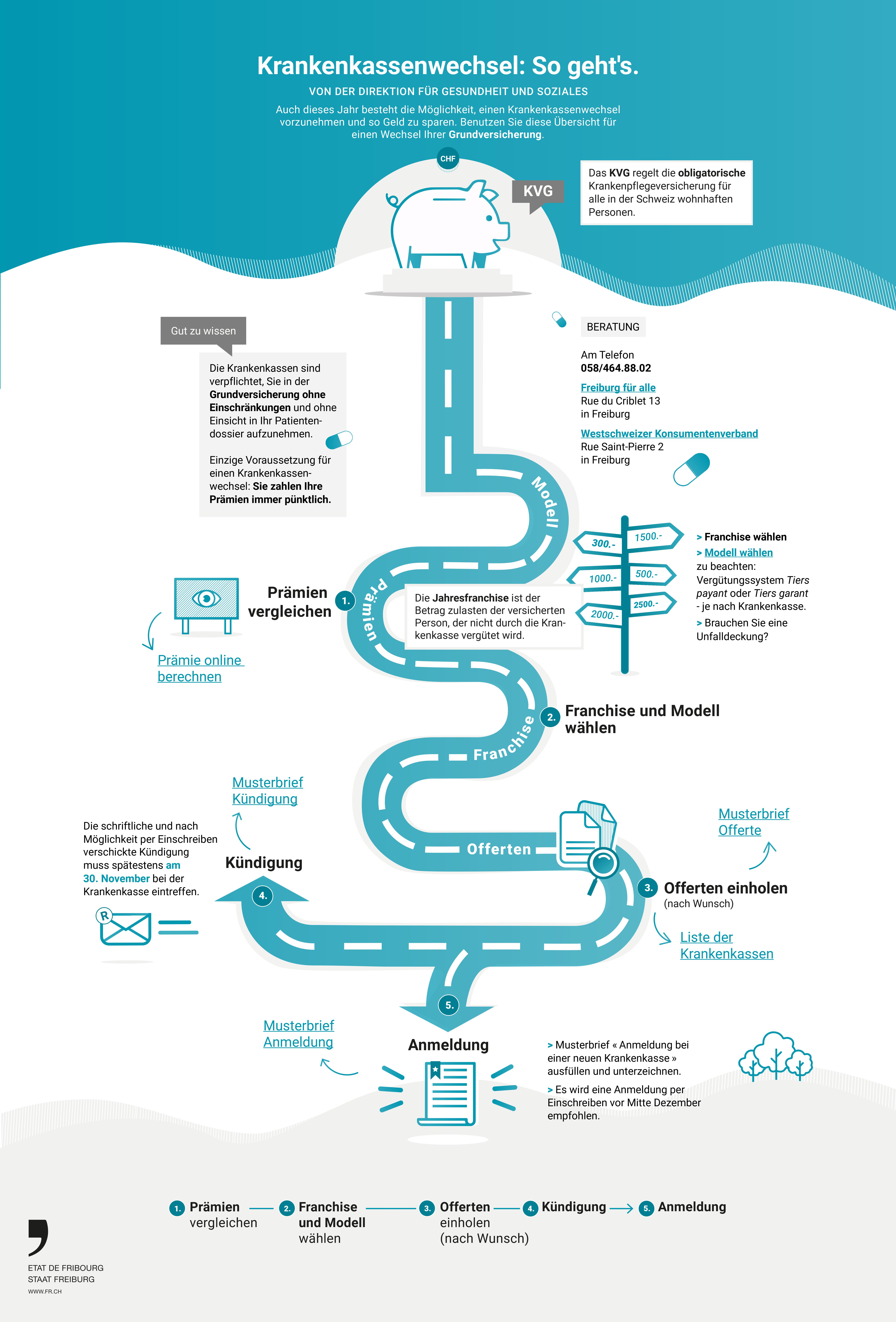 Auch dieses Jahr besteht die Möglichkeit, einen Krankenkassenwechsel vorzunehmen und so Geld zu sparen. Benutzen Sie die Infografik der Direktion für Gesundheit und Soziales (GSD) für einen Wechsel Ihrer Grundversicherung.
