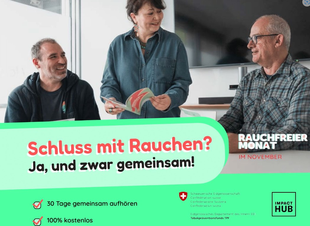 Der Tabakpräventionsfonds (TPF) unterstützt die Initiative finanziell; sie soll Raucherinnen und Raucher dazu ermutigen, einen Monat lang mit dem Rauchen aufzuhören, und sie so auf ihrem Weg in ein rauchfreies Leben unterstützen. Die Teilnahme ist kostenlos, die Anmeldung läuft vom 1. September bis 31. Oktober 2024: www.rauchfreiermonat.ch .