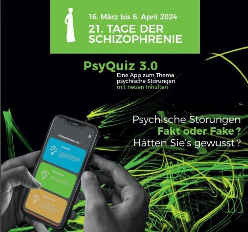 Zudem können die Teilnehmer/innen ihr Wissen über psychische Gesundheit vertiefen und im PsyQuiz testen. Neben Schizophrenie werden im Quiz auch andere psychische Störungen wie Depression, Borderline, bipolare Störung, Essstörung, Alkoholabhängigkeit oder Sucht thematisiert. In der Version 3.0 bietet das PsyQuiz ab dem 6. März 2024 neue Inhalte zu Angststörungen und den falschen Vorstellungen über Suizid. Die deutsche Version der App wurde verbessert.