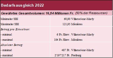 Das Gesamtvolumen des Bedarfsausgleichs zu Lasten des Staates beträgt 50% des Ressourcenausgleichs, d.h. 16'540'983 Franken. Der Bedarfsausgleich ist somit im Vergleich zum Jahr 2021 um 731'795 Franken gestiegen, der relative Anstieg entspricht jenem des Ressourcenausgleichs (+4,63%). Hier sind alle Gemeinden anspruchsberechtigt.