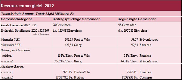 Beim Ressourcenausgleich wird festgestellt, dass die Gemeinde Pont-la-Ville, die 2021 begünstigt war, im Ausgleich 2022 beitragspflichtig wird. Es gibt keine Änderungen in entgegengesetzter Richtung.