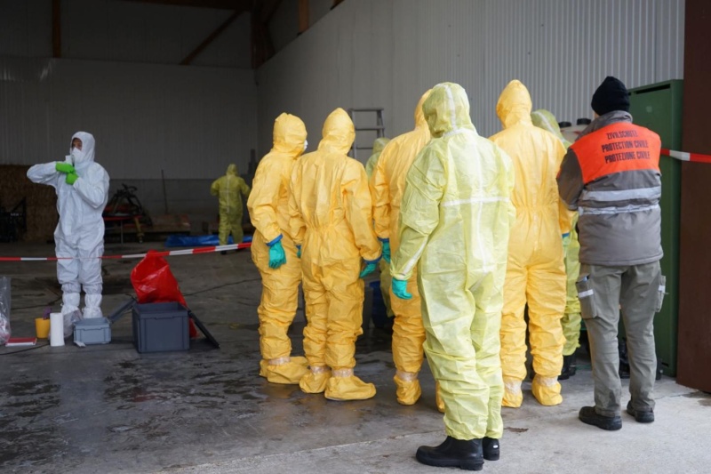 Das Tierseuchen-Einsatzteam wurde an diesem regnerischen Tag frühmorgens in den Wald von Middes aufgeboten. Trotz der unfreundlichen Wetterbedingungen haben die 70 einberufenen Personen mit Ernsthaftigkeit und Begeisterung die Übung in Angriff genommen, die vom Kantonstierarzt und Vorsteher des Amtes für Lebensmittelsicherheit und Veterinärwesen (LSVW), Grégoire Seitert, vorbereitet worden war.