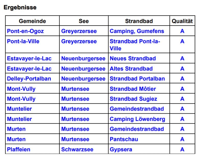Diese Aufteilung ermöglicht eine Beurteilung des Wassers im Hinblick auf seine hygienische Unbedenklichkeit aus bakteriologischer Sicht. Die vom 9. bis 16. Juni 2021 durchgeführten Kontrollen ergaben für die zwölf Proben eine Wasserqualität der Klasse A. Die Klasse A steht für eine Badewasserqualität, die keine gesundheitliche Beeinträchtigung der Badegäste erwarten lässt.