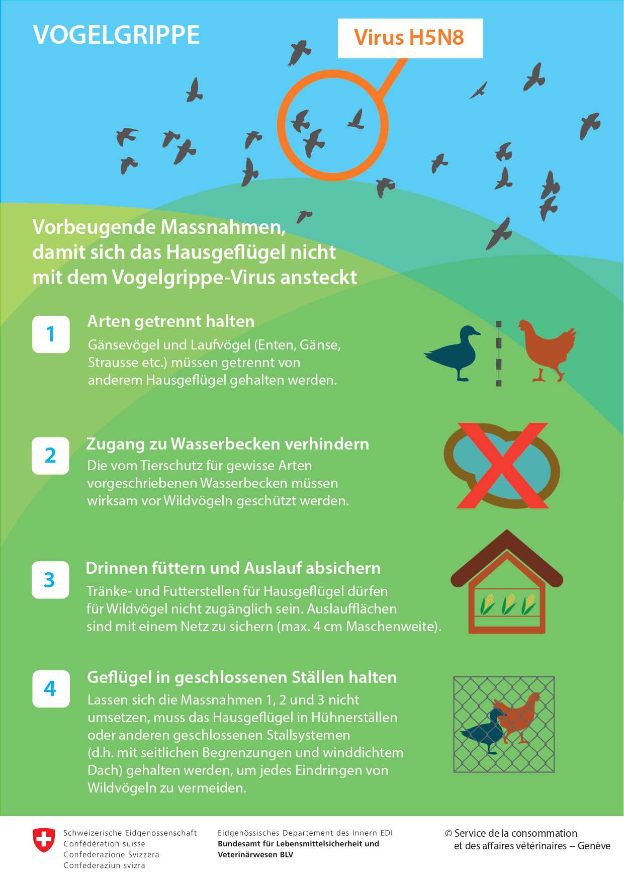 Die Situation wird laufend analysiert und die Massnahmen werden, wenn nötig, angepasst. Weitere Informationen zum Schutz des Hausgeflügels finden sich auf der Webseite des BLV .
