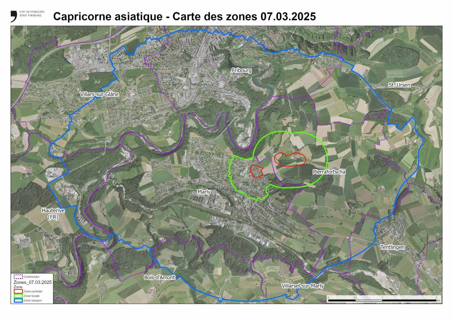 Die Analysen des Asiatischen Laubholzbockkäfers, der im Herbst 2024 in Marly gefunden wurde, zeigen, dass es sich bei dem Insekt um einen Nachkommen des Befalls handelt, der 2014 festgestellt wurde. Weitere Individuen befinden sich in der Region und die Pufferzone wird daher ausgeweitet. Phytosanitäre Fällungen werden in der Kernzone durchgeführt.