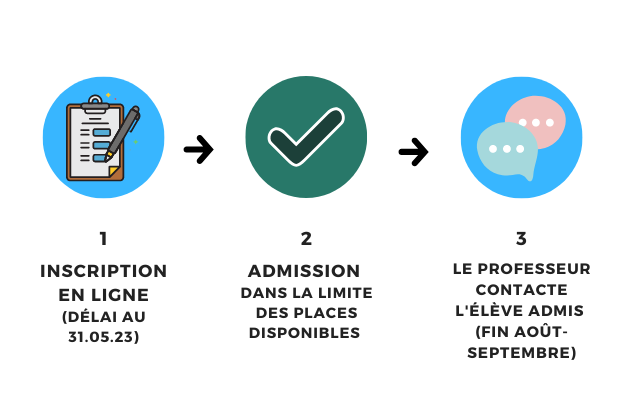 Anmeldung Datum Anmeldung wird bearbeitet und im System eingeschrieben Juni Zuteilung der Schüler und Organisation der jeweiligen Klassen durch die Direktion Juli Sollte jedoch im Moment kein Platz frei sein, wird Ihre Anmeldung auf eine Warteliste gesetzt Sie werden schriftlich im Juli benachrichtigt Der Lehrer:in nimmt Kontakt auf mit dem Schüler:in Von Juli bis September Die Anmeldungen, die nach der Anmeldefrist eingetroffen sind, werden auf eine Warteliste gesetzt Sobald ein Platz frei ist, werden Sie kontaktiert -