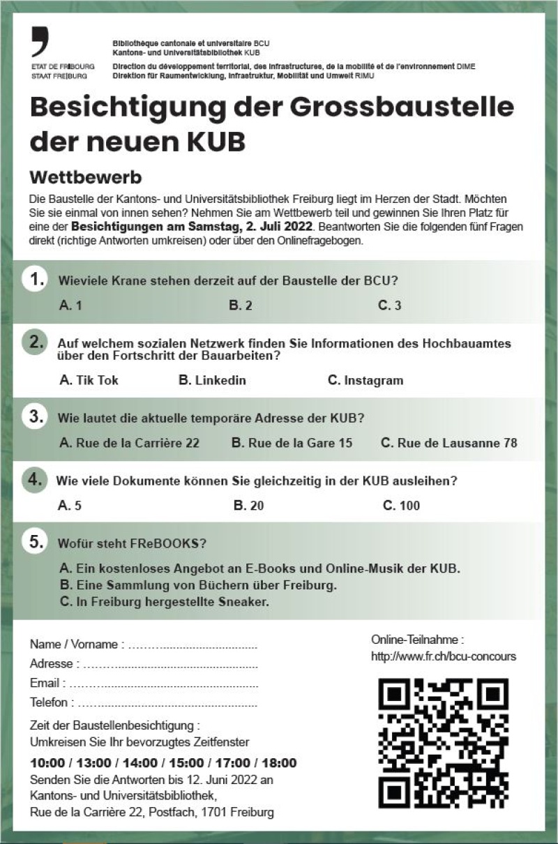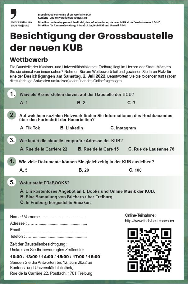 Seit mittlerweile über einem Jahr befindet sich Ihre KUB im Herzen der Stadt im Umbau. Nun ist es an der Zeit, die Tore zur Baustelle zu öffnen und Ihnen am 2. Juli 2022 eine öffentliche Besichtigung anzubieten. Ein Wettbewerb zur Auswahl der Teilnehmer startet. Nehmen Sie daran teil und gewinnen Sie die Gelegenheit, die Baustelle von innen entdecken zu können, indem Sie die 5 Fragen des Online-Quiz beantworten