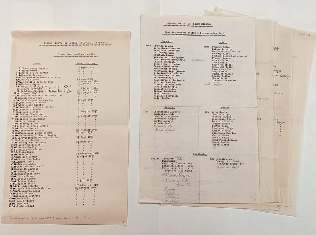 Das abwechslungsreiche und sehr dynamische Vokalensemble, welches 1903 gegründet wurde, wird anhand von verschiedenen Papierdokumenten, handschriftlichen und gedruckten Musikquellen, Fotoalben sowie auch einigen überlieferten Gegenständen sichtbar. Neben administrativen Unterlagen wie etwa Statuten, Protokolle und Zahlungsbelege finden sich im Archiv speziell angelegte Dossiers zu den musikalischen und aussermusikalischen Aktivitäten des Chores. Daraus wird ersichtlich, dass der Chor, welcher ab 1923 unter der Leitung von Kapellmeister Joseph Bovet (1879-1951) stand, nicht nur liturgische und musikalische Aufgaben in der Kathedrale wahrnahm, sondern auch in den damaligen Konzertsälen der Stadt auftrat und regelmässig an den Kantonalen Gesangsfesten teilnahm. Die aufgeführten Kompositionen sind in der Musikbibliothek des Chores überliefert, welche sich gleichermassen aus Werken grosser Komponistennamen, regionalen Persönlichkeiten und Kleinmeister zusammensetzt.