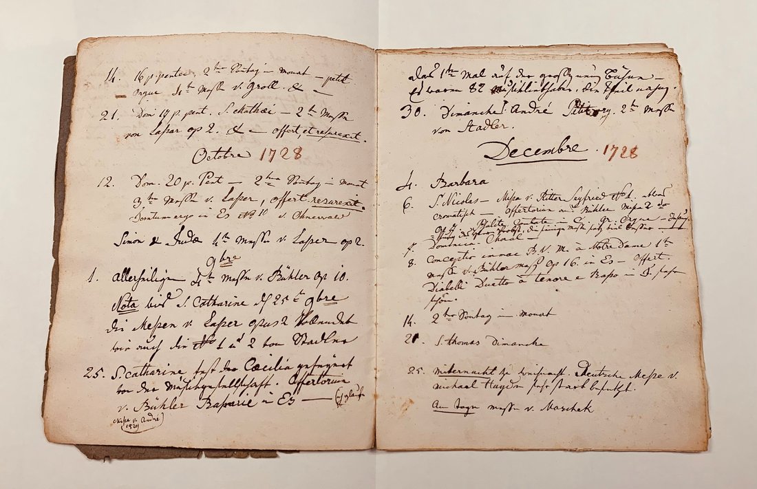 Beim Konvolut aus dem 19. Jahrhundert handelt es sich um Archivalien aus der Kollegiatskirche St. Niklaus, die eine aufschlussreiche Ergänzung zur bereits vorhandenen Freiburger Musiksammlung des 18. und 19. Jahrhunderts im Musikarchiv der KUB darstellen. In dieser Sammlung befinden sich unter anderem die handschriftlichen und gedruckten Musikquellen, die im Stift unter dem Chorherren Franz Xaver Zürcher (1773-1846) aufgeführt wurden. Mehrere Kataloge im Konvolut halten die aufgeführten Werke (Messen, Offertorien, etc.) und ihre Interpreten und Interpretinnen in dieser Zeitspanne mit genauen Datumsangaben fest.