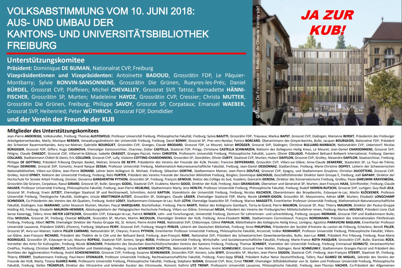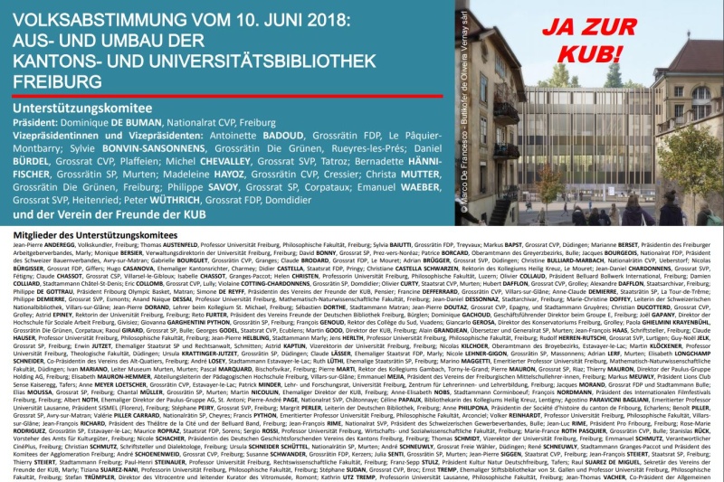 Das von Herrn Dominique de Buman präsidierte Komitee trat am 2. Mai 2018 vor die Freiburger Medien. Das Vizepräsidium setzt sich aus Freiburger Gossrätinnen und Grossräten aller politischen Gruppierungen zusammen: Antoinette Badoud, Sylvie Bonvin-Sansonnens, Bernadette Hänni-Fischer, Madeleine Hayoz, Christa Mutter, Daniel Bürdel, Michel Chevalley, Philippe Savoy, Emanuel Waeber und Peter Wüthrich.