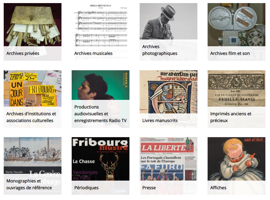 Unter den Beständen, die die Freiburger Identität prägen, befinden sich beispielsweise die Archive des Jaczzclubs La Spirale, des Théâtre des Osses oder von Freiburger Persönlichkeiten wie Charles de Castella de Montagny oder Joseph Bovet, Tonaufnahmen von Pierre Kaelin, Filme von Hugo Corpataux und Jacques Thévoz, Handschriften oder alte Drucke. Die Plattform beherbergt auch die Publikationen des Amts für Archäologie des Staates Freiburg (AAFF).