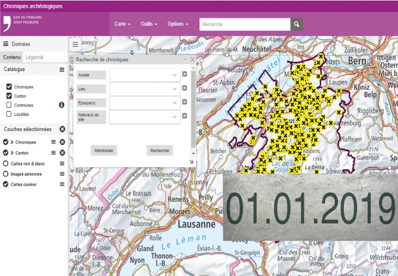 Ab diesem Jahr steht der Öffentlichkeit eine neue Web-anwendung des AAFR zu Verfügung, die mittels benutzerfreundlicher kartografischer Darstellung und spezifischen Suchfiltern einen modernen und einfachen Zugang zu sämtlichen archäologischen Fundberichten des Kantons gewährt (www.geo.fr.ch/ChronArc/). Ziel ist es, der Freiburger Bevölkerung und allen anderen Interessierten gezieltere und lokalere Informationen zum archäologischen Erbe des Kantons zu vermitteln und zugleich interessante Einblicke in die Tätigkeiten des AAFR zu geben.