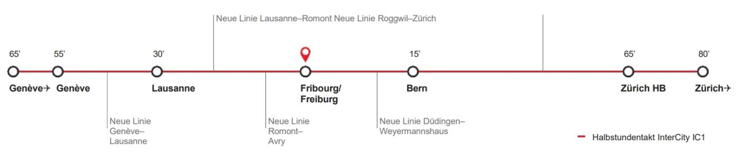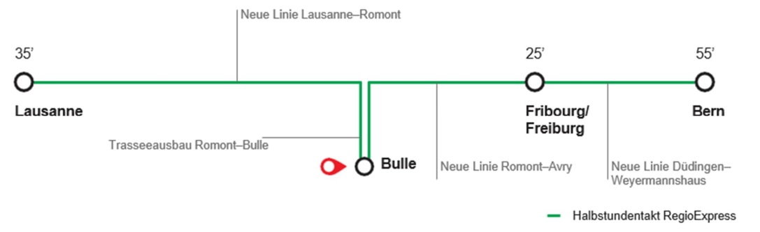 - die Fahrzeiten verkürzen, um Fribourg/Freiburg und Bulle besser in das nationale Fernverkehrsnetz zu integrieren;
