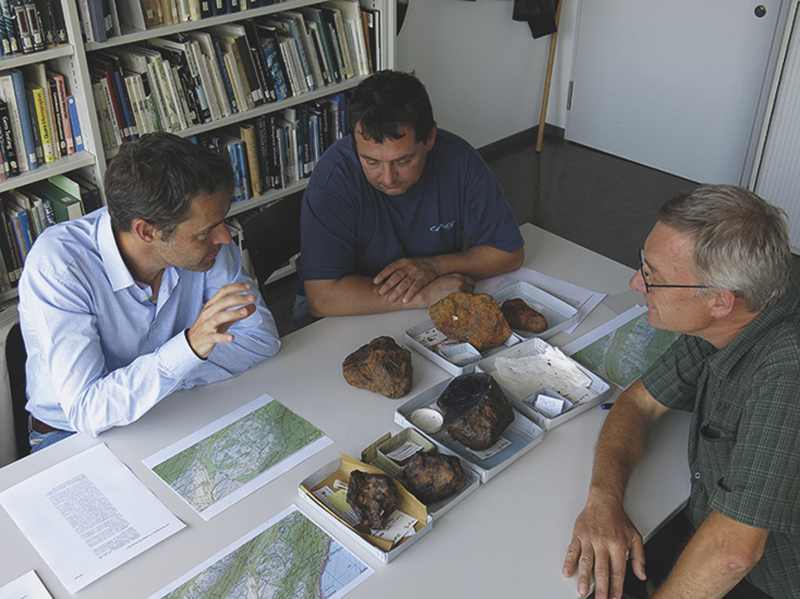 Für das Naturhistorische Museum Freiburg war dies Anlass, sich für seine Meteoriten-Sammlung um ein repräsentatives Stück dieses Jahrhundertfundes zu bemühen. Erste Kontakte mit den Berner Projektverantwortlichen zeigten, dass im Einklang mit der Gesetzgebung des Kantons Bern zu naturwissenschaftlich bedeutsamen Fundstücken ein Handel möglich sein würde. Und so begaben sich Peter Wandeler und Emanuel Gerber vom Museum Freiburg am 9. September 2015 ins Naturhistorische Museum Bern, um dort zusammen mit den Herren Hofmann und Jost die in Frage kommenden Meteoriten-Fragmente zu sichten und sich auf ein Objekt zu einigen. Die Diskussion ergab, dass das Endstück eines grossen Fragments für Freiburg besonders gut geeignet sein würde, dies wegen der schönen Kruste und der grossen Schnittfläche. Letztere würde es erlauben, besonders viel des interessanten Inneren des Meteoriten zu sehen.