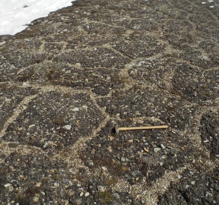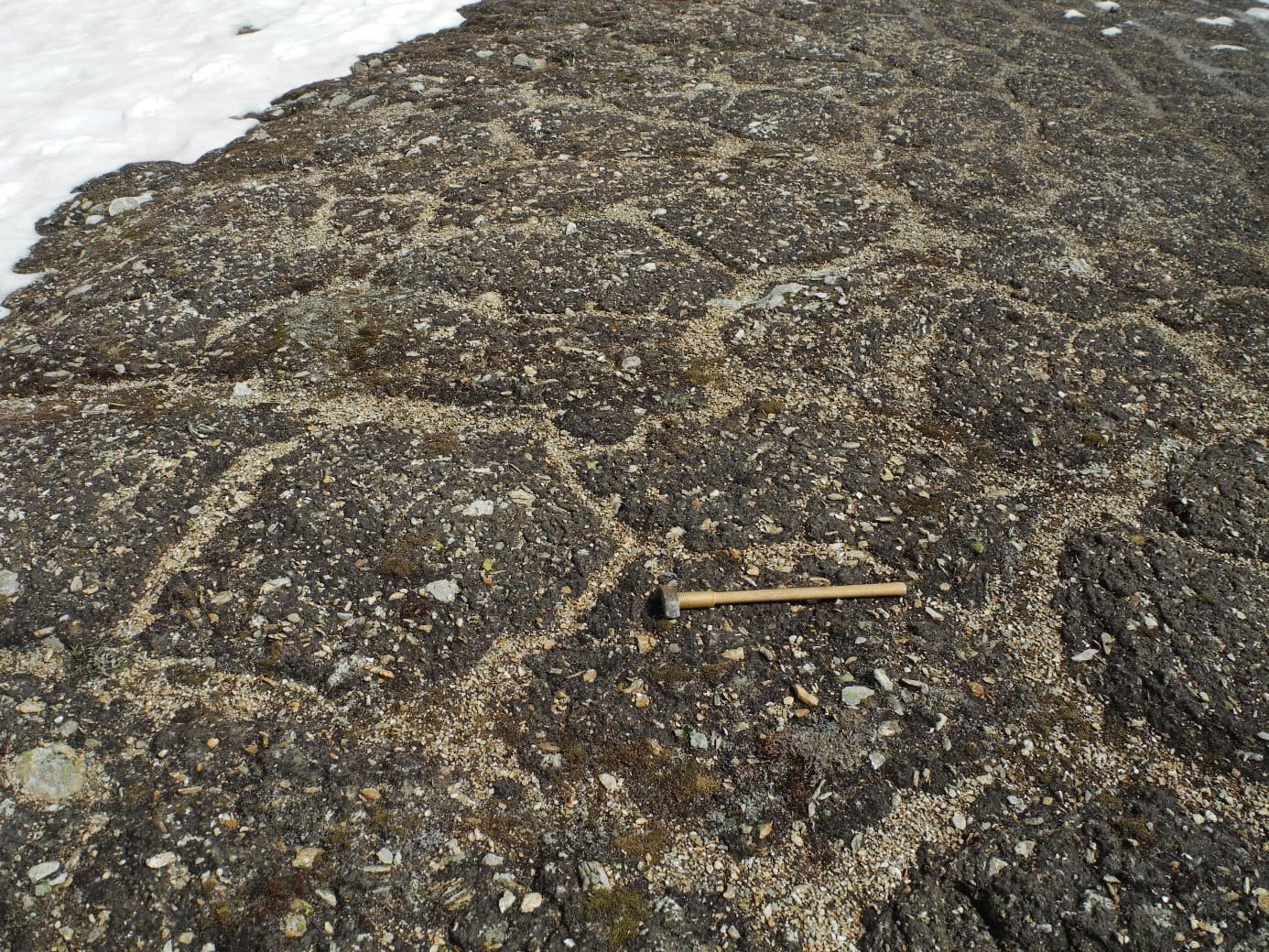 Jetzt, im Spätsommer, ist der Boden unter unseren Füssen schneefrei und enthüllt ein Patchwork aus Polygonen, das durch die ständigen Frost-Tau-Zyklen in dieser Höhe entstanden ist. Etwas weiter klettern die Mitglieder unserer Gruppe über schneeweisses, poröses Gipsgestein, das von dem trockenen Klima zeugt, welches hier vor ungefähr 200 Millionen Jahren an den Ufern des damaligen Ozeans herrschte.