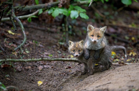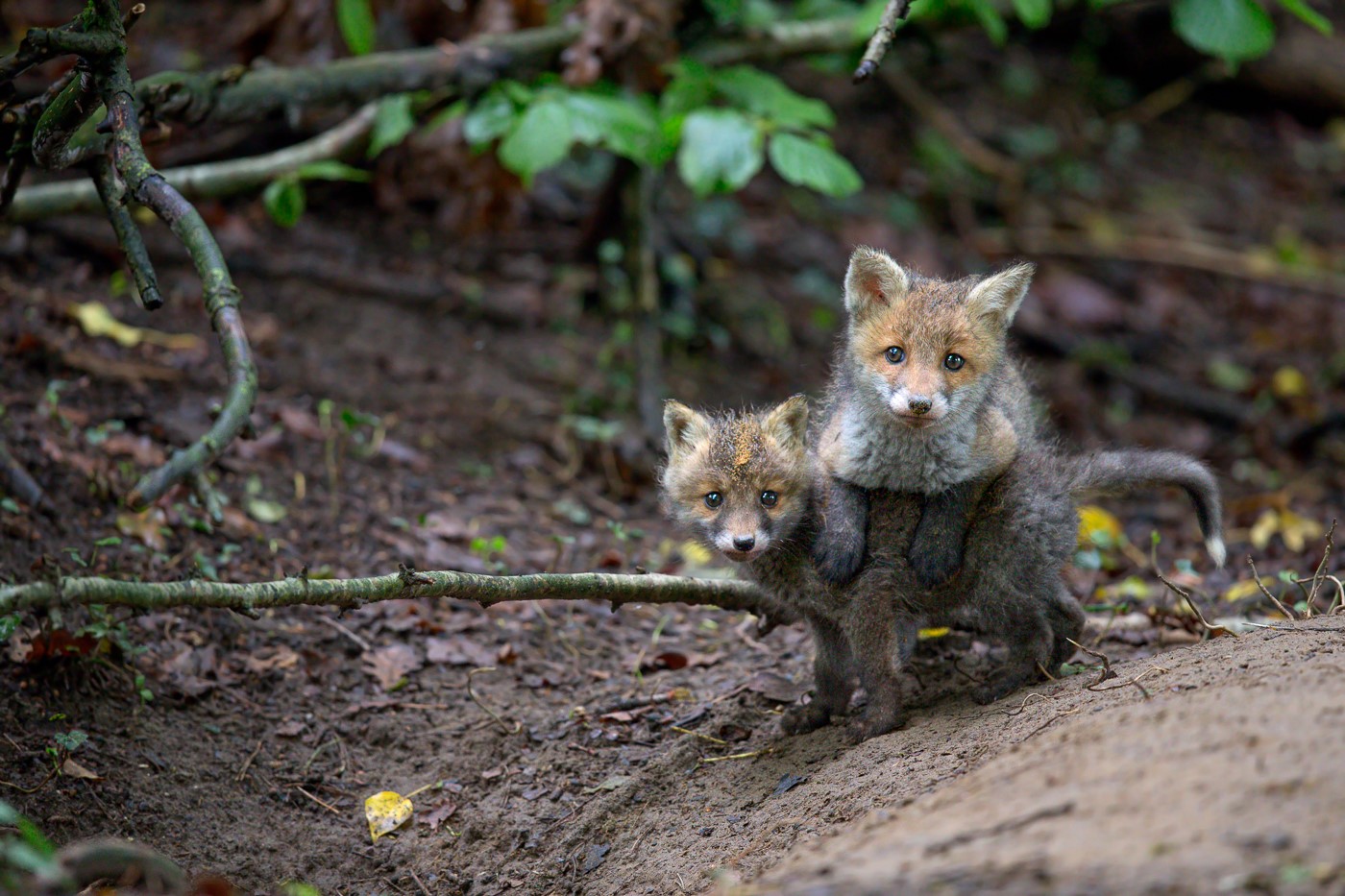 Eine kleine graue Schnauze lugt zwischen zwei Wurzeln hervor und erschnüffelt zum ersten Mal die Gerüche des Waldes. Eine Pfote erkundet vorsichtig den Laubteppich, und ein blaues Augenpaar entdeckt die Vielfalt der Farben, die es hier gibt. Die Mutter des kleinen Fuchses hat entschieden, dass er und seine Geschwister mit vier Wochen alt genug sind, um die Umgebung ihres Baus zu erkunden.