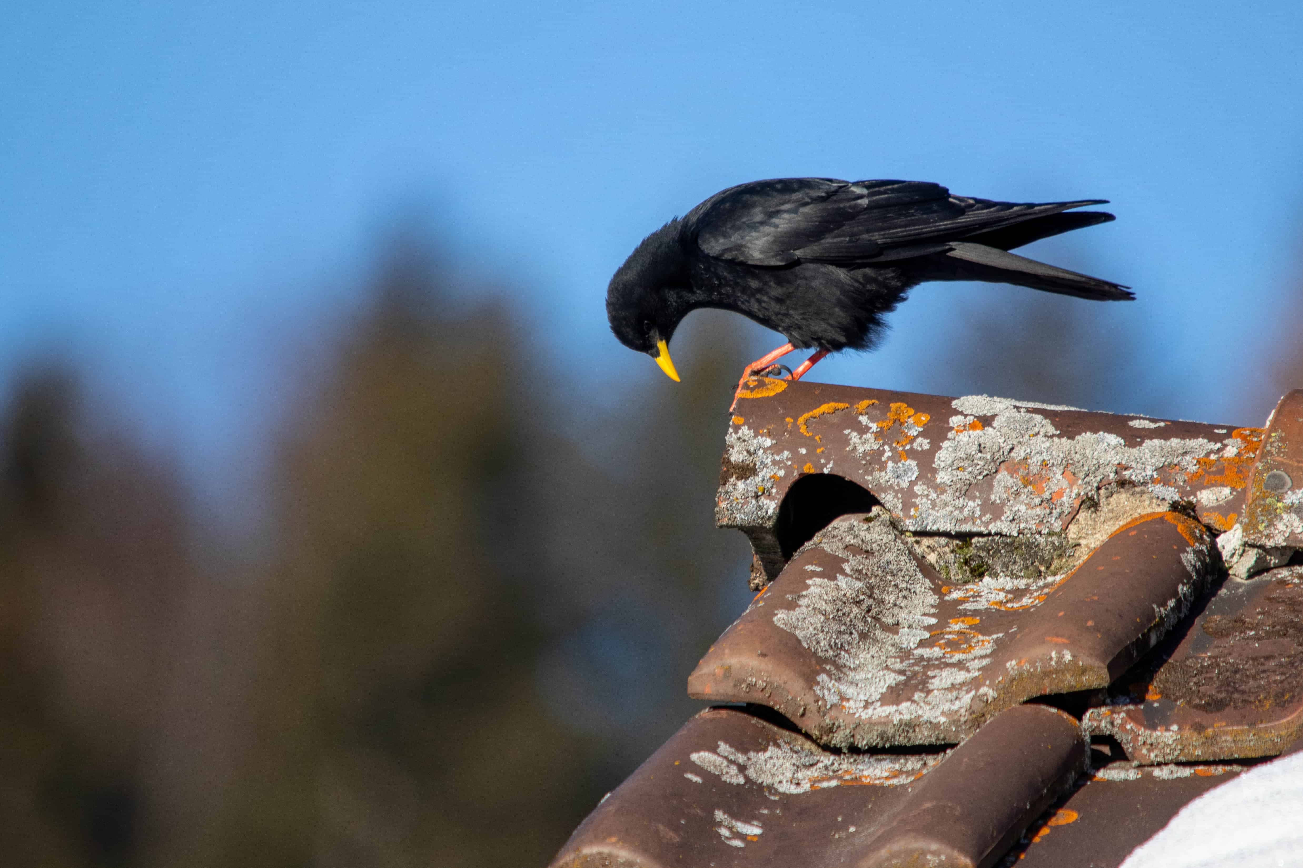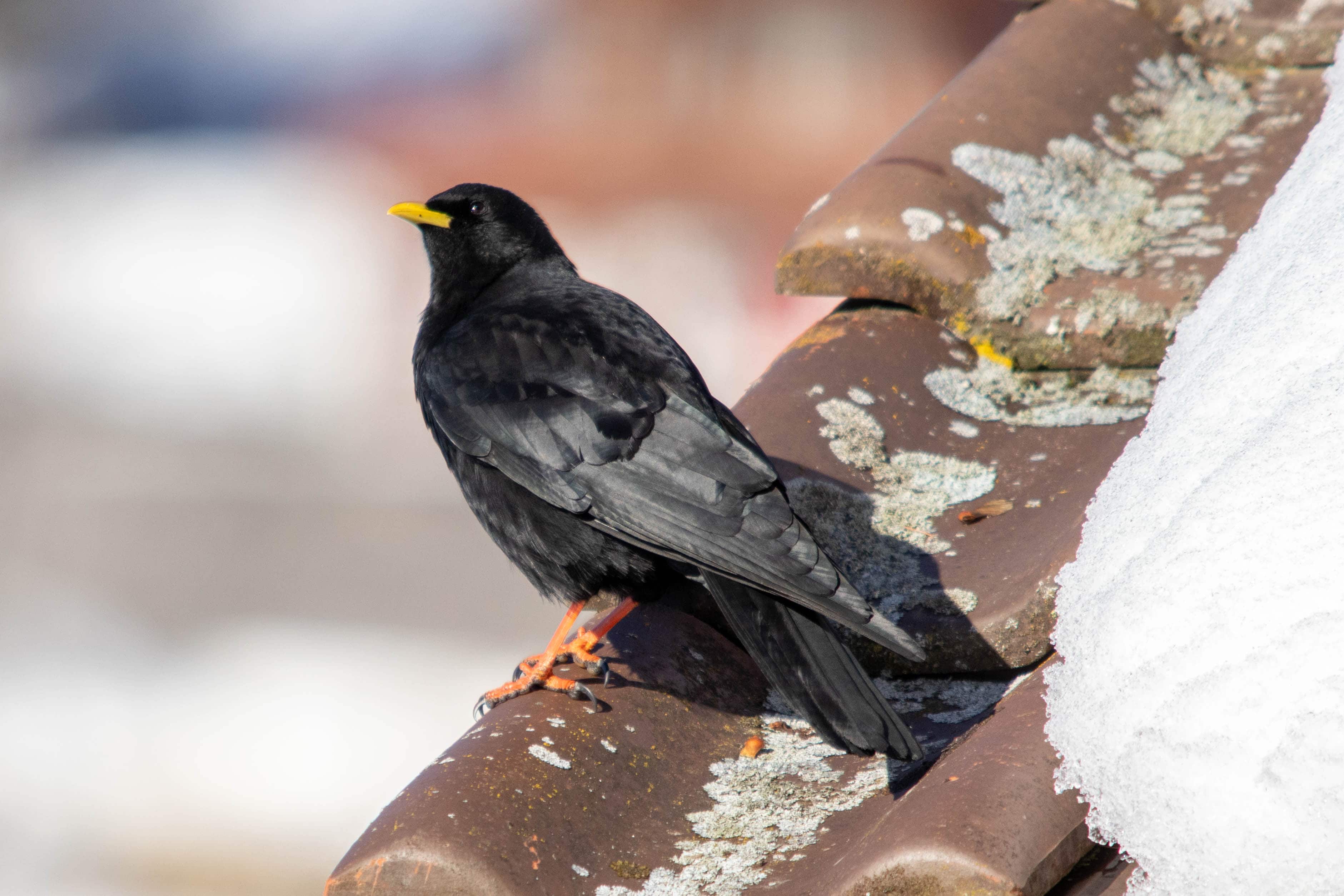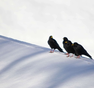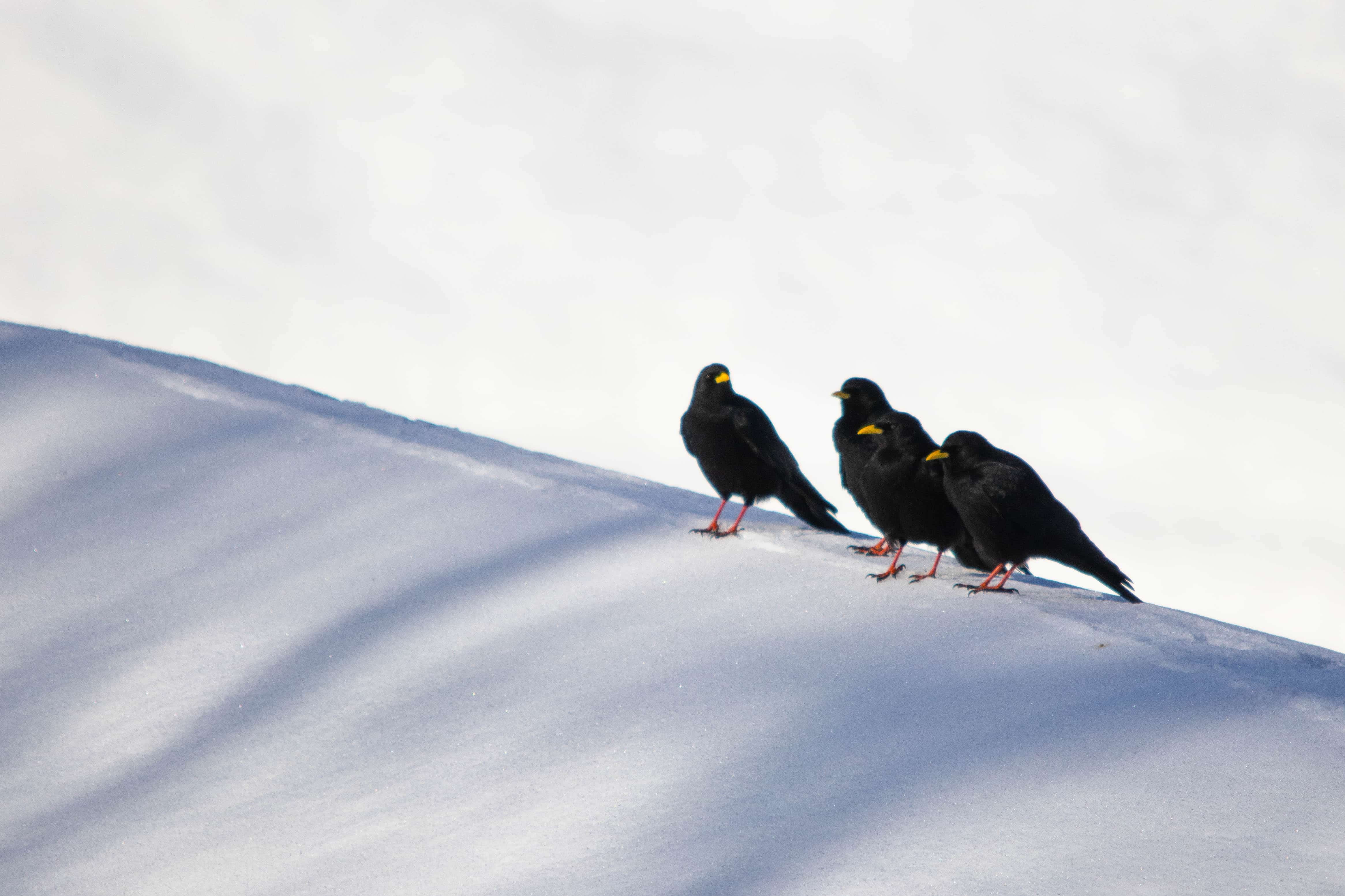 Es handelt sich um Alpendohlen, und diese Vögel sind echte Opportunisten. Gewöhnlich ernähren sie sich im Winter von Früchten, doch auch Körner verschmähen sie nicht, ebenso wenig wie die Sandwich-Krümel, die sie von Skifahrern stibitzen. Obwohl sie ein bisschen an Hitchcock erinnern, tragen sie mit ihren Flugkünsten und ihren zarten Rufen doch unbestreitbar zum Charme der Berge bei – im Sommer wie im Winter.