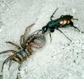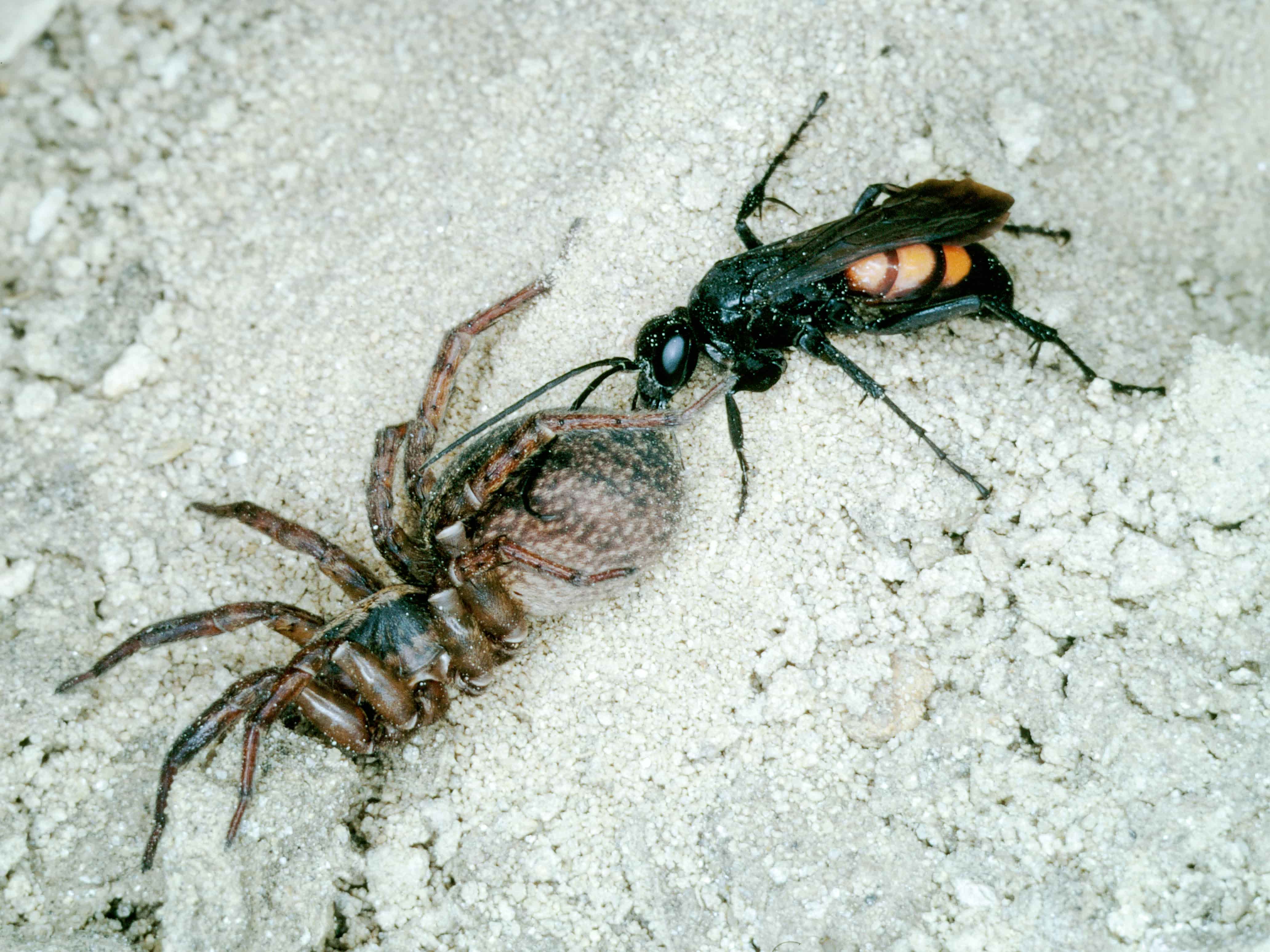Wer unter Arachnophobie leidet, hat ab sofort eine neue beste Freundin: die Wegwespe. Als Fressfeindin ist sie der Albtraum der Spinnenarten, die sie jagt, um ihren Nachwuchs zu ernähren. Die meisten Wegwespenarten sind schwarz oder rot gefärbt und haben lange Beine. An ihrem typischen Verhalten sind sie gut zu erkennen: Sie bewegen sich hüpfend fort, und bei der Jagd vibrieren ihre Flügel stark.