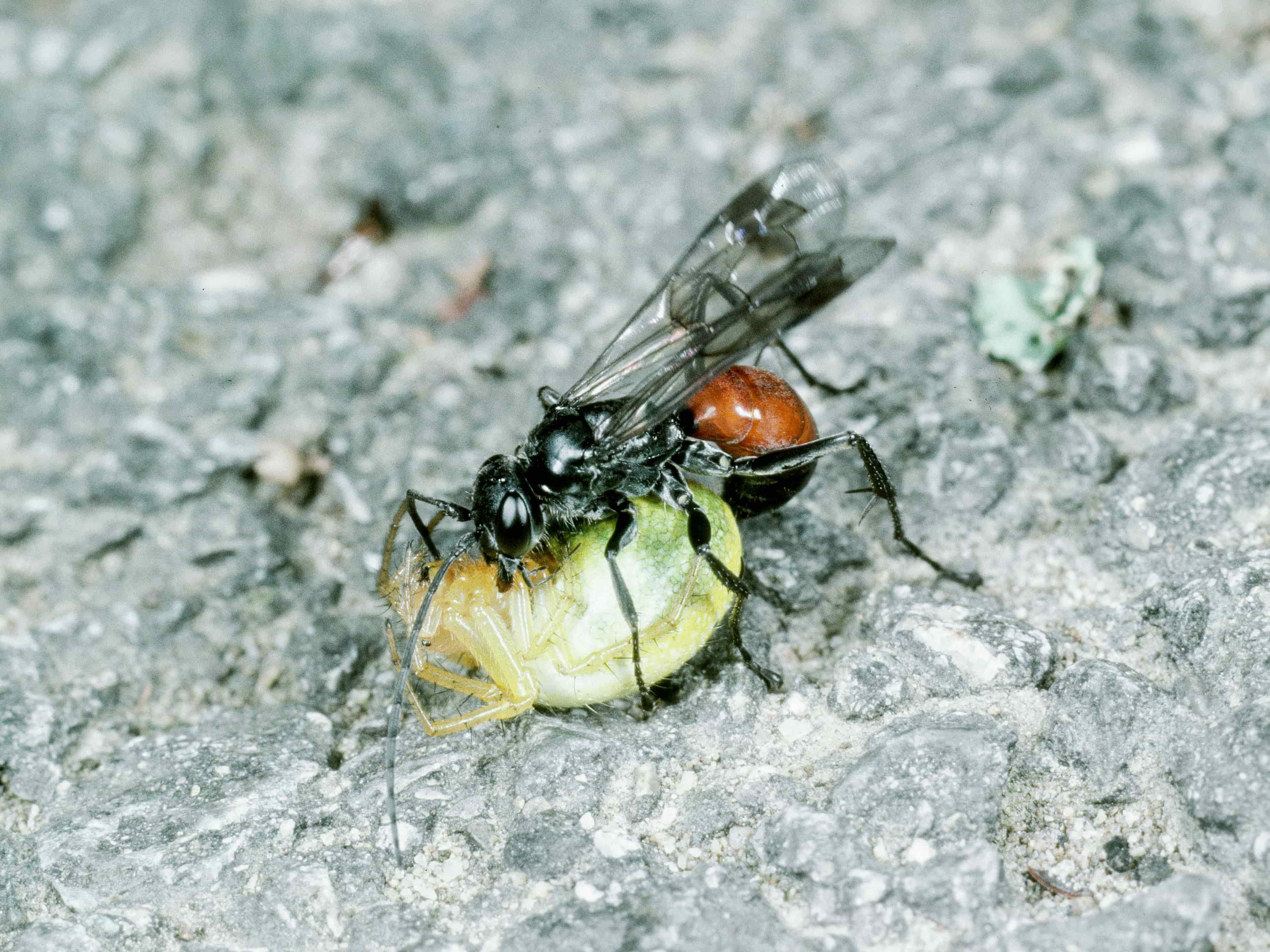 Hat eine Wegwespe eine Spinne erwischt, lähmt sie das Opfer mit ihrem Giftstachel und schleppt es in ein Erdloch. Dort legt sie ein Ei auf dem Körper der Spinne ab. Ist die Larve geschlüpft, fängt sie an, die Spinne bei lebendigem Leib aufzufressen, bis sie fertig entwickelt ist. Von ihrem Spinnen-Festmahl bleiben nur einige wenige Überreste zurück. Was tönt wie direkt aus einem Horrorfilm, ist eine wahre Geschichte aus der Natur!