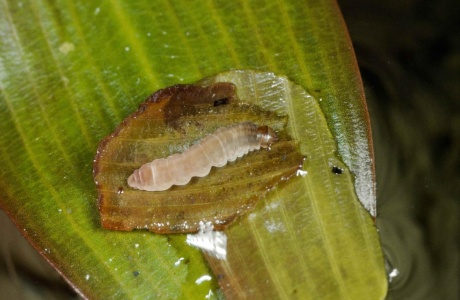 Auf den ersten Blick sieht die Raupe des Seerosenzünslers nicht sehr spektakulär aus. Doch hinter dem unscheinbaren Äusseren versteckt sich eine äusserst ungewöhnliche Lebensweise. Wie andere Arten der gleichen Unterfamilie, lebt die Raupe unter Wasser und atmet über die Haut. Um sich zu schützen, fertigt sie mit Seide versponnene Köcher aus zwei Blattstückchen an. So versteckt, muss sie nur den Kopf herausstrecken, um sich an den Blättern von Wasserpflanzen satt zu fressen. Mit der Zeit verliert die Raupe ihre Fähigkeit, über die Haut zu atmen. Dann konstruiert sie in ihrem Köcher ein Luftkissen, so dass sie immer ihre eigene Sauerstoffreserve dabeihat. Ist die Zeit reif, verpuppt sie sich, und nach rund fünfzehn Tagen schlüpft der Falter unter Wasser. Er kämpft sich danach an die Wasseroberfläche, wo er sich auf einem trockenen Blatt in Sicherheit bringt. Nun beginnt, nach dem Leben im Wasser, sein neues, nachtaktives Leben in der Luft.