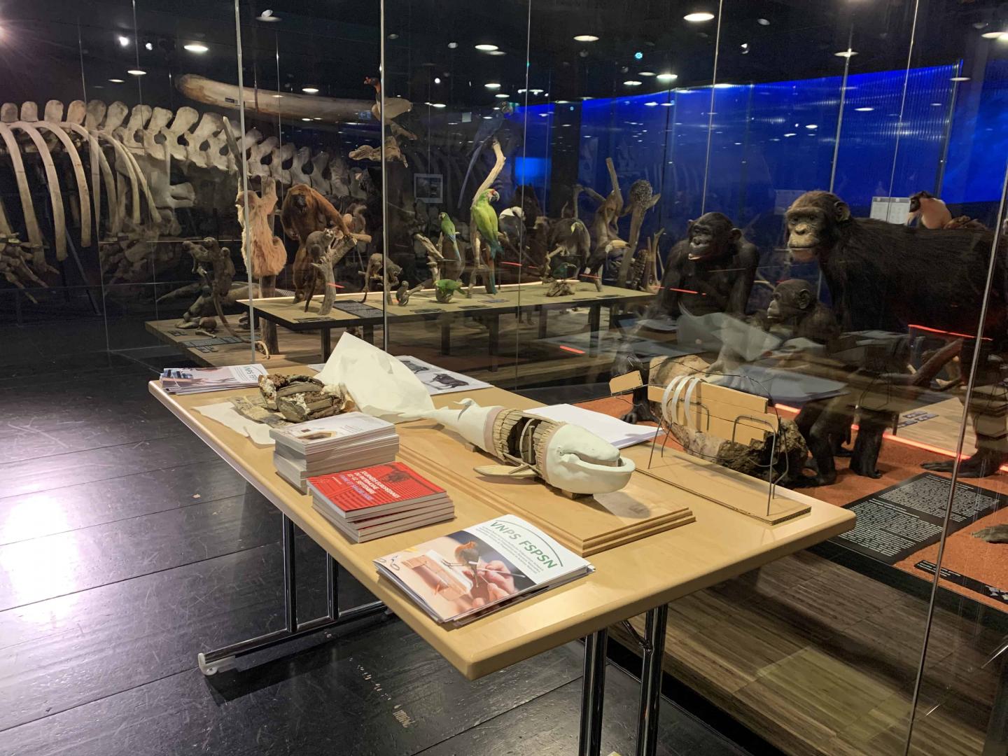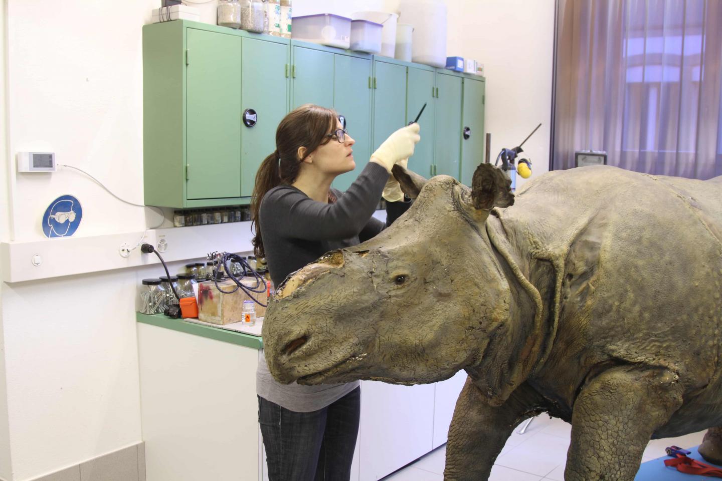 Der Seiwal (1852) und das Indische Panzernashorn (1889) legten ihr Innerstes offen: Zwei Modelle zeigten die verschiedenen Etappen der Präparation und die Materialien, die dabei verwendet wurden. 75 Besucherinnen und Besucher entdeckten, welche Schwierigkeiten und Herausforderungen sich im 19. Jahrhundert bei der Präparation grosser Tiere stellten. Tatsächlich war die Aufgabe für die Tierpräparatoren jener Zeit nicht leicht: Oft mussten sie ihre ganze Kreativität und viel Erfindungsreichtum einsetzen, um die Probleme in Zusammenhang mit der Statik und der Konservierung der Objekte zu lösen.