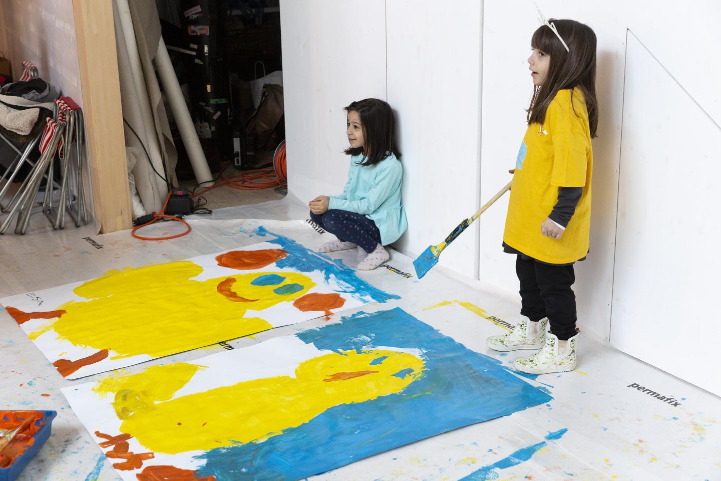 Die Magie hat sich im Atelier des Künstlers René Walker entfaltet, dem verantwortlichen Grafiker der Ausstellung. An seiner Seite haben sich die Kinder sofort ans Bemalen der grossformatigen Plakate gemacht. Sie waren dabei völlig frei, bis auf zwei Vorgaben: Sie mussten die Farben Gelb, Orange und Blau verwenden und natürlich die berühmten Küken darstellen. Ihre Arbeit wurde dokumentiert und wird im Rahmen der Ausstellung in einem Film zu sehen sein.