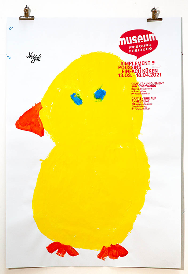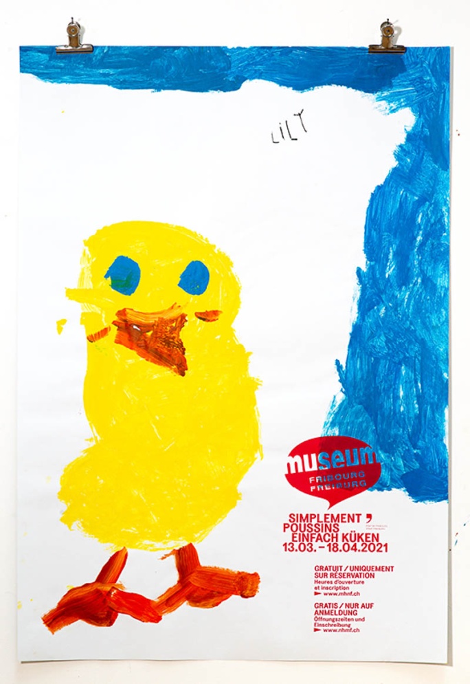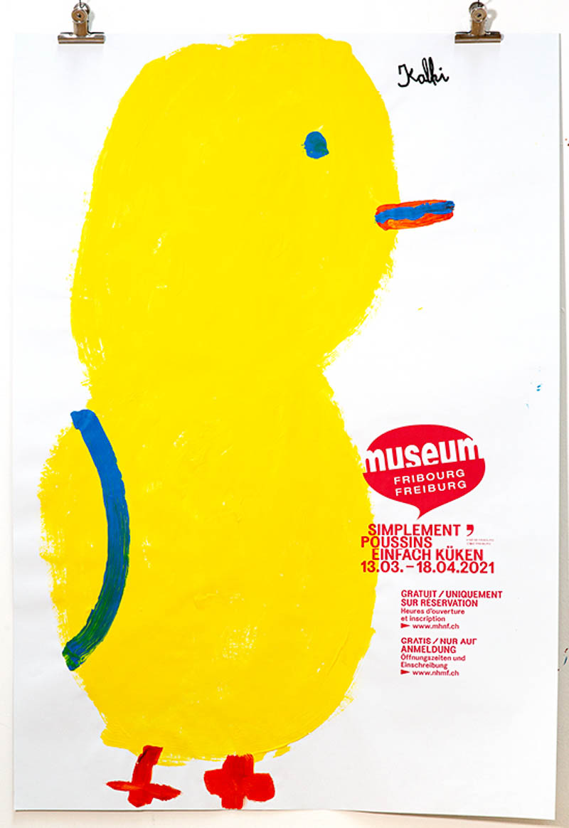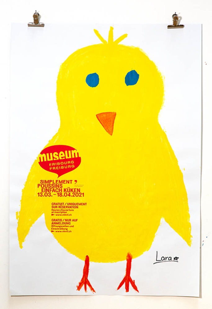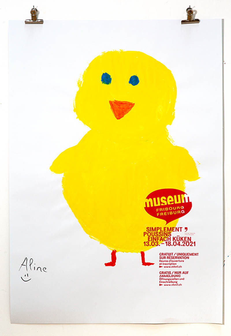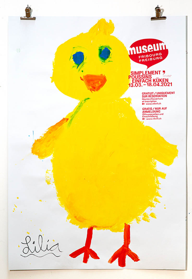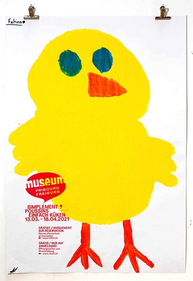 Die Küken sind aber nicht nur im Museum präsent, sondern in der ganzen Stadt Freiburg: Während der Dauer der Ausstellung bringen von Schulkindern gemalte Plakate mit Kükenmotiven Farbe in die Strassen der Stadt. Über 80 Schülerinnen und Schüler aus fünf Primarschulklassen der Stadt Freiburg haben insgesamt rund 120 Plakate gestaltet. Jedes ist ein Unikat: Alle Werke wurden im Atelier des Grafikers René Walker von Hand gemalt und im Siebdruckverfahren hergestellt. Die Plakate sind bis Ende der Ausstellung in drei Etappen zu sehen. Wer will, kann die Plakate mit diesem Stadtplan auf einem Spaziergang entdecken.