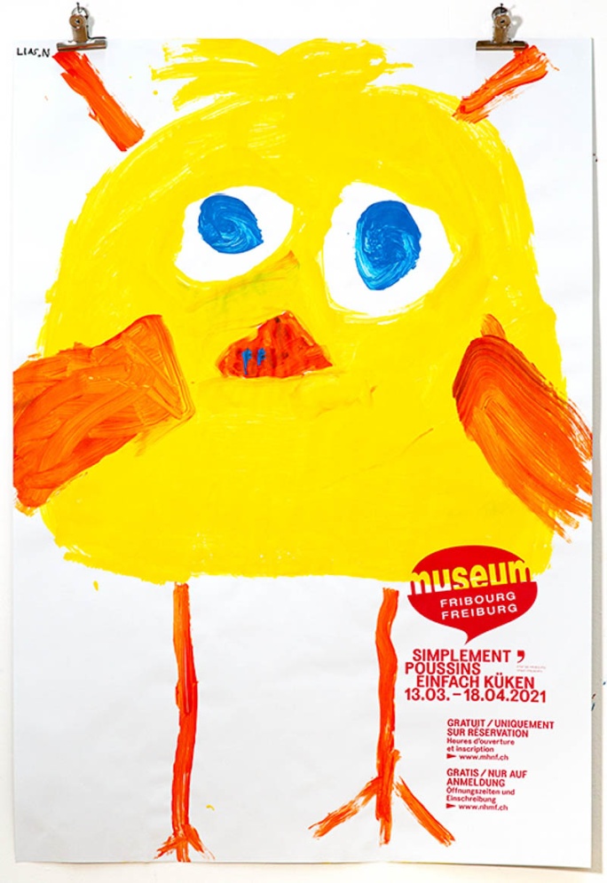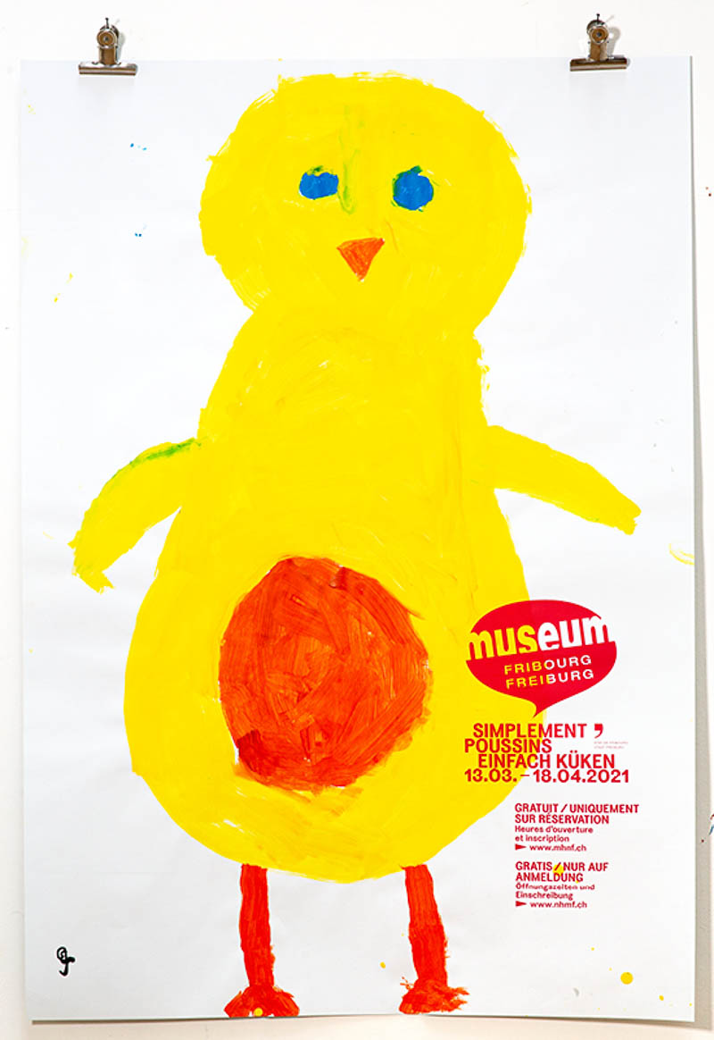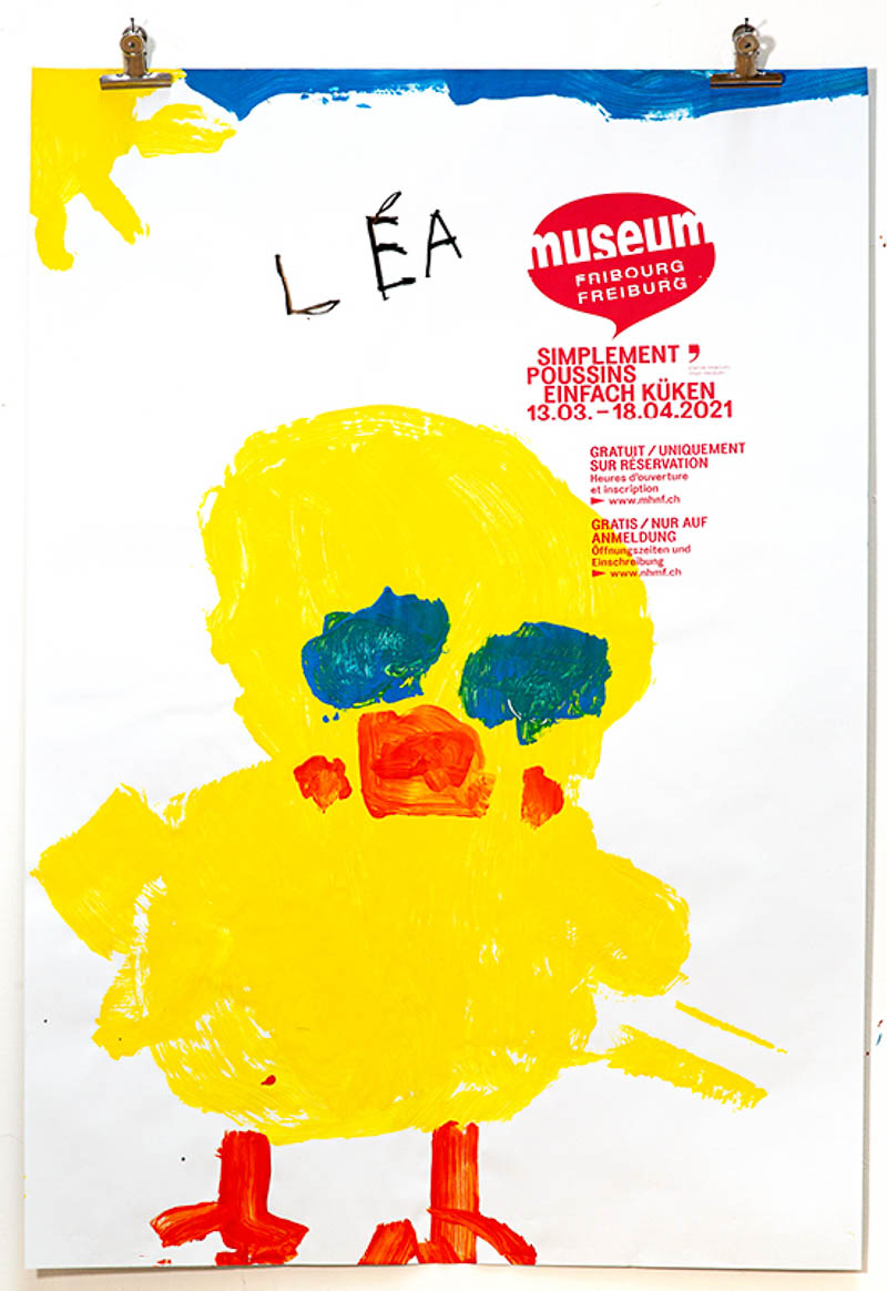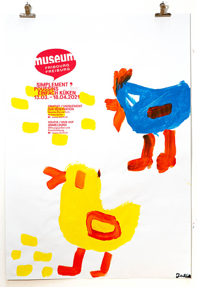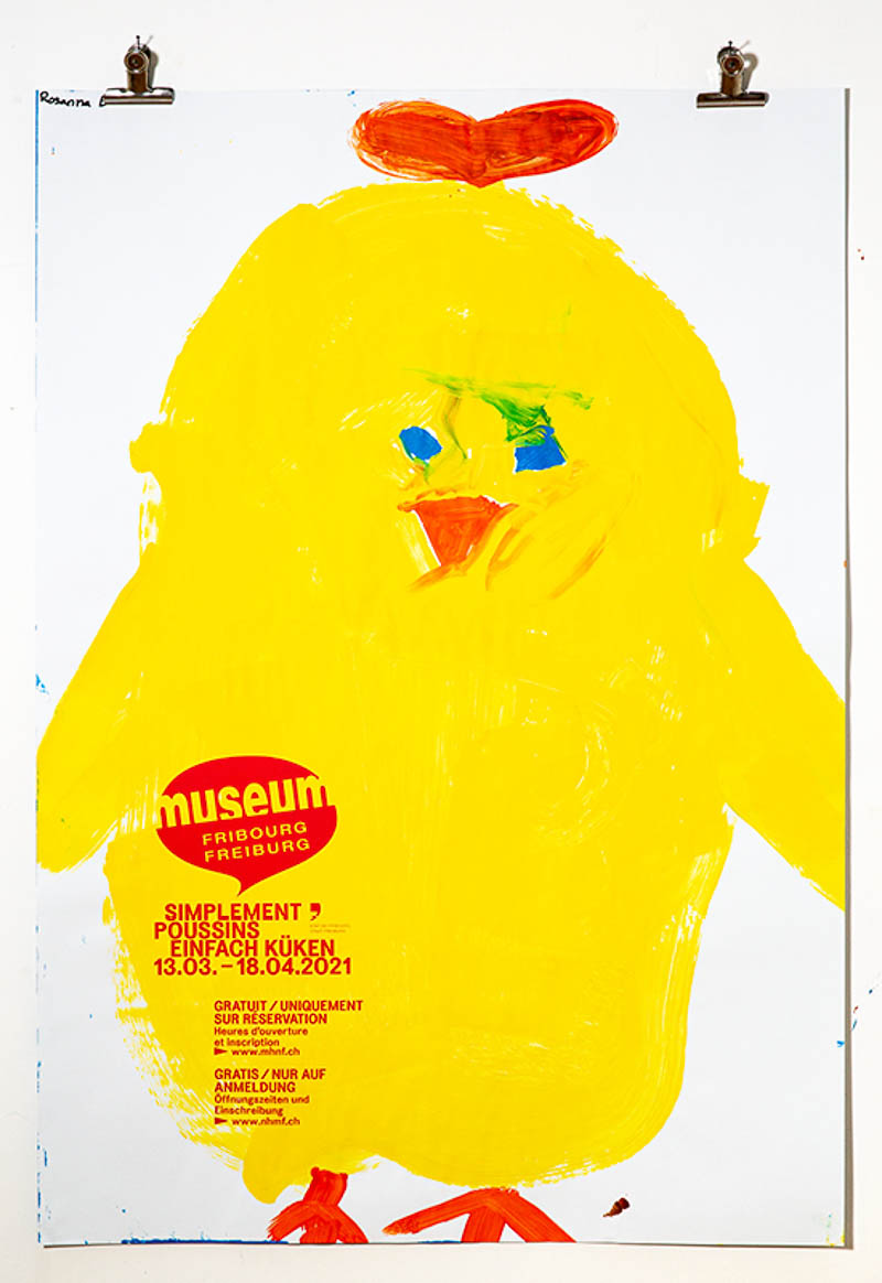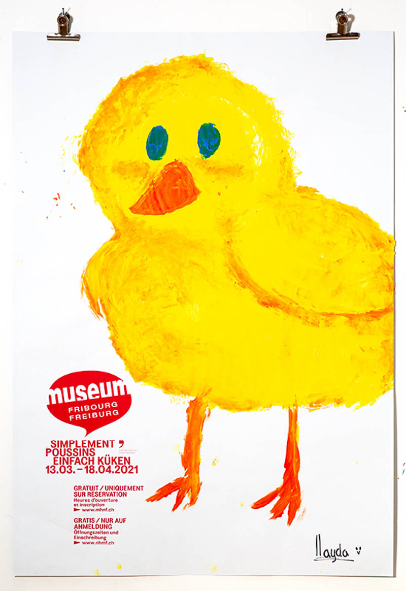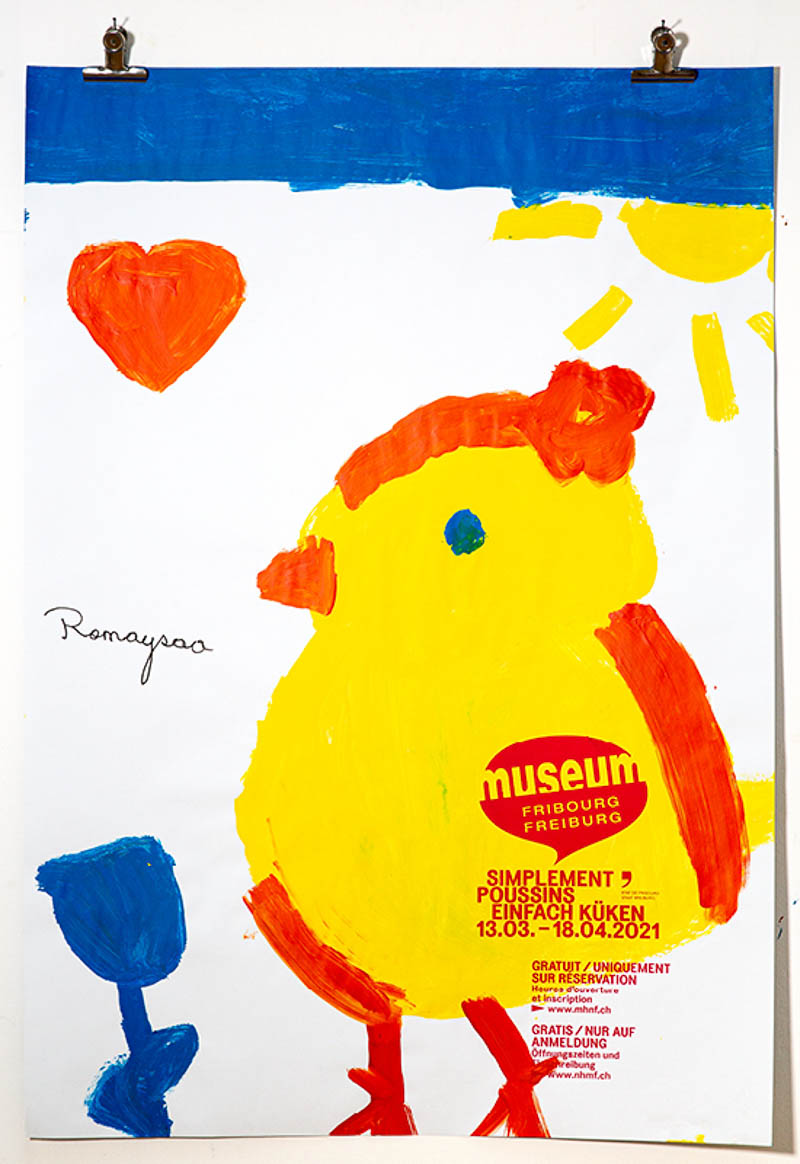 Die Küken sind aber nicht nur im Museum präsent, sondern in der ganzen Stadt Freiburg: Während der Dauer der Ausstellung bringen von Schulkindern gemalte Plakate mit Kükenmotiven Farbe in die Strassen der Stadt. Über 80 Schülerinnen und Schüler aus fünf Primarschulklassen der Stadt Freiburg haben insgesamt rund 120 Plakate gestaltet. Jedes ist ein Unikat: Alle Werke wurden im Atelier des Grafikers René Walker von Hand gemalt und im Siebdruckverfahren hergestellt. Die Plakate sind bis Ende der Ausstellung in drei Etappen zu sehen. Wer will, kann die Plakate mit diesem Stadtplan auf einem Spaziergang entdecken.