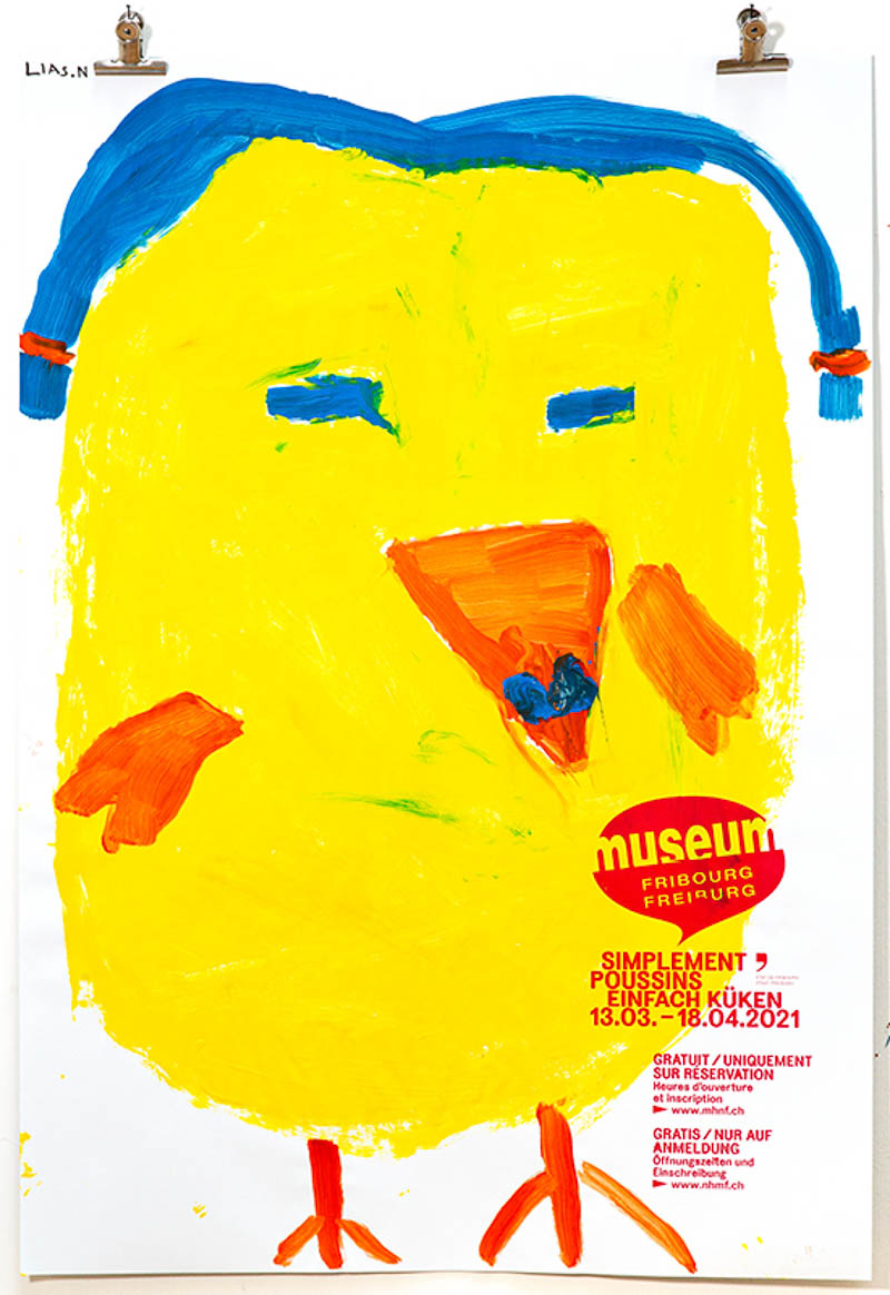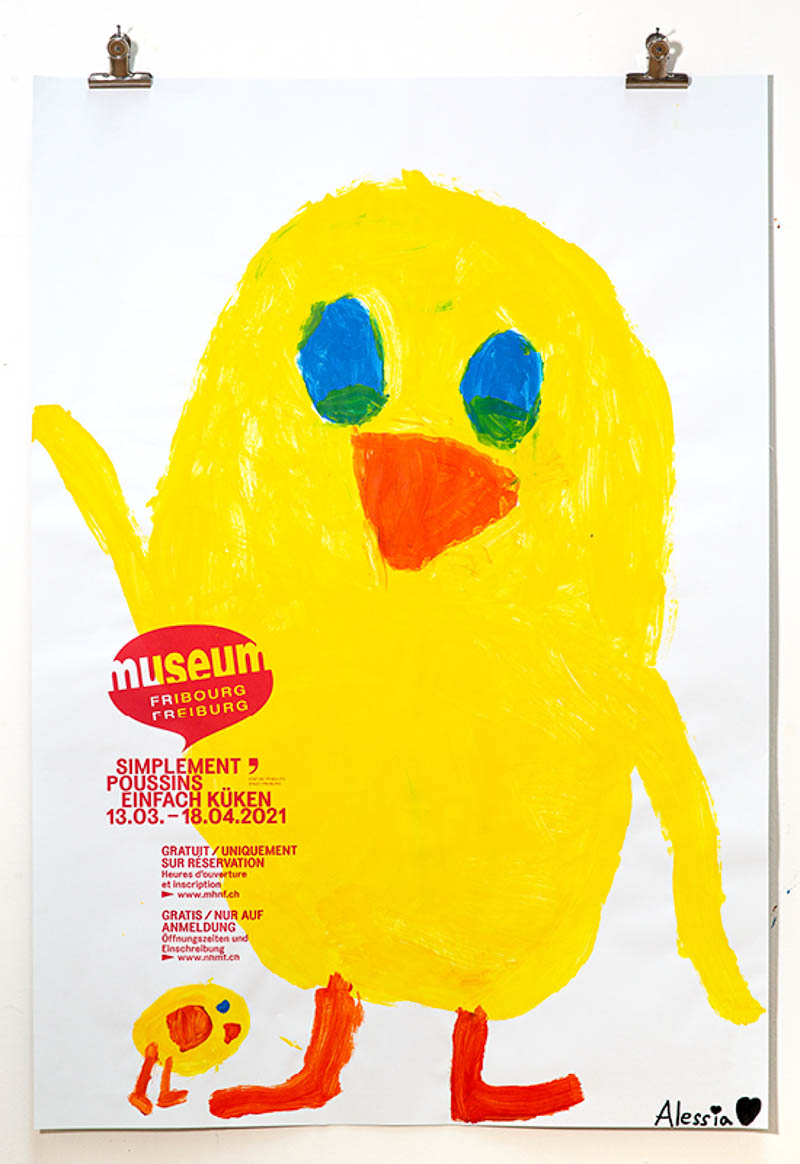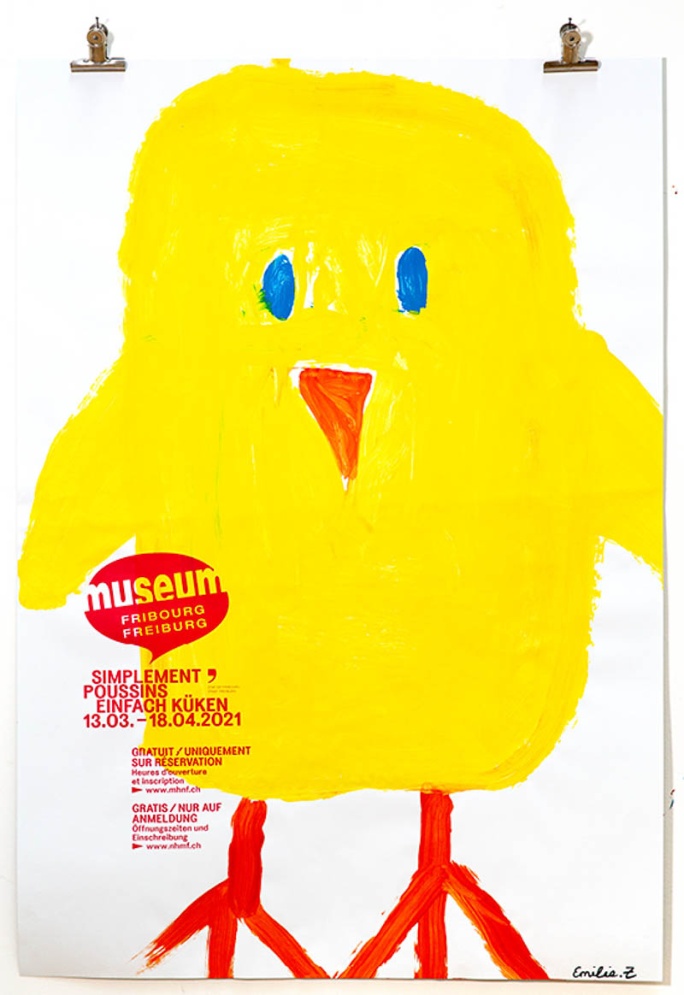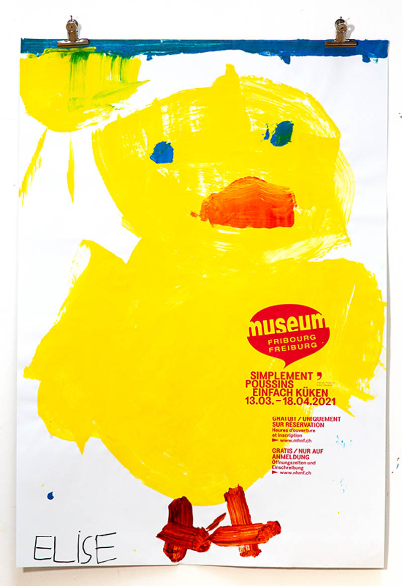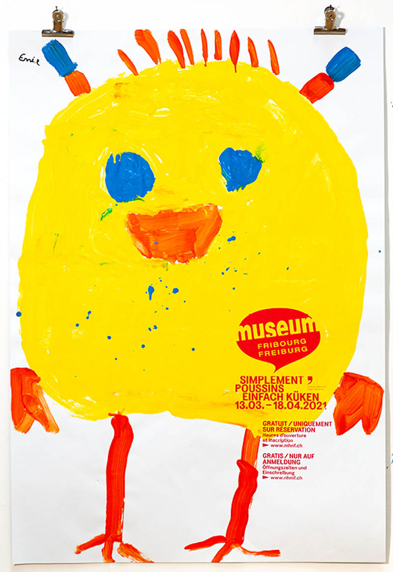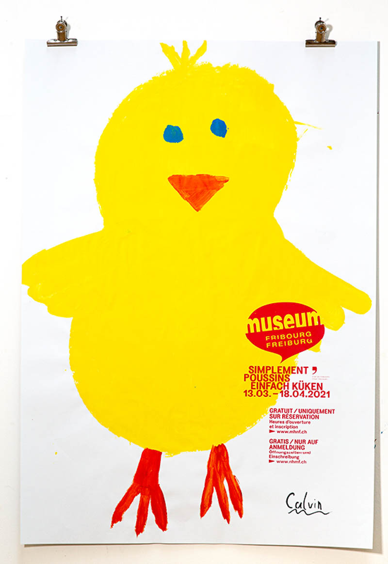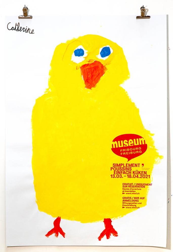 Die Küken sind aber nicht nur im Museum präsent, sondern in der ganzen Stadt Freiburg: Während der Dauer der Ausstellung bringen von Schulkindern gemalte Plakate mit Kükenmotiven Farbe in die Strassen der Stadt. Über 80 Schülerinnen und Schüler aus fünf Primarschulklassen der Stadt Freiburg haben insgesamt rund 120 Plakate gestaltet. Jedes ist ein Unikat: Alle Werke wurden im Atelier des Grafikers René Walker von Hand gemalt und im Siebdruckverfahren hergestellt. Die Plakate sind bis Ende der Ausstellung in drei Etappen zu sehen. Wer will, kann die Plakate mit diesem Stadtplan auf einem Spaziergang entdecken.