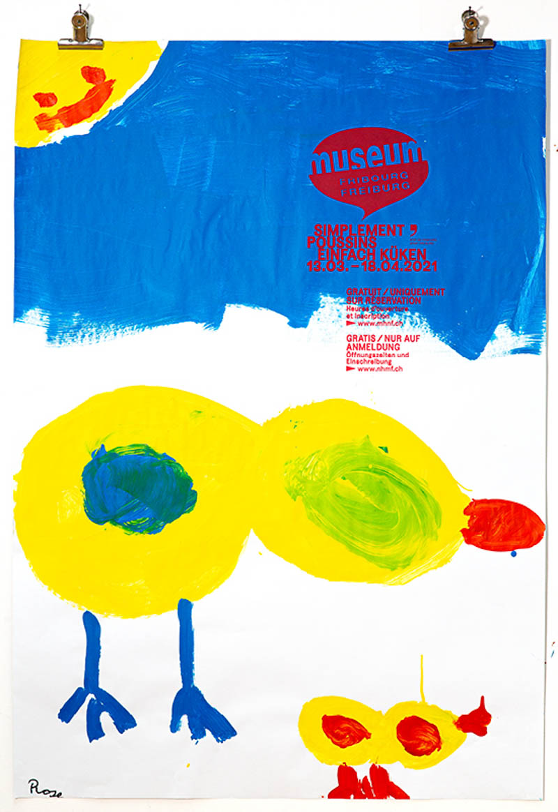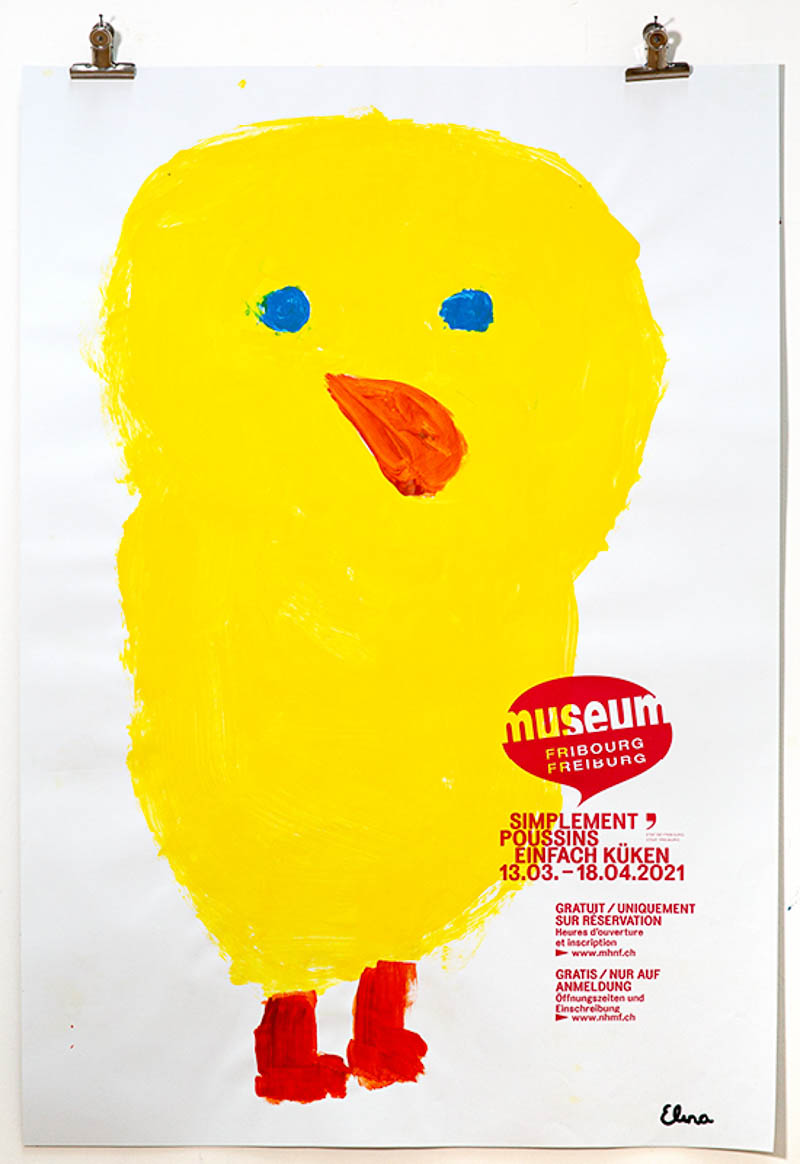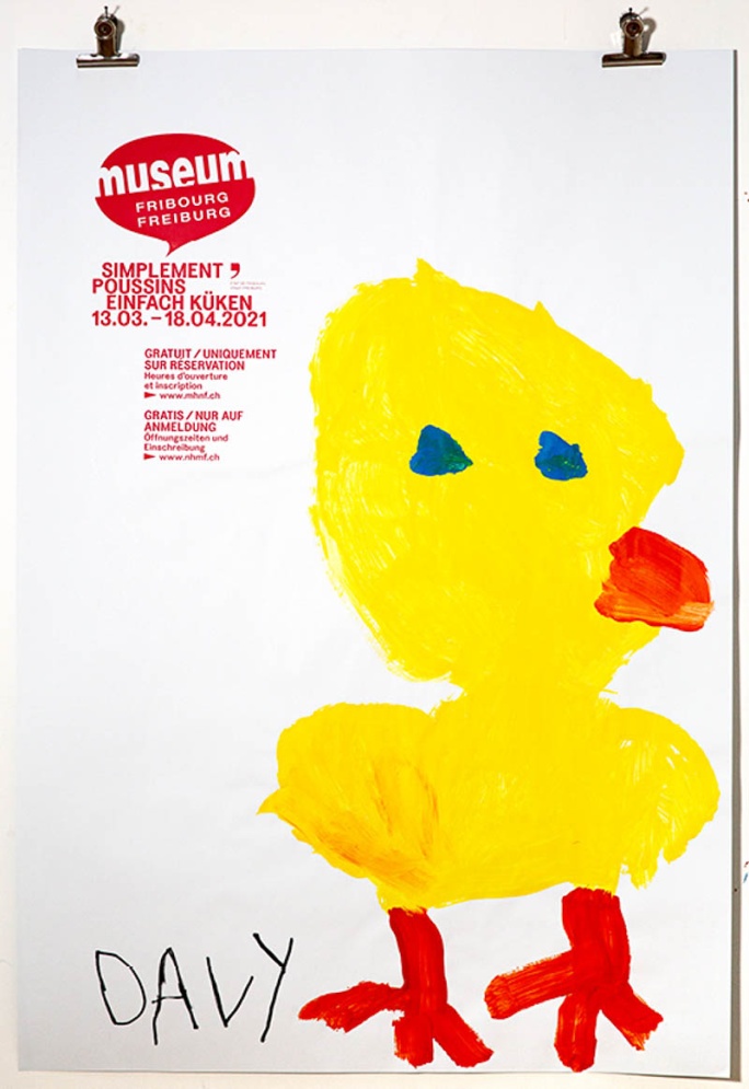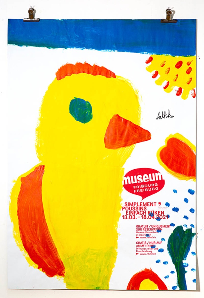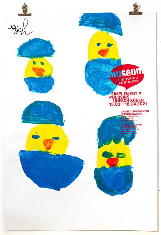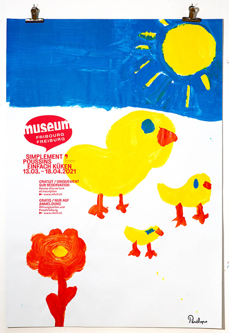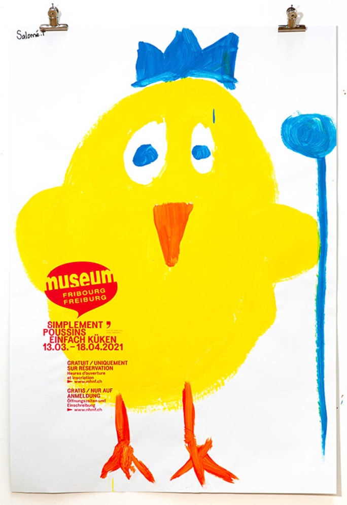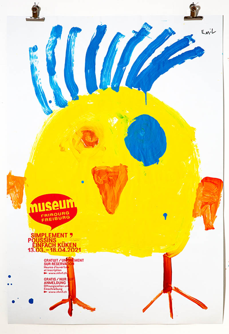 Die Küken sind aber nicht nur im Museum präsent, sondern in der ganzen Stadt Freiburg: Während der Dauer der Ausstellung bringen von Schulkindern gemalte Plakate mit Kükenmotiven Farbe in die Strassen der Stadt. Über 80 Schülerinnen und Schüler aus fünf Primarschulklassen der Stadt Freiburg haben insgesamt rund 120 Plakate gestaltet. Jedes ist ein Unikat: Alle Werke wurden im Atelier des Grafikers René Walker von Hand gemalt und im Siebdruckverfahren hergestellt. Die Plakate sind bis Ende der Ausstellung in drei Etappen zu sehen. Wer will, kann die Plakate mit diesem Stadtplan auf einem Spaziergang entdecken.