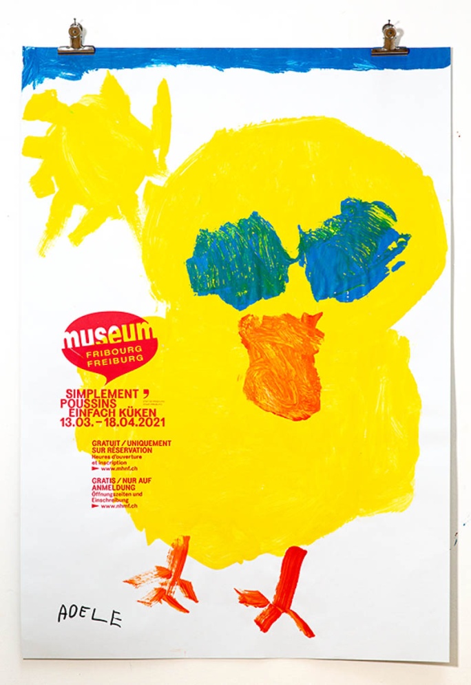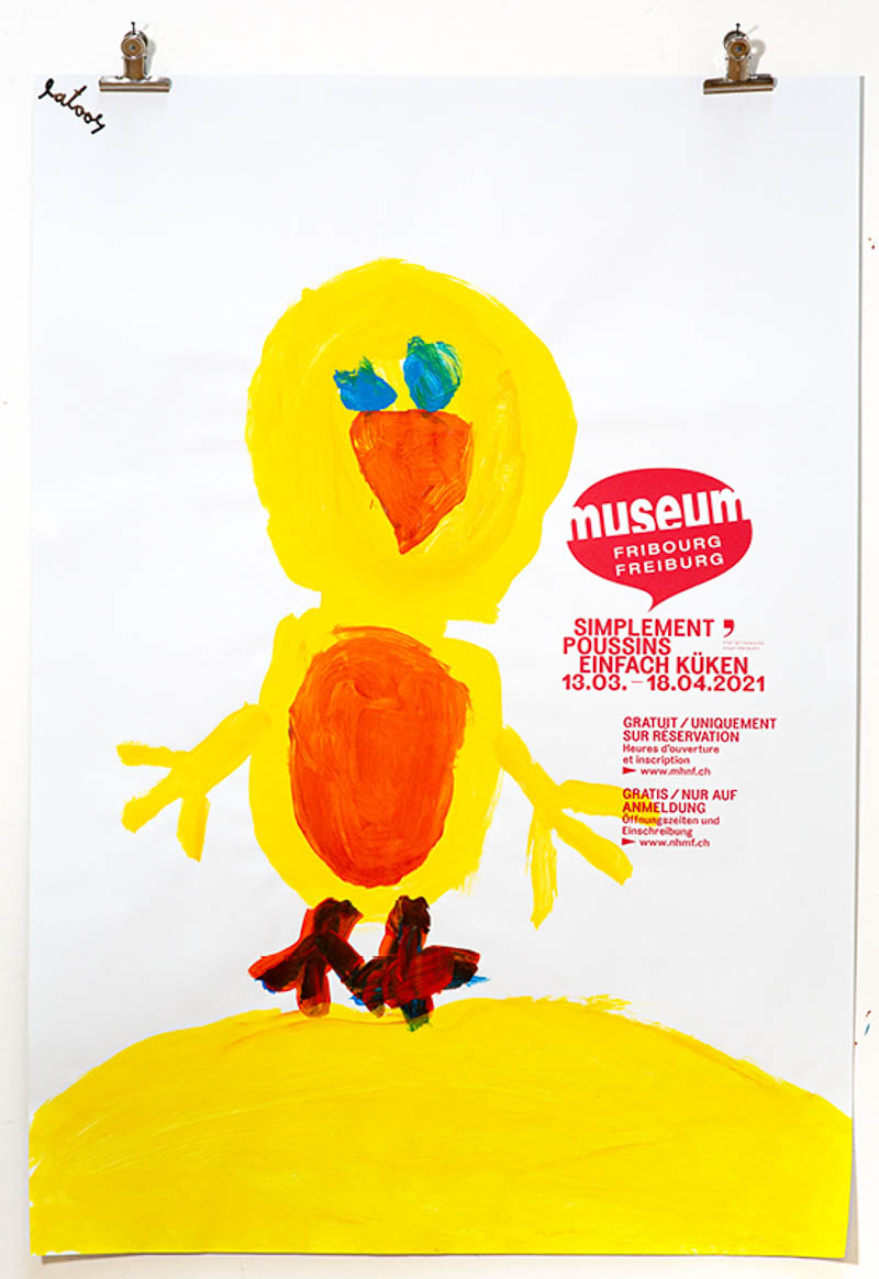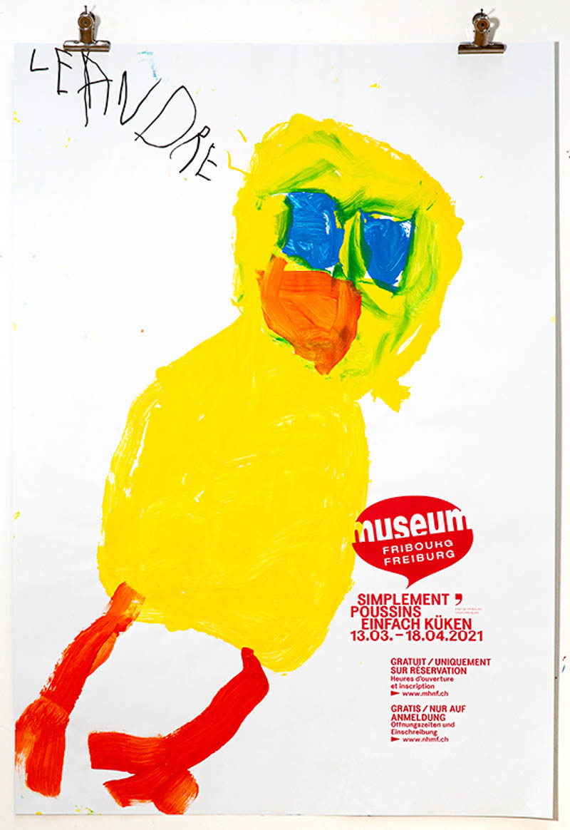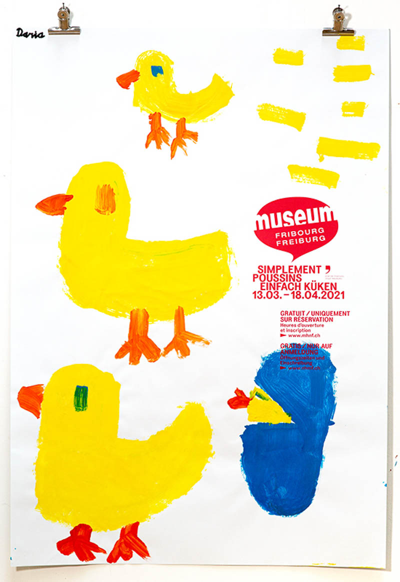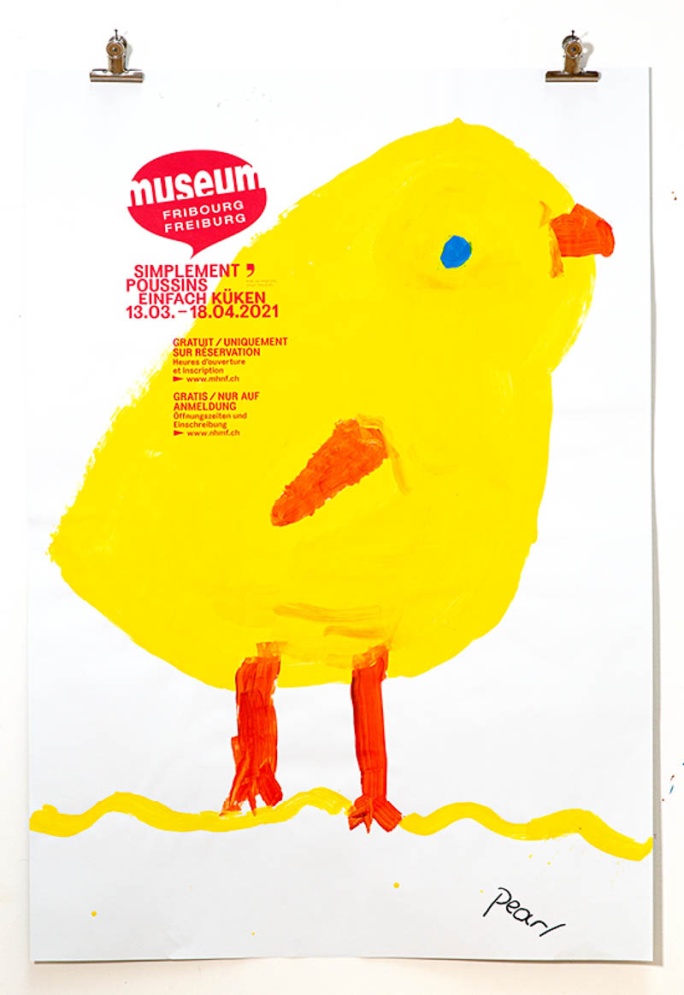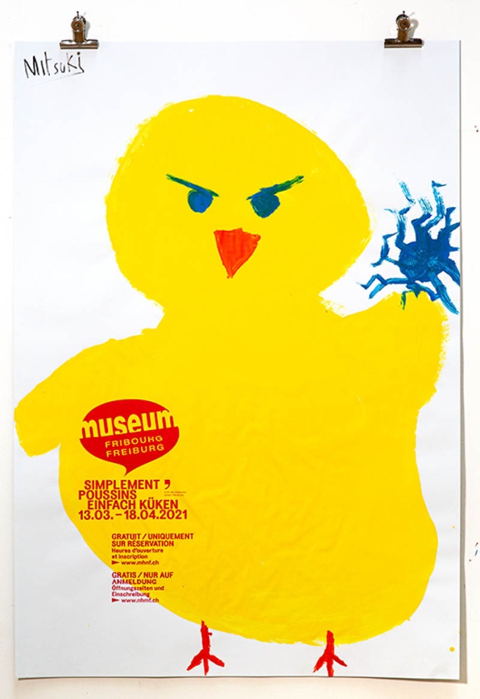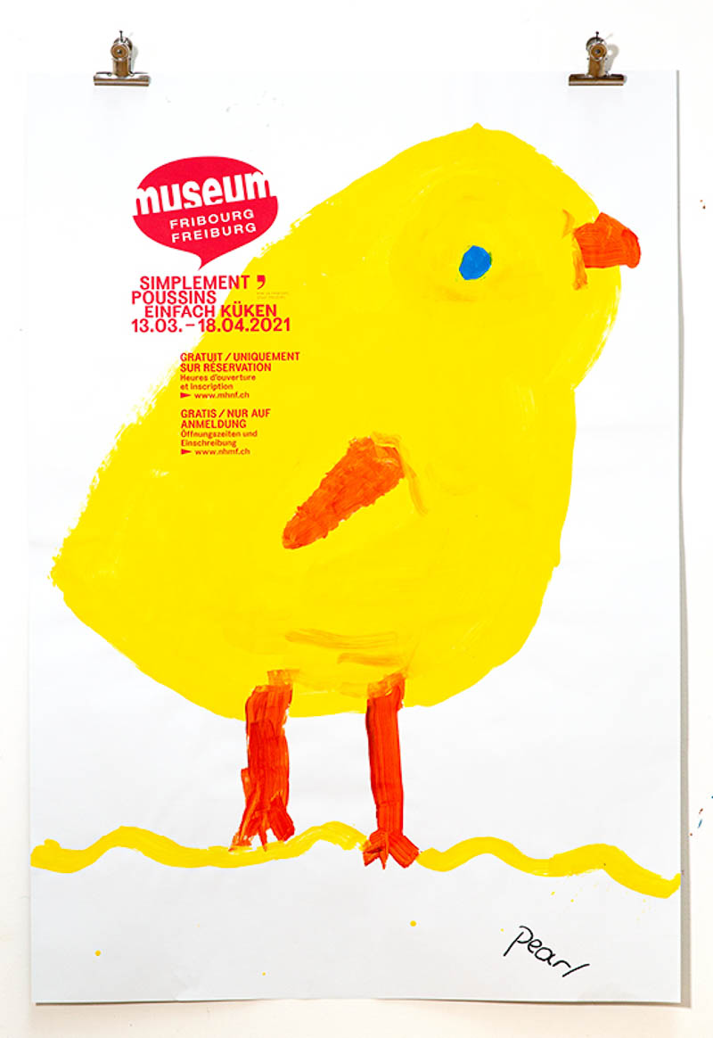 Die Küken sind aber nicht nur im Museum präsent, sondern in der ganzen Stadt Freiburg: Während der Dauer der Ausstellung bringen von Schulkindern gemalte Plakate mit Kükenmotiven Farbe in die Strassen der Stadt. Über 80 Schülerinnen und Schüler aus fünf Primarschulklassen der Stadt Freiburg haben insgesamt rund 120 Plakate gestaltet. Jedes ist ein Unikat: Alle Werke wurden im Atelier des Grafikers René Walker von Hand gemalt und im Siebdruckverfahren hergestellt. Die Plakate sind bis Ende der Ausstellung in drei Etappen zu sehen. Wer will, kann die Plakate mit diesem Stadtplan auf einem Spaziergang entdecken.