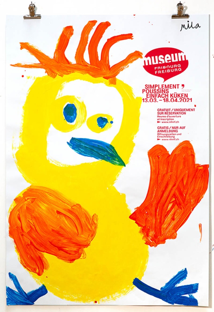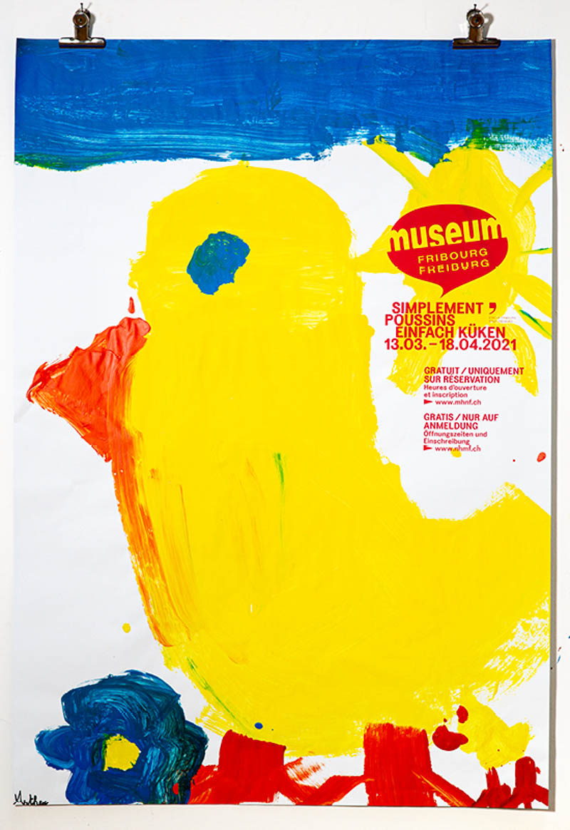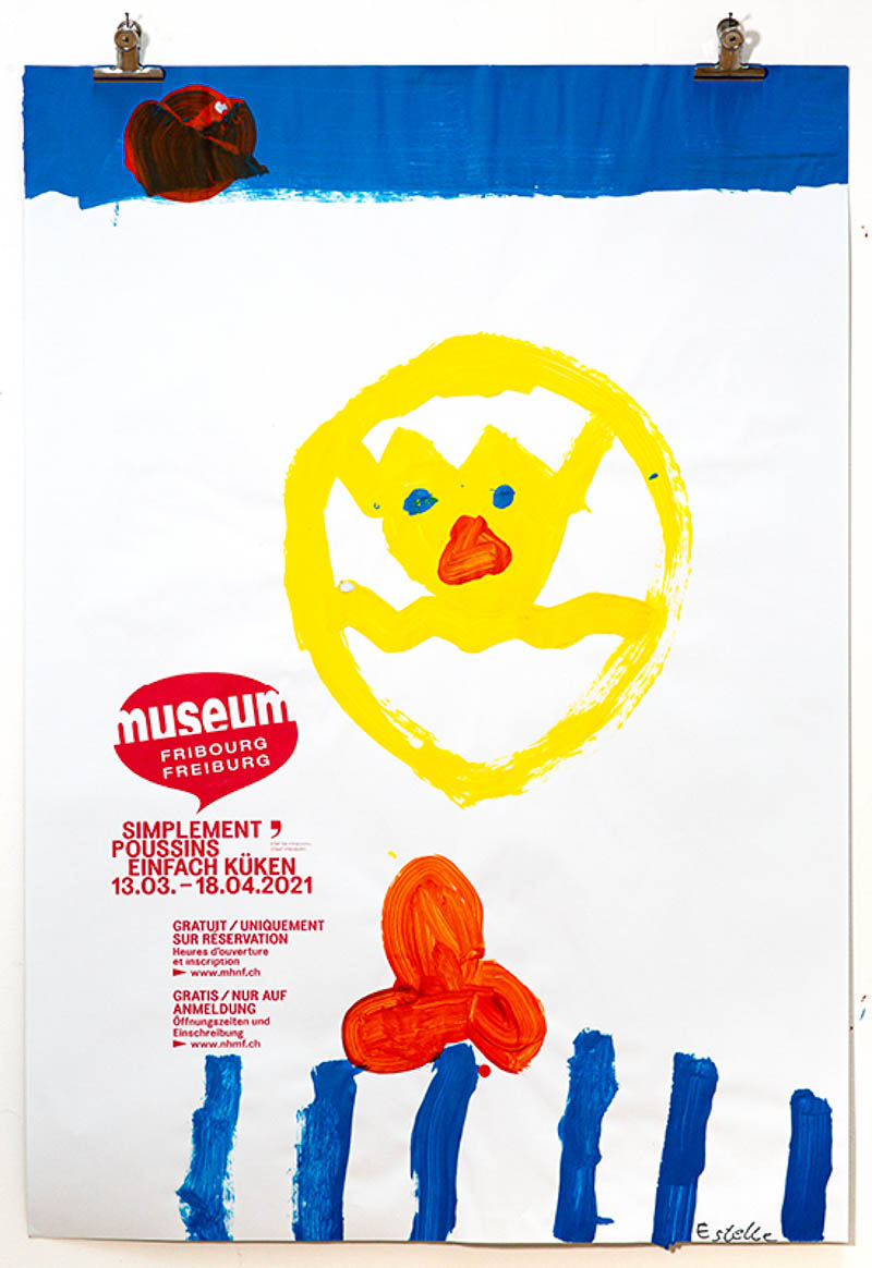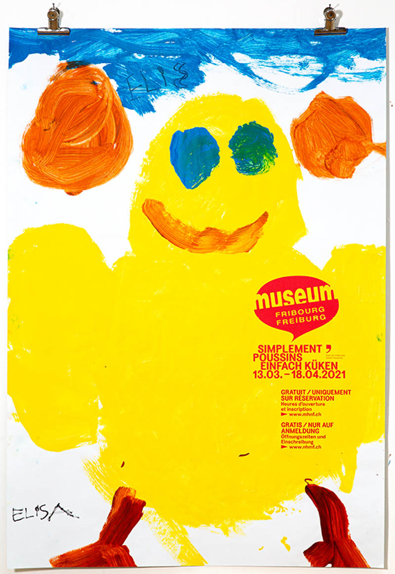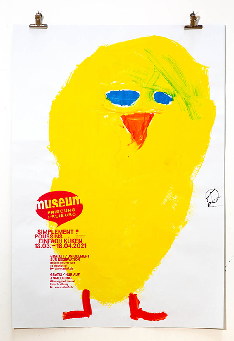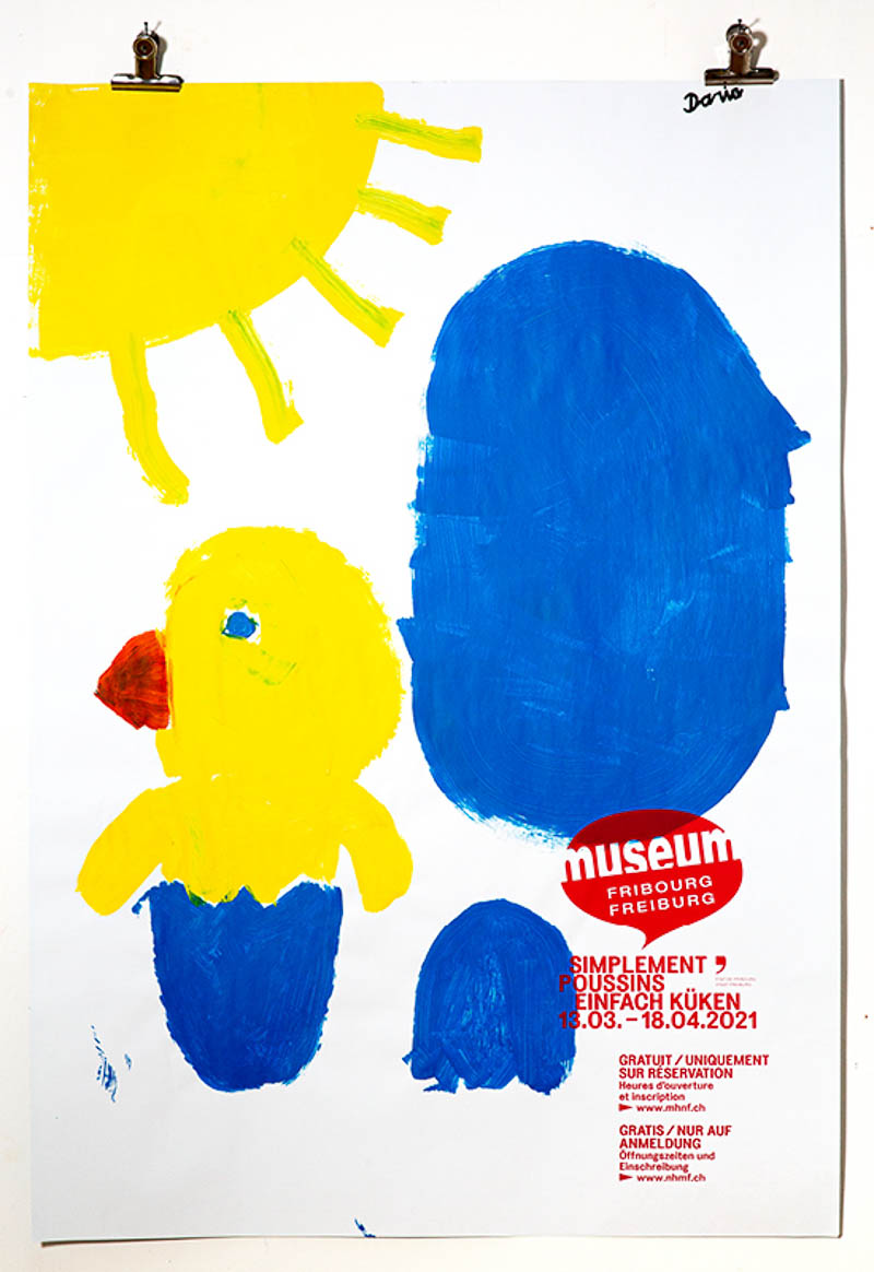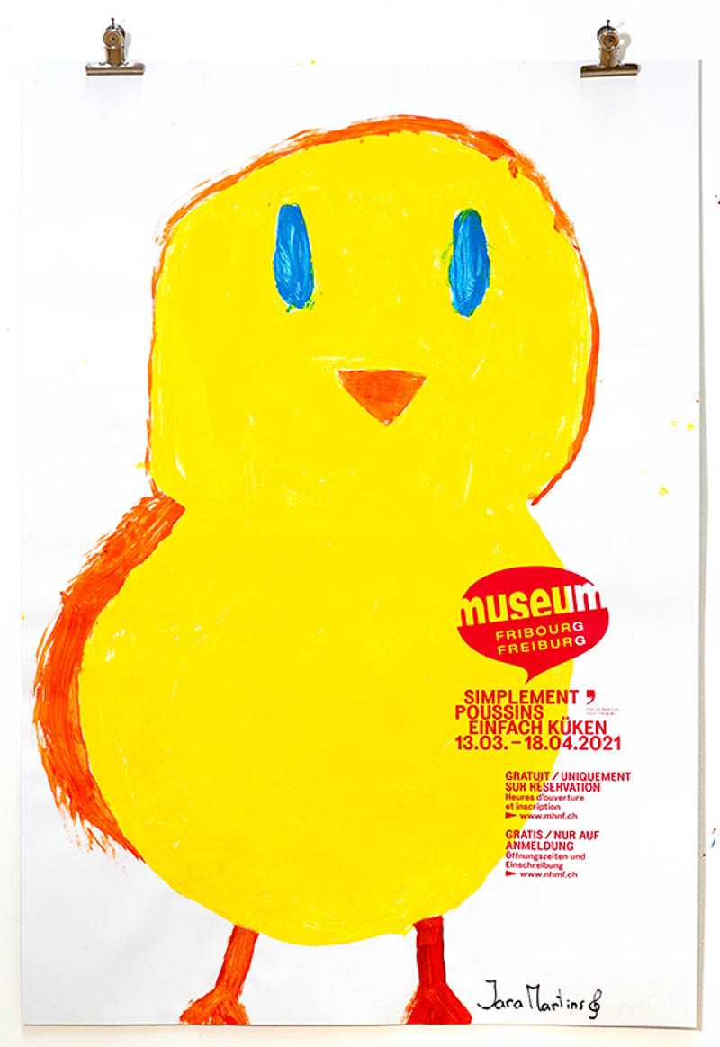 Die Küken sind aber nicht nur im Museum präsent, sondern in der ganzen Stadt Freiburg: Während der Dauer der Ausstellung bringen von Schulkindern gemalte Plakate mit Kükenmotiven Farbe in die Strassen der Stadt. Über 80 Schülerinnen und Schüler aus fünf Primarschulklassen der Stadt Freiburg haben insgesamt rund 120 Plakate gestaltet. Jedes ist ein Unikat: Alle Werke wurden im Atelier des Grafikers René Walker von Hand gemalt und im Siebdruckverfahren hergestellt. Die Plakate sind bis Ende der Ausstellung in drei Etappen zu sehen. Wer will, kann die Plakate mit diesem Stadtplan auf einem Spaziergang entdecken.