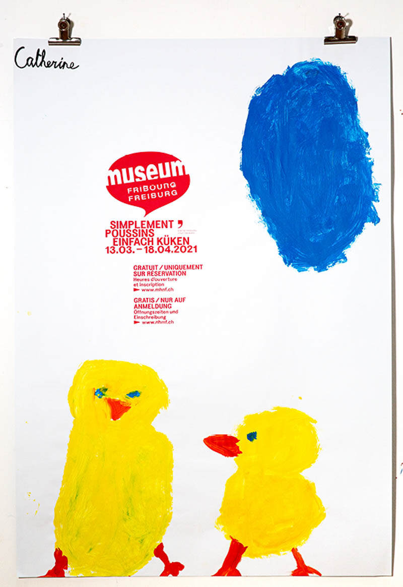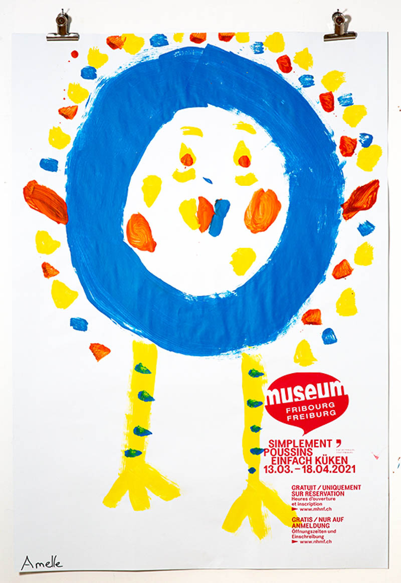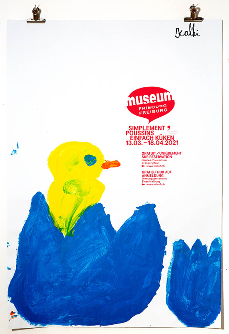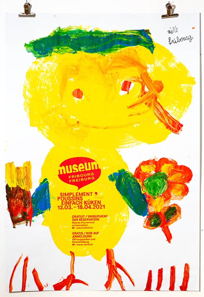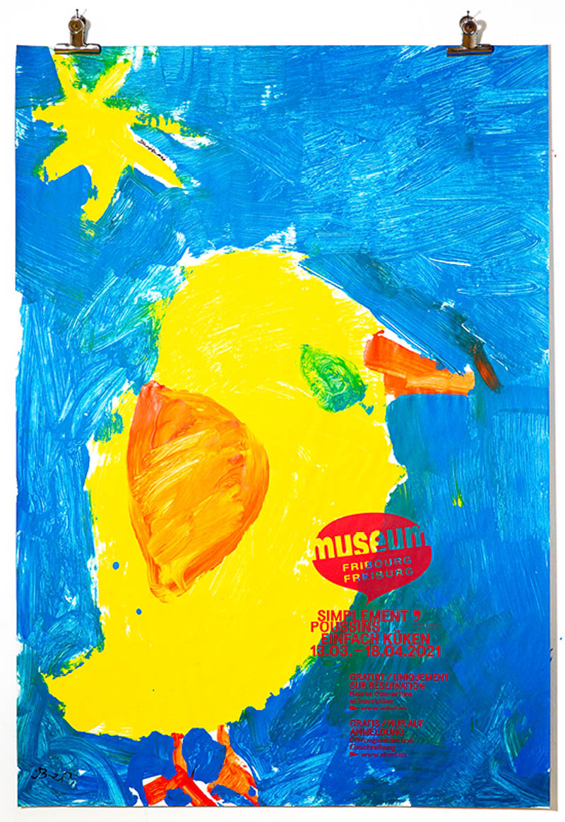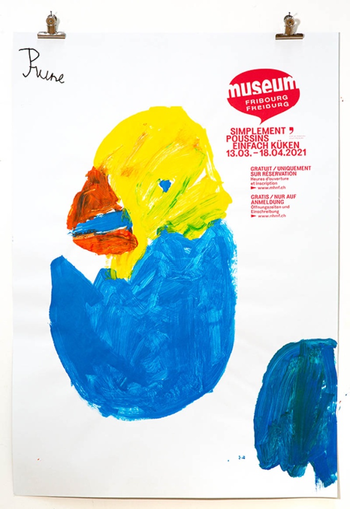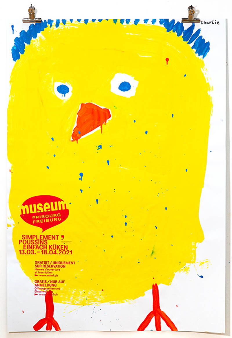 Die Küken sind aber nicht nur im Museum präsent, sondern in der ganzen Stadt Freiburg: Während der Dauer der Ausstellung bringen von Schulkindern gemalte Plakate mit Kükenmotiven Farbe in die Strassen der Stadt. Über 80 Schülerinnen und Schüler aus fünf Primarschulklassen der Stadt Freiburg haben insgesamt rund 120 Plakate gestaltet. Jedes ist ein Unikat: Alle Werke wurden im Atelier des Grafikers René Walker von Hand gemalt und im Siebdruckverfahren hergestellt. Die Plakate sind bis Ende der Ausstellung in drei Etappen zu sehen. Wer will, kann die Plakate mit diesem Stadtplan auf einem Spaziergang entdecken.