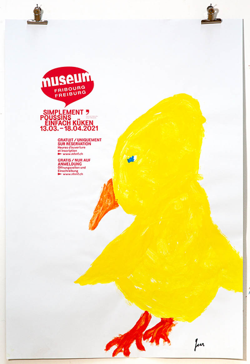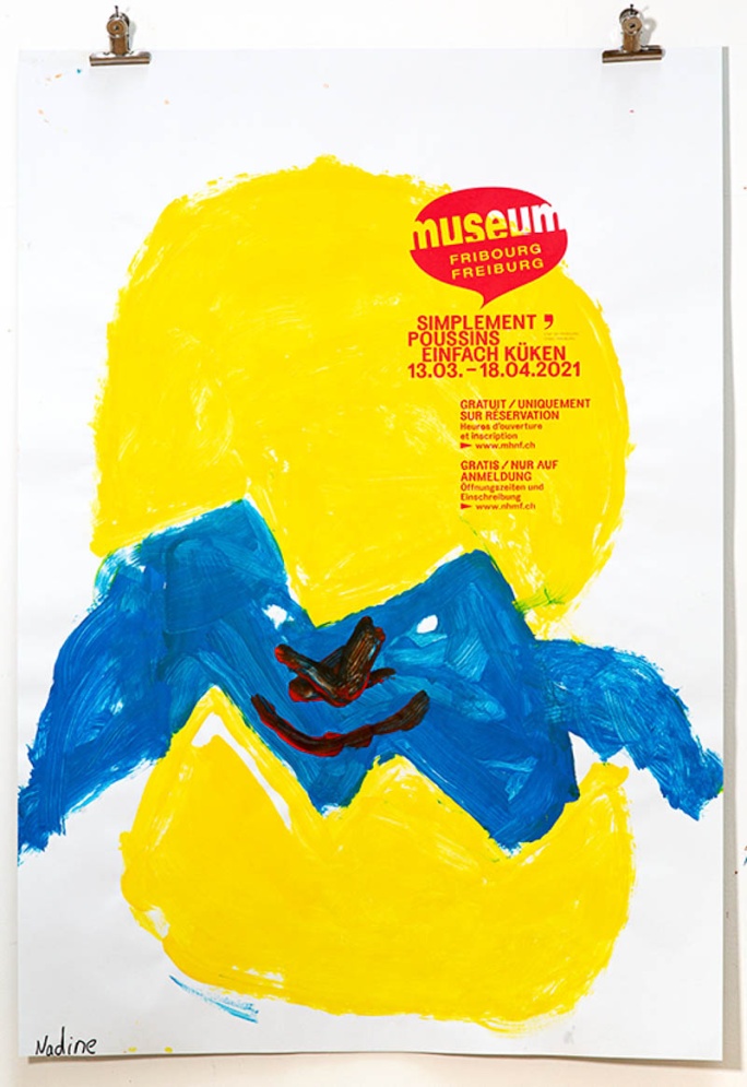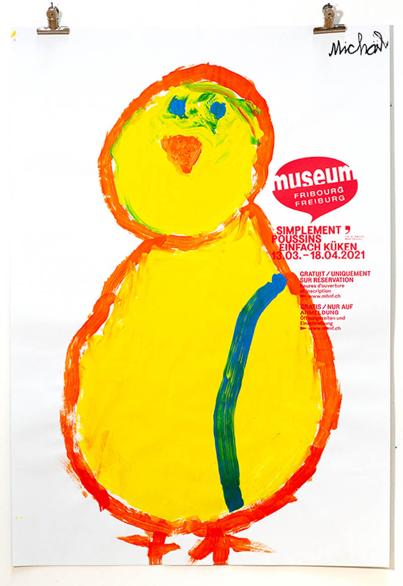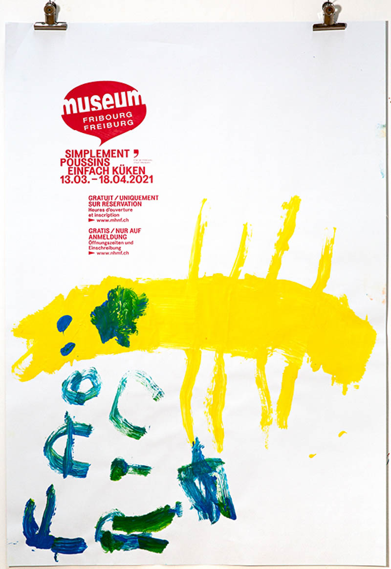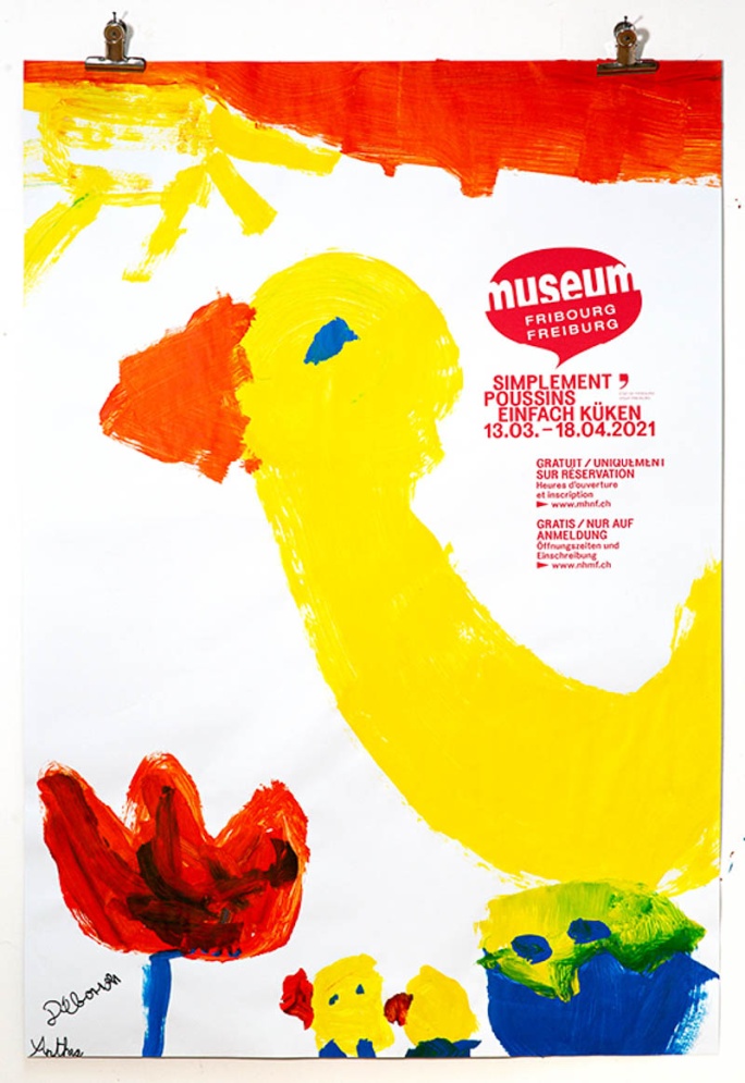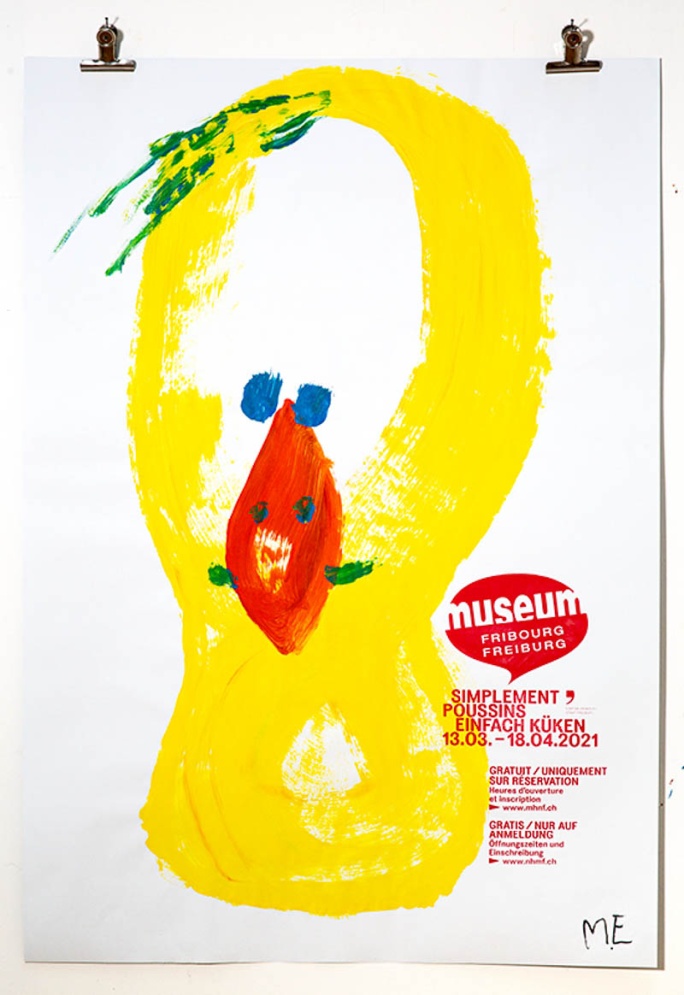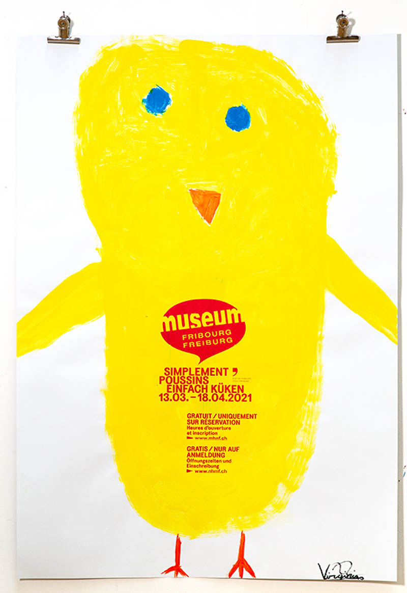 Die Küken sind aber nicht nur im Museum präsent, sondern in der ganzen Stadt Freiburg: Während der Dauer der Ausstellung bringen von Schulkindern gemalte Plakate mit Kükenmotiven Farbe in die Strassen der Stadt. Über 80 Schülerinnen und Schüler aus fünf Primarschulklassen der Stadt Freiburg haben insgesamt rund 120 Plakate gestaltet. Jedes ist ein Unikat: Alle Werke wurden im Atelier des Grafikers René Walker von Hand gemalt und im Siebdruckverfahren hergestellt. Die Plakate sind bis Ende der Ausstellung in drei Etappen zu sehen. Wer will, kann die Plakate mit diesem Stadtplan auf einem Spaziergang entdecken.