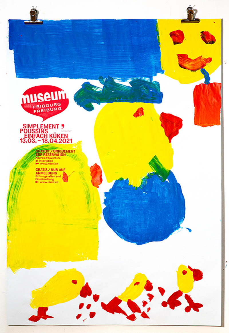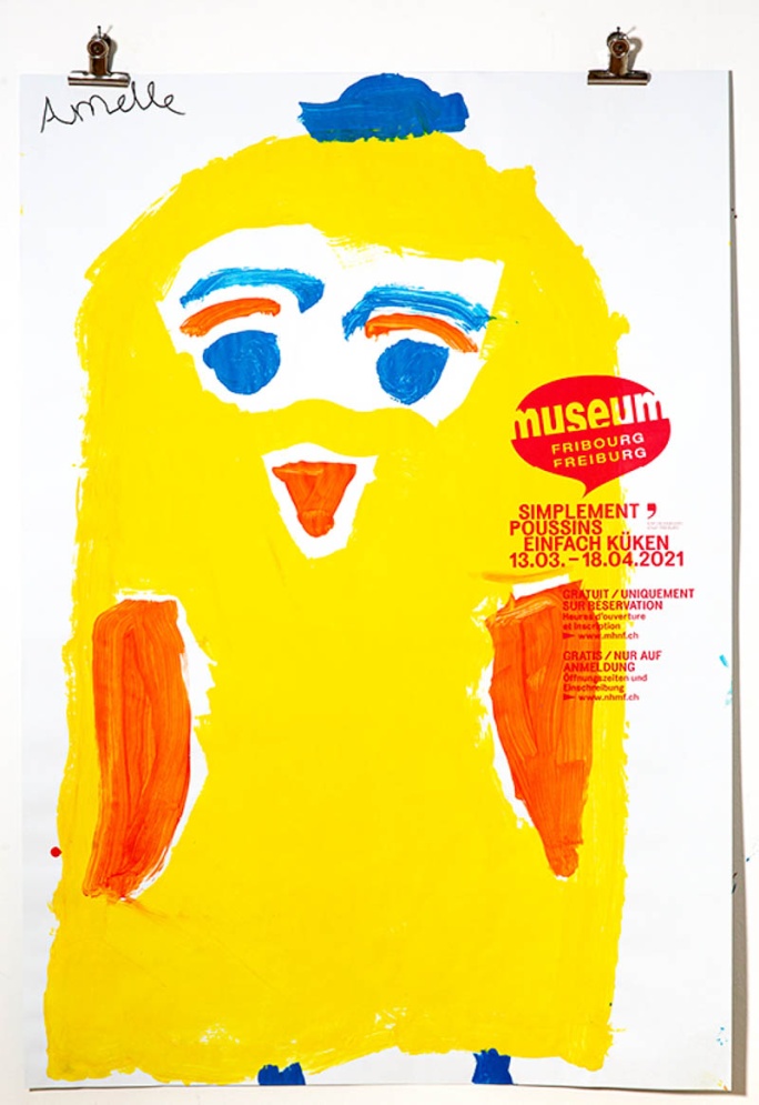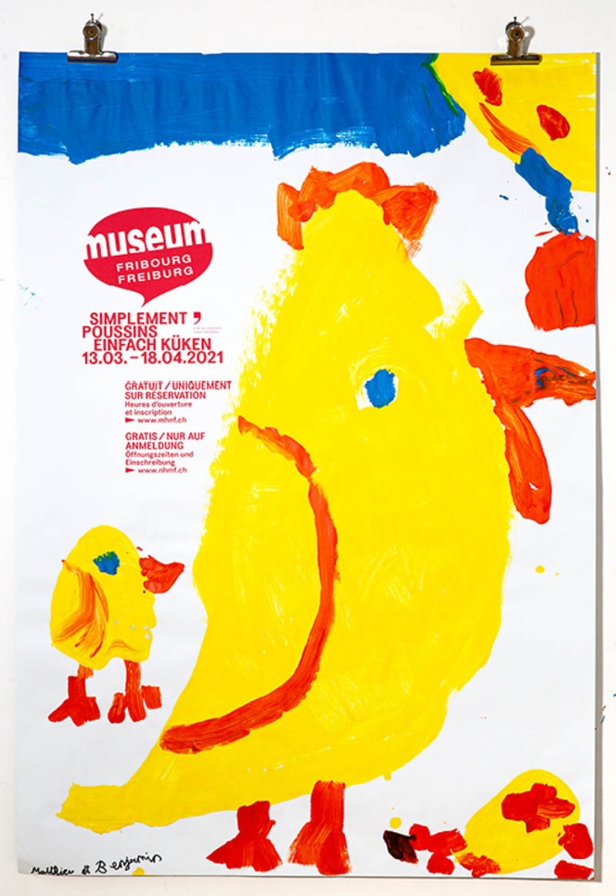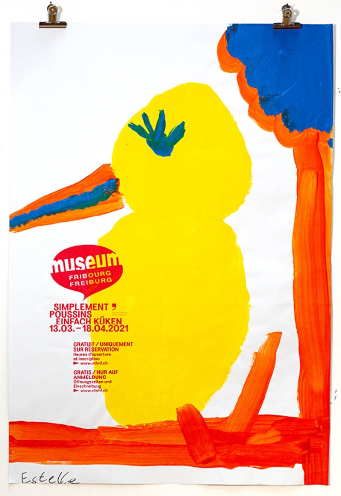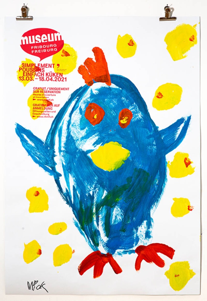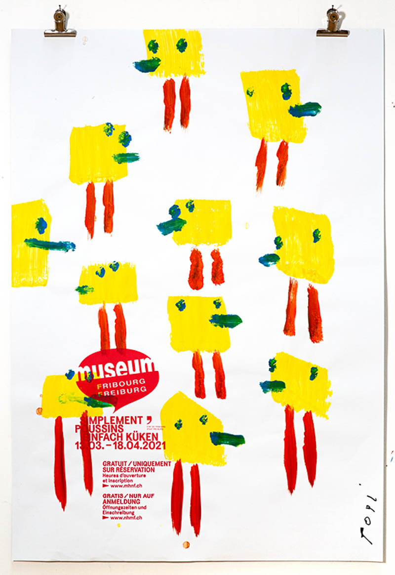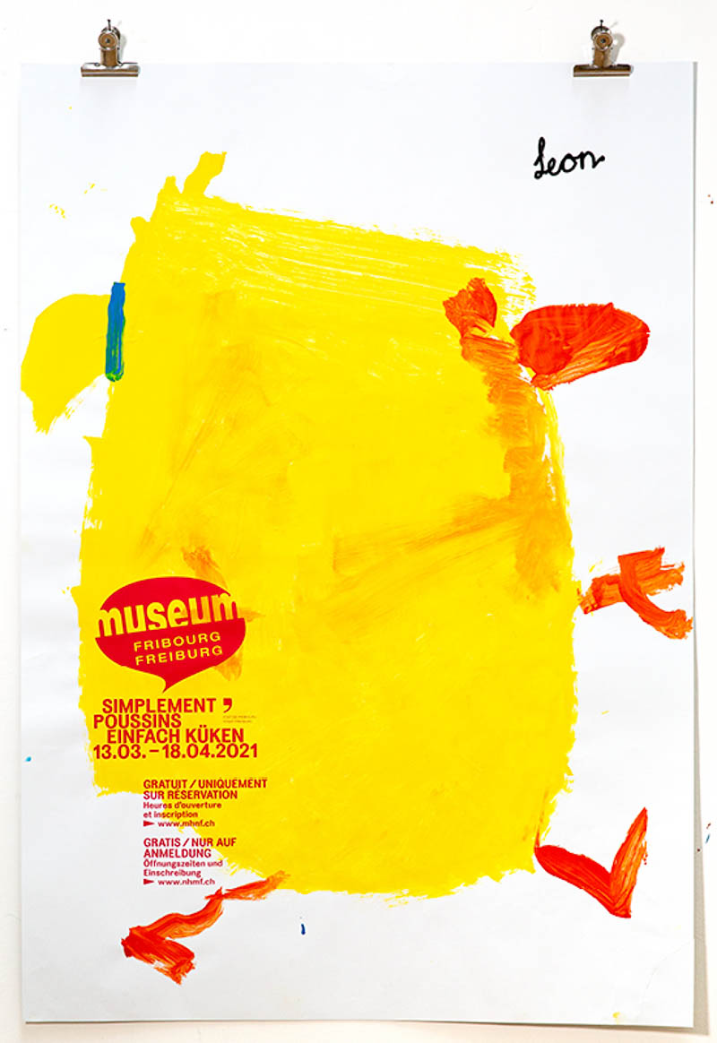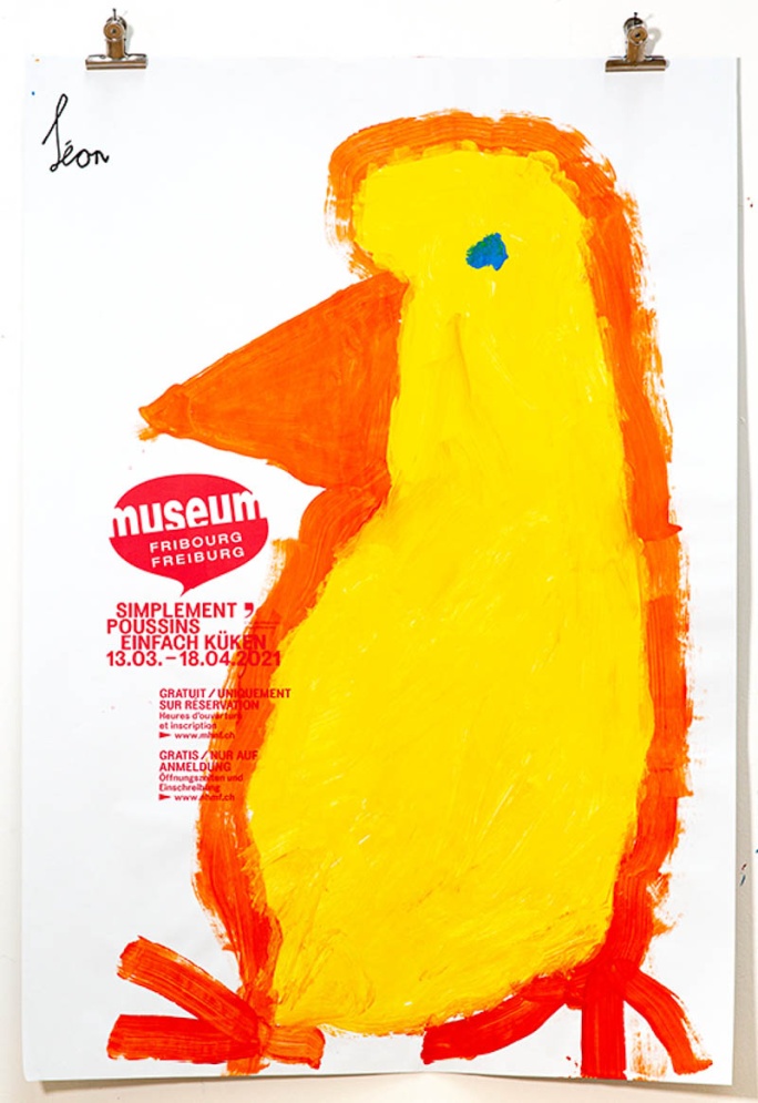 Die Küken sind aber nicht nur im Museum präsent, sondern in der ganzen Stadt Freiburg: Während der Dauer der Ausstellung bringen von Schulkindern gemalte Plakate mit Kükenmotiven Farbe in die Strassen der Stadt. Über 80 Schülerinnen und Schüler aus fünf Primarschulklassen der Stadt Freiburg haben insgesamt rund 120 Plakate gestaltet. Jedes ist ein Unikat: Alle Werke wurden im Atelier des Grafikers René Walker von Hand gemalt und im Siebdruckverfahren hergestellt. Die Plakate sind bis Ende der Ausstellung in drei Etappen zu sehen. Wer will, kann die Plakate mit diesem Stadtplan auf einem Spaziergang entdecken.