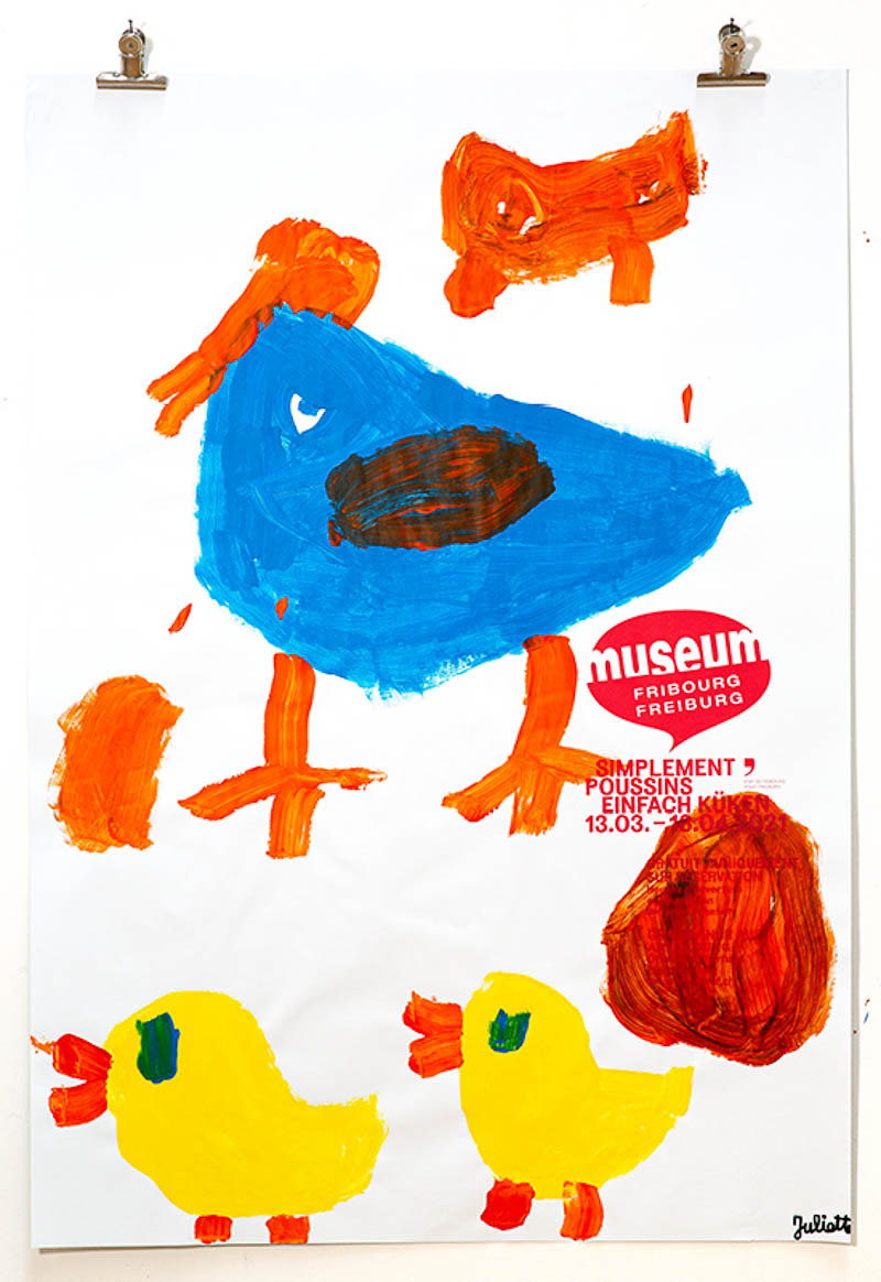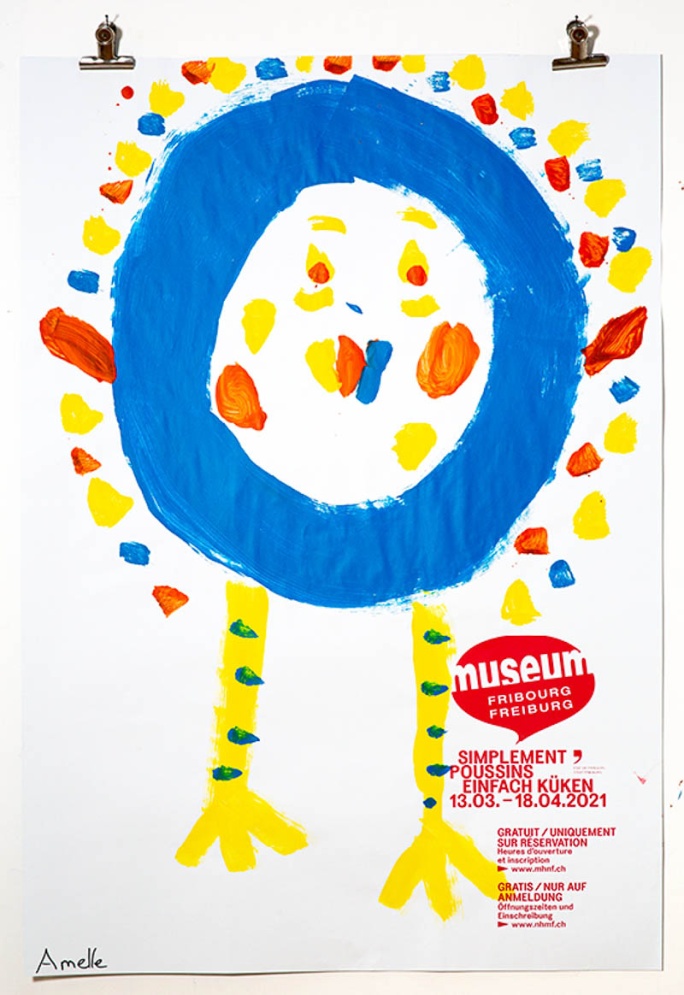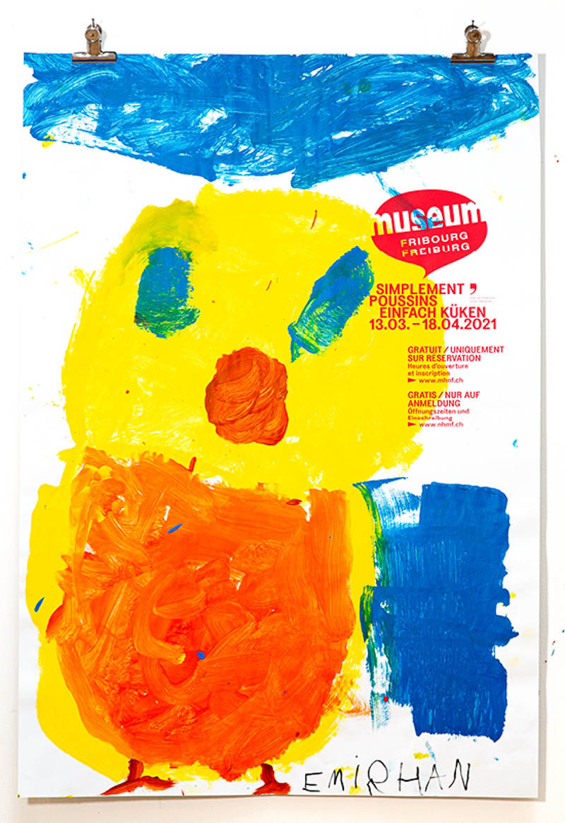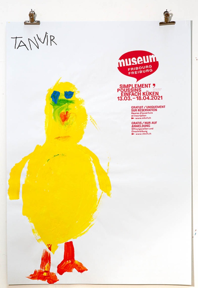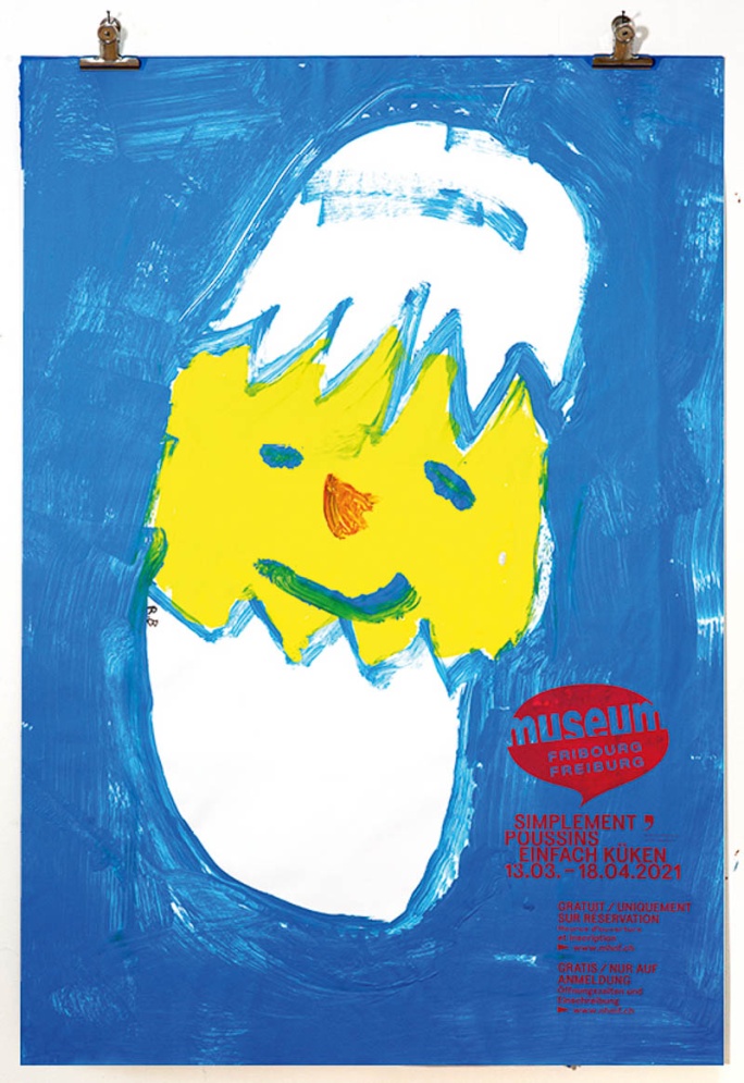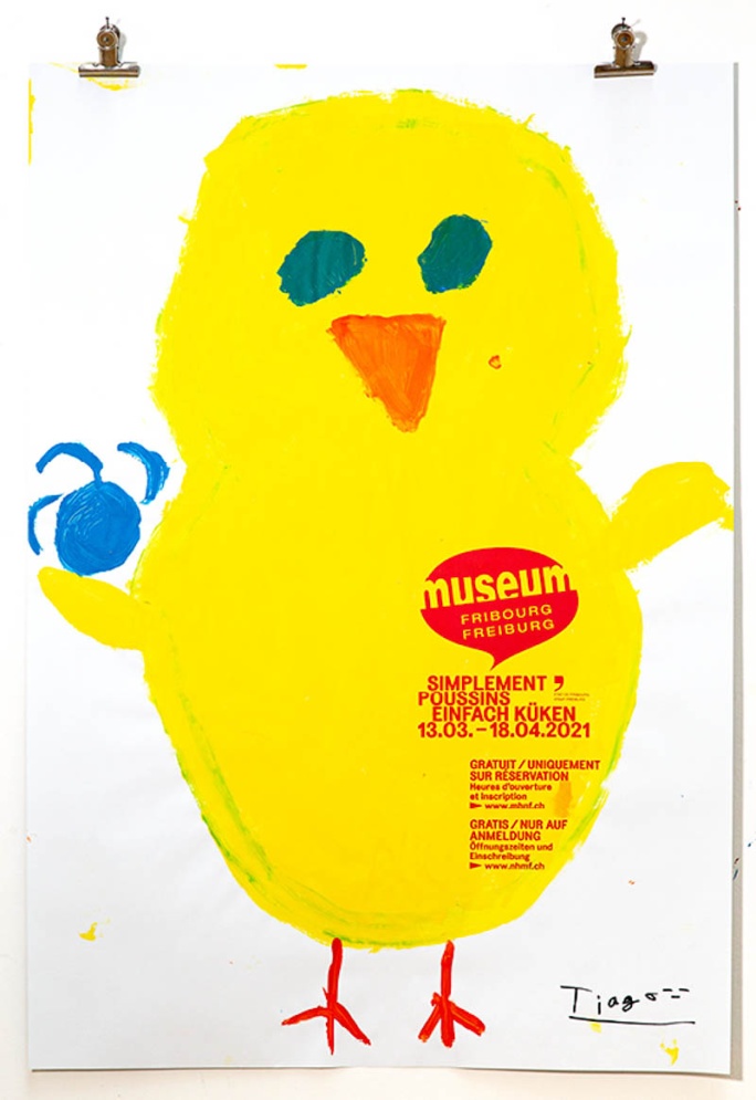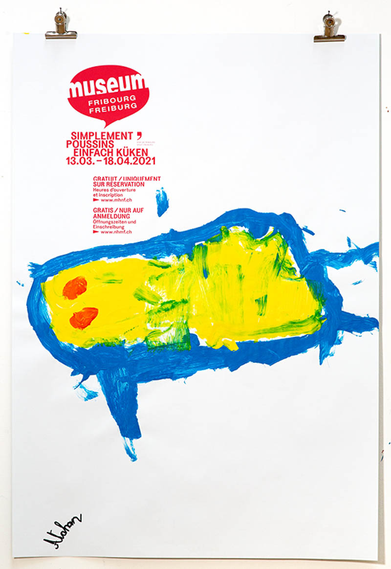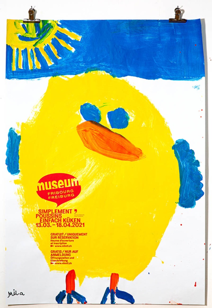 Die Küken sind aber nicht nur im Museum präsent, sondern in der ganzen Stadt Freiburg: Während der Dauer der Ausstellung bringen von Schulkindern gemalte Plakate mit Kükenmotiven Farbe in die Strassen der Stadt. Über 80 Schülerinnen und Schüler aus fünf Primarschulklassen der Stadt Freiburg haben insgesamt rund 120 Plakate gestaltet. Jedes ist ein Unikat: Alle Werke wurden im Atelier des Grafikers René Walker von Hand gemalt und im Siebdruckverfahren hergestellt. Die Plakate sind bis Ende der Ausstellung in drei Etappen zu sehen. Wer will, kann die Plakate mit diesem Stadtplan auf einem Spaziergang entdecken.