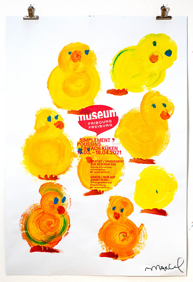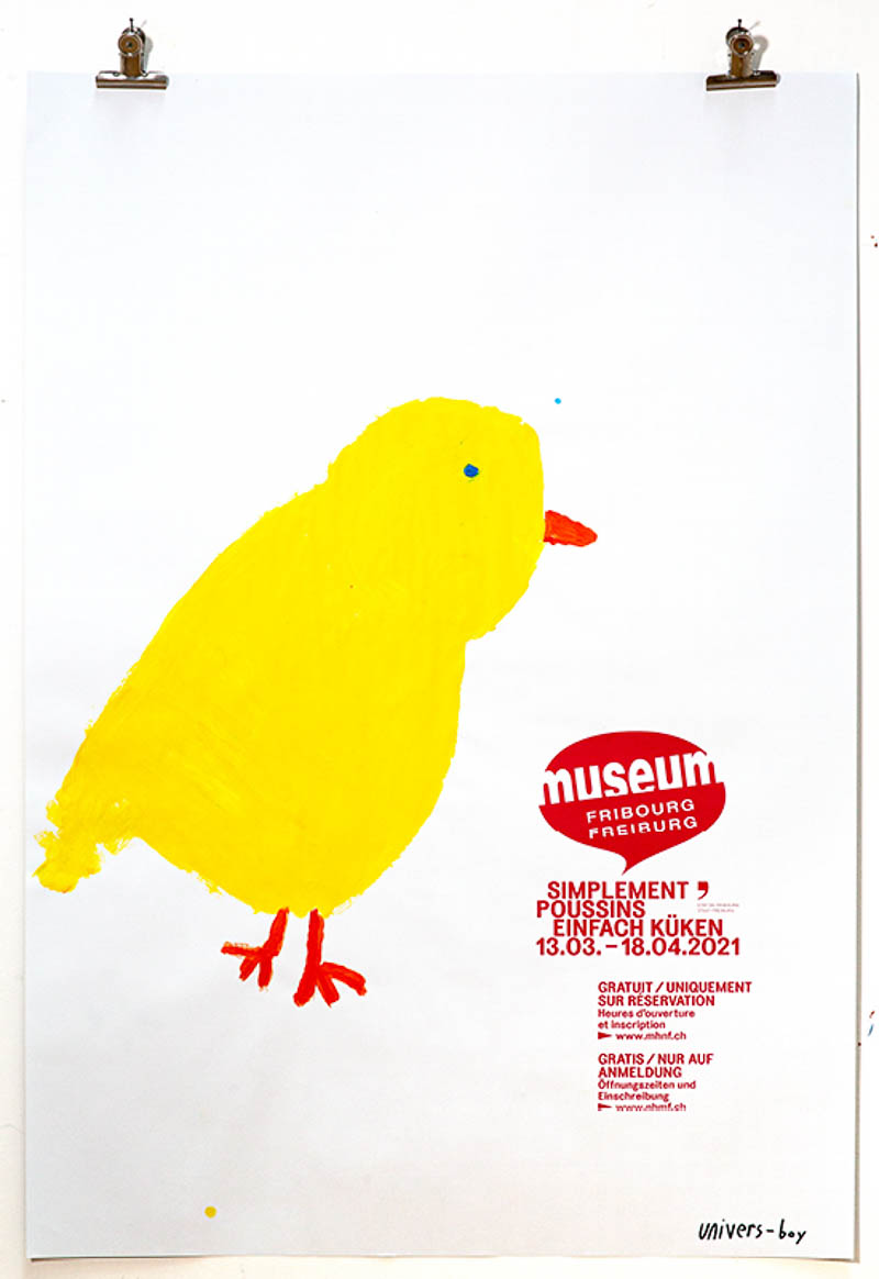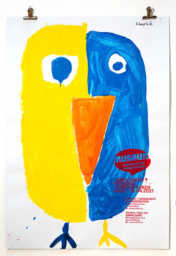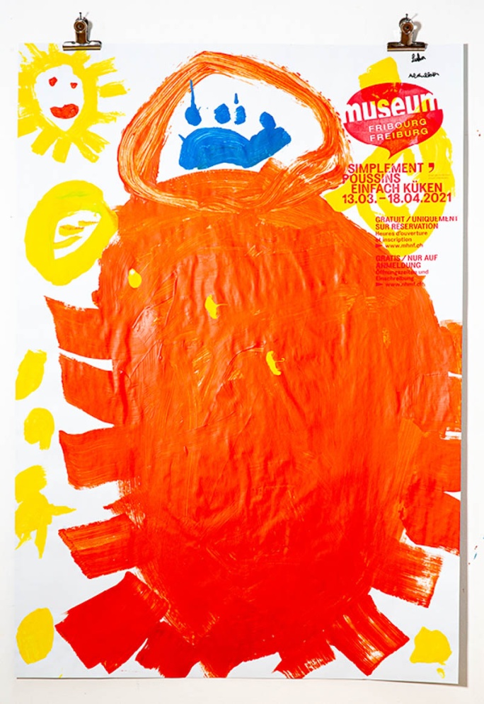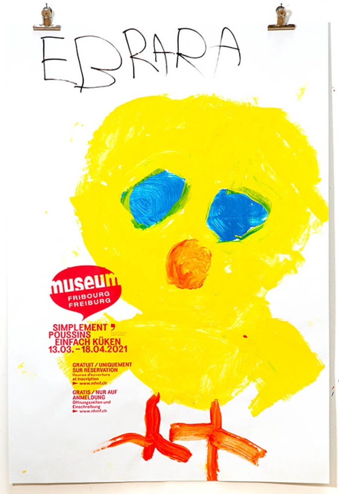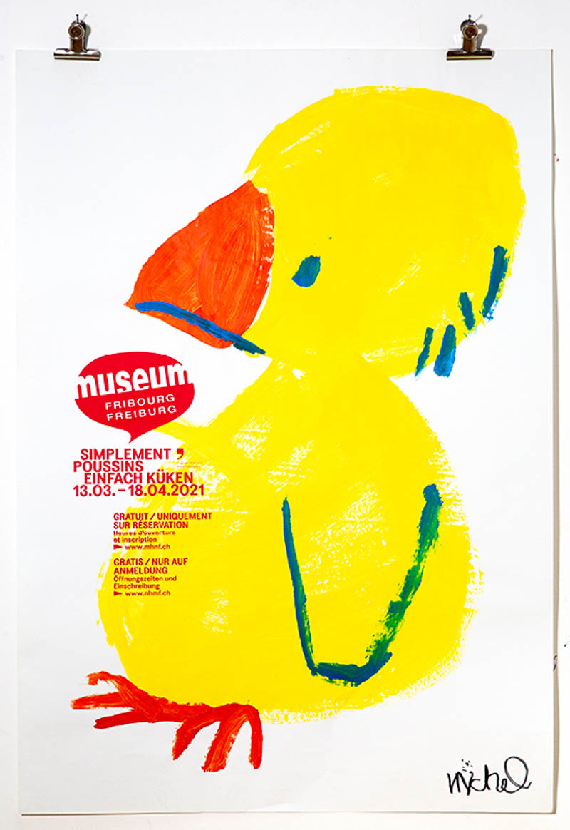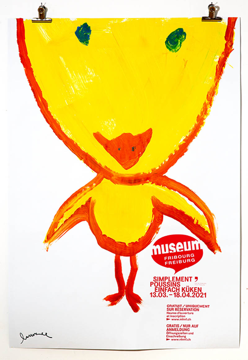Die Küken sind aber nicht nur im Museum präsent, sondern in der ganzen Stadt Freiburg: Während der Dauer der Ausstellung bringen von Schulkindern gemalte Plakate mit Kükenmotiven Farbe in die Strassen der Stadt. Über 80 Schülerinnen und Schüler aus fünf Primarschulklassen der Stadt Freiburg haben insgesamt rund 120 Plakate gestaltet. Jedes ist ein Unikat: Alle Werke wurden im Atelier des Grafikers René Walker von Hand gemalt und im Siebdruckverfahren hergestellt. Die Plakate sind bis Ende der Ausstellung in drei Etappen zu sehen. Wer will, kann die Plakate mit diesem Stadtplan auf einem Spaziergang entdecken.