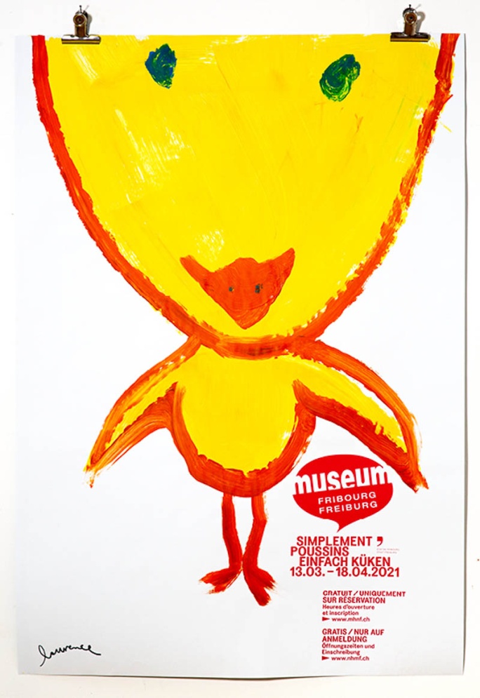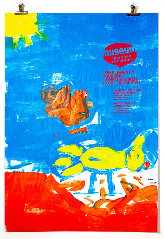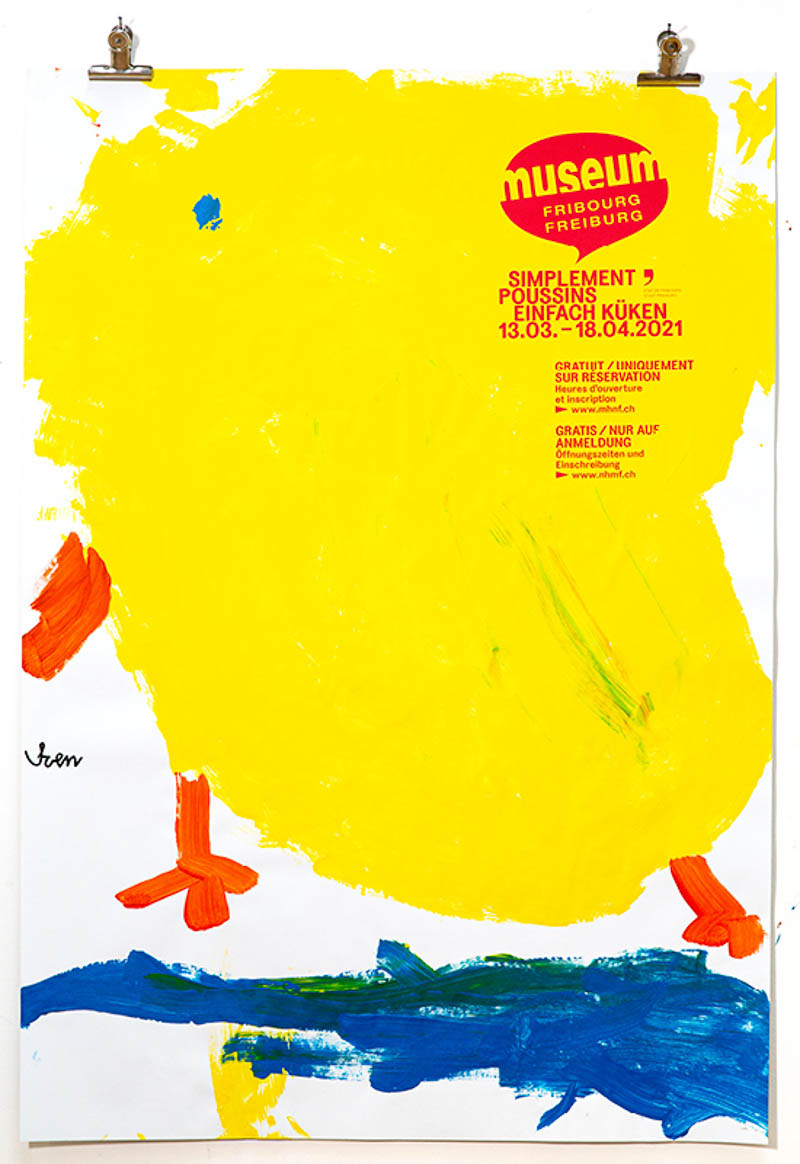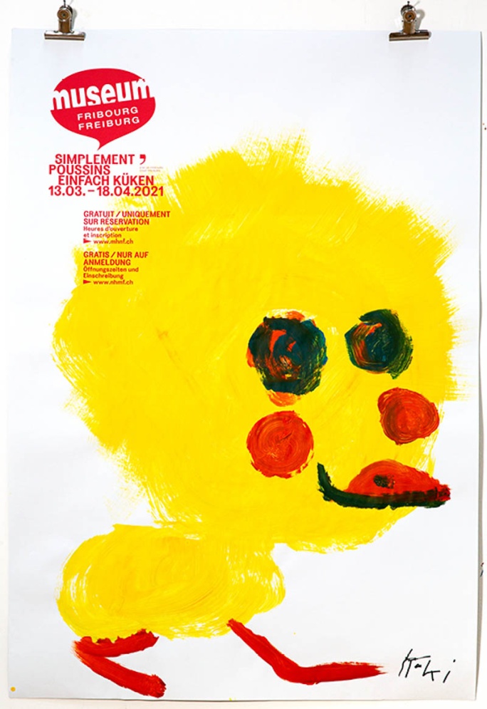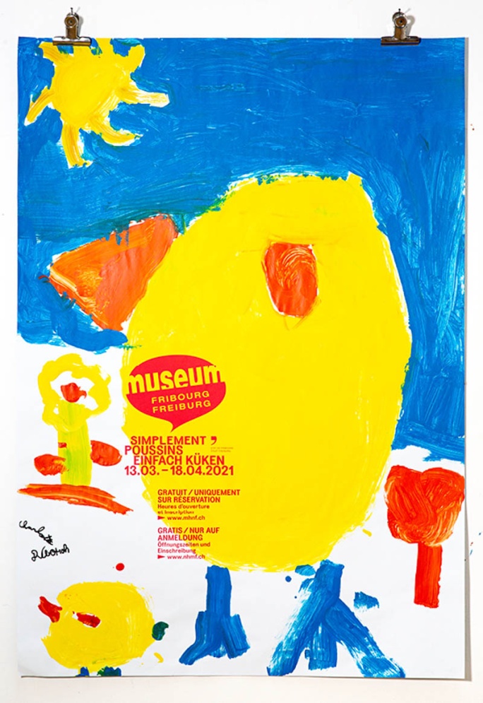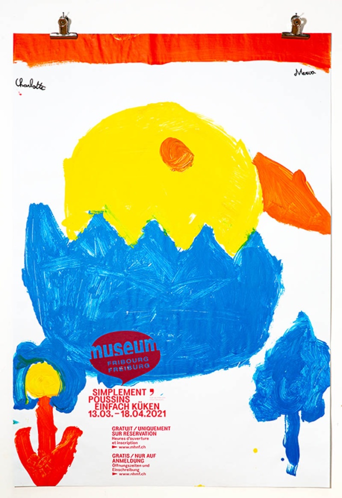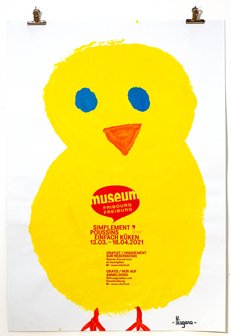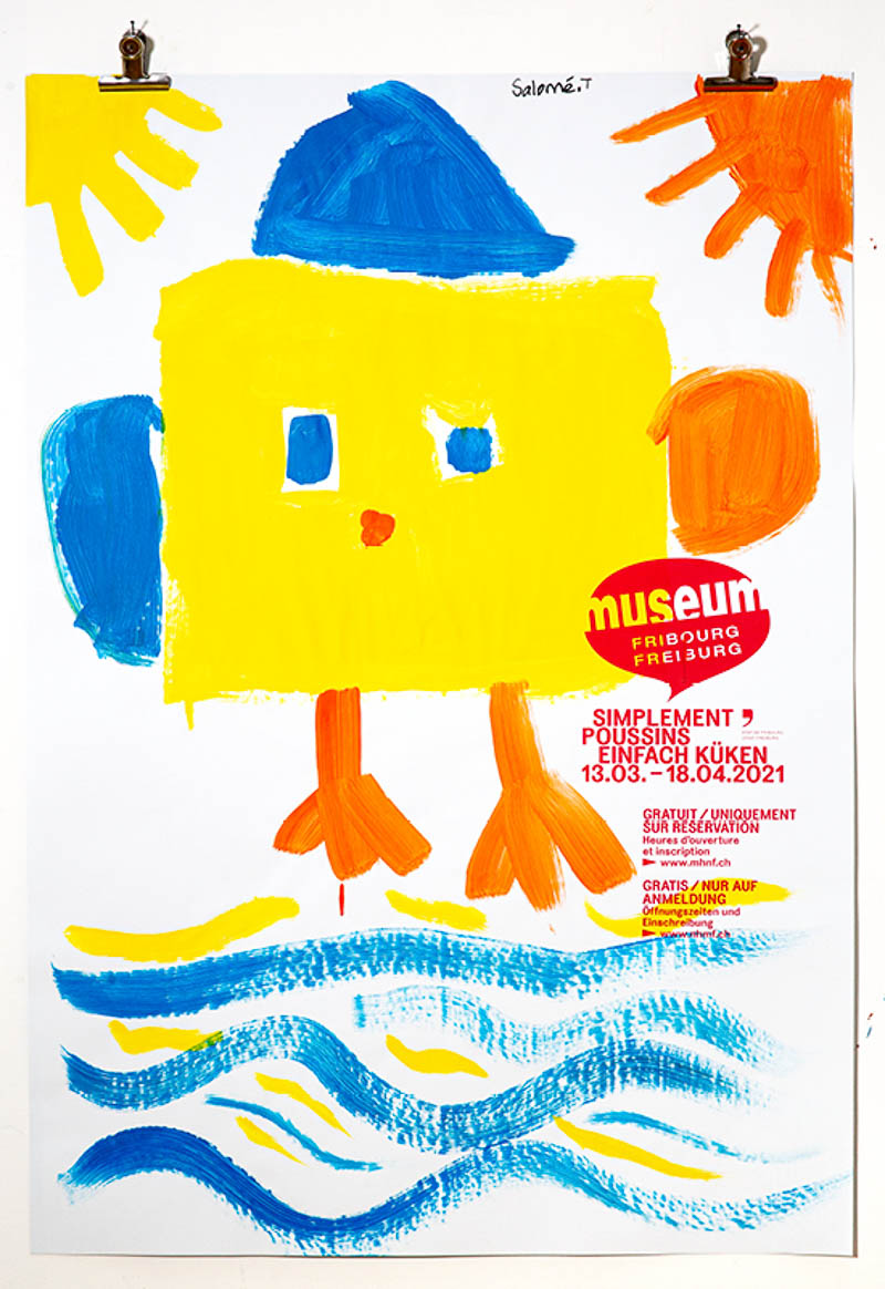 Die Küken sind aber nicht nur im Museum präsent, sondern in der ganzen Stadt Freiburg: Während der Dauer der Ausstellung bringen von Schulkindern gemalte Plakate mit Kükenmotiven Farbe in die Strassen der Stadt. Über 80 Schülerinnen und Schüler aus fünf Primarschulklassen der Stadt Freiburg haben insgesamt rund 120 Plakate gestaltet. Jedes ist ein Unikat: Alle Werke wurden im Atelier des Grafikers René Walker von Hand gemalt und im Siebdruckverfahren hergestellt. Die Plakate sind bis Ende der Ausstellung in drei Etappen zu sehen. Wer will, kann die Plakate mit diesem Stadtplan auf einem Spaziergang entdecken.