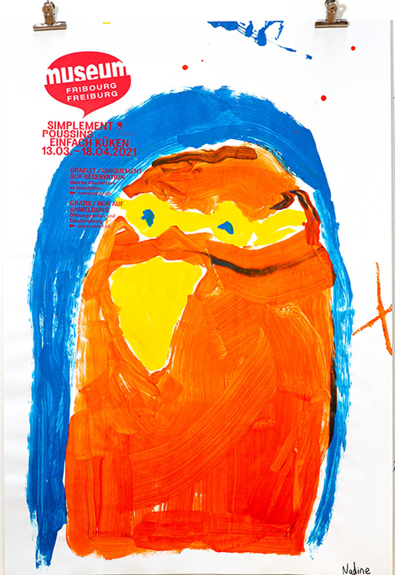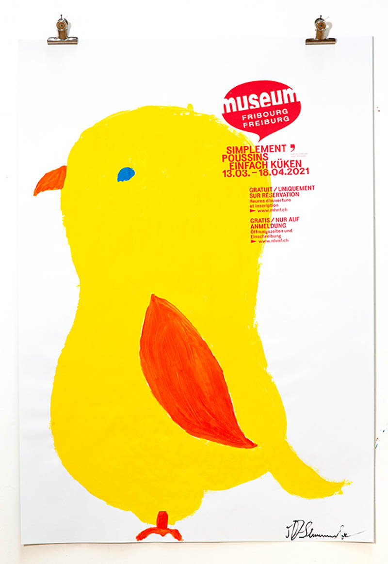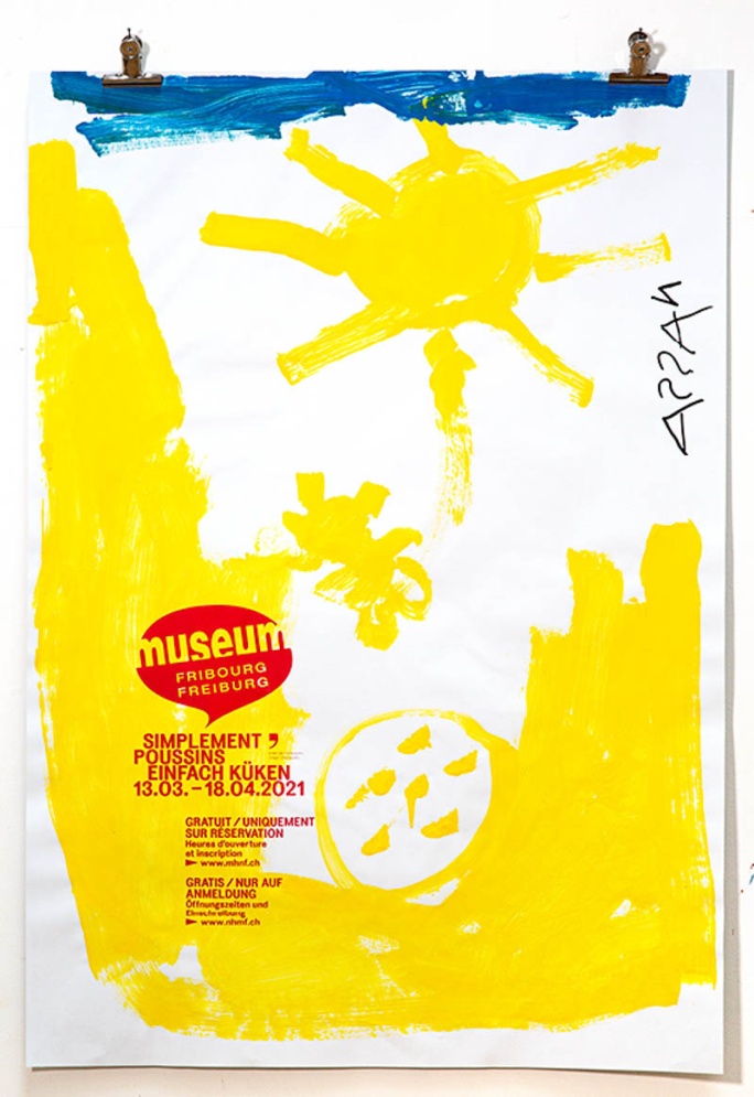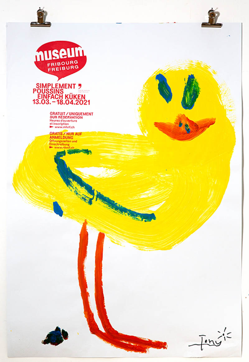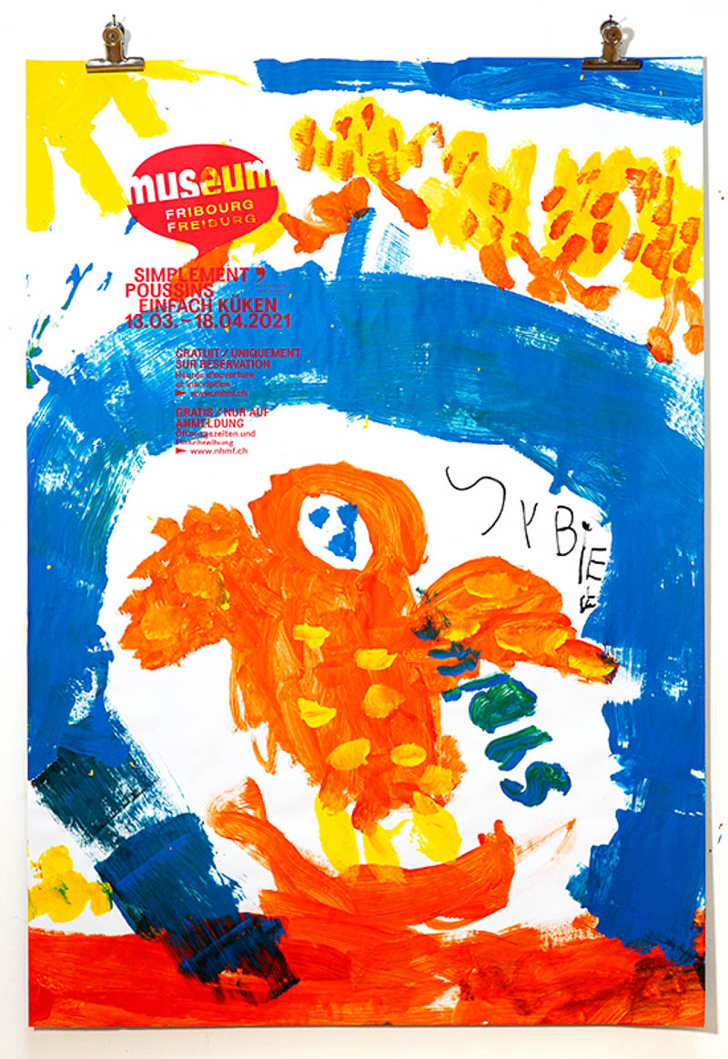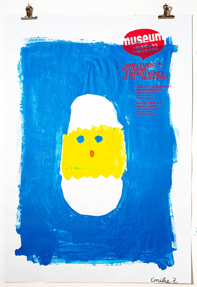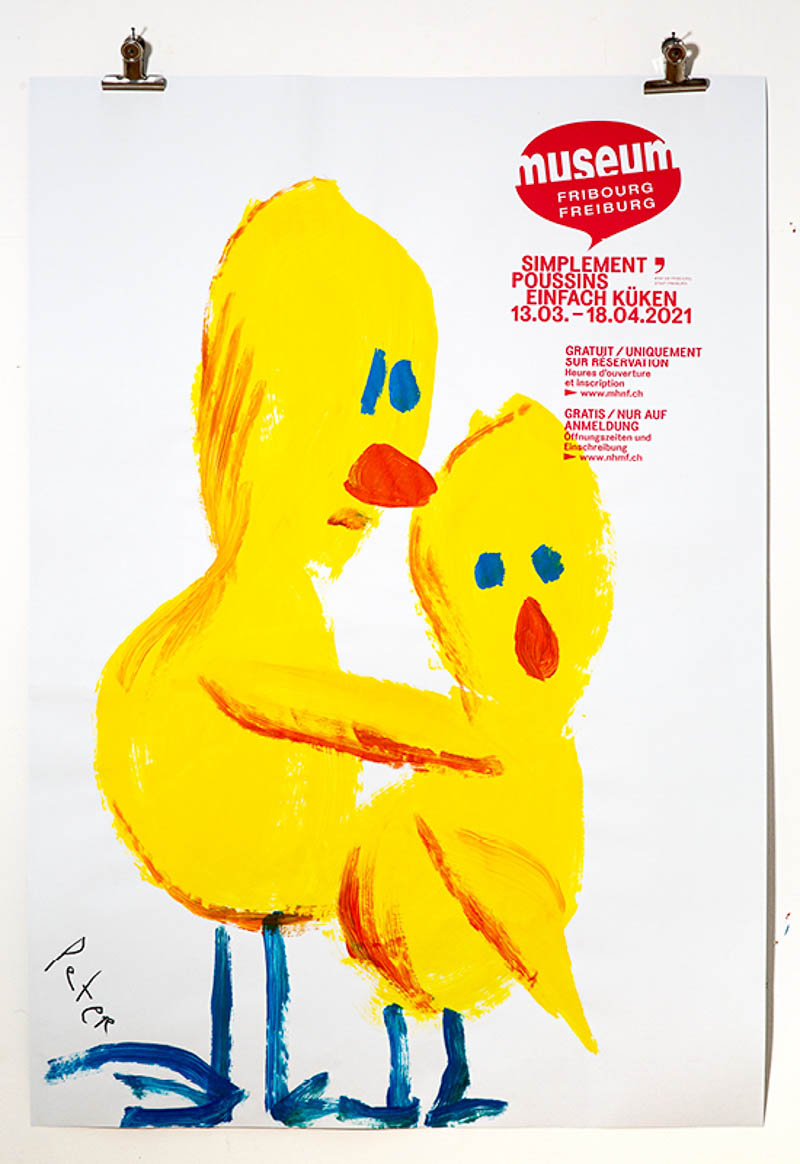Die Küken sind aber nicht nur im Museum präsent, sondern in der ganzen Stadt Freiburg: Während der Dauer der Ausstellung bringen von Schulkindern gemalte Plakate mit Kükenmotiven Farbe in die Strassen der Stadt. Über 80 Schülerinnen und Schüler aus fünf Primarschulklassen der Stadt Freiburg haben insgesamt rund 120 Plakate gestaltet. Jedes ist ein Unikat: Alle Werke wurden im Atelier des Grafikers René Walker von Hand gemalt und im Siebdruckverfahren hergestellt. Die Plakate sind bis Ende der Ausstellung in drei Etappen zu sehen. Wer will, kann die Plakate mit diesem Stadtplan auf einem Spaziergang entdecken.