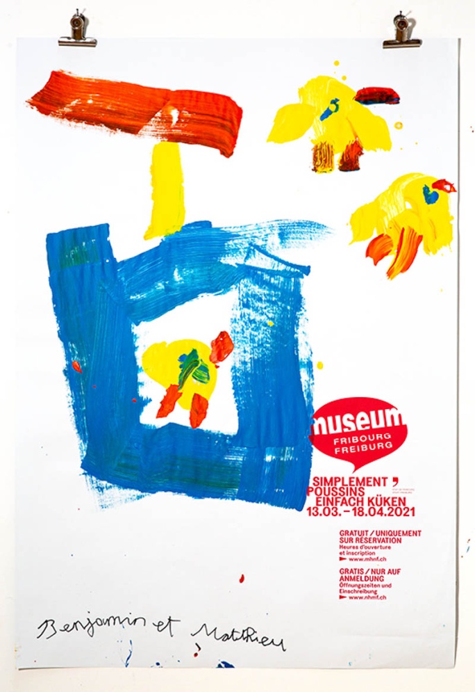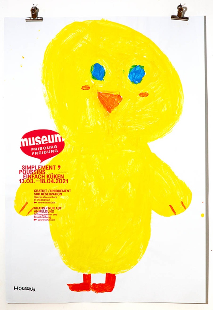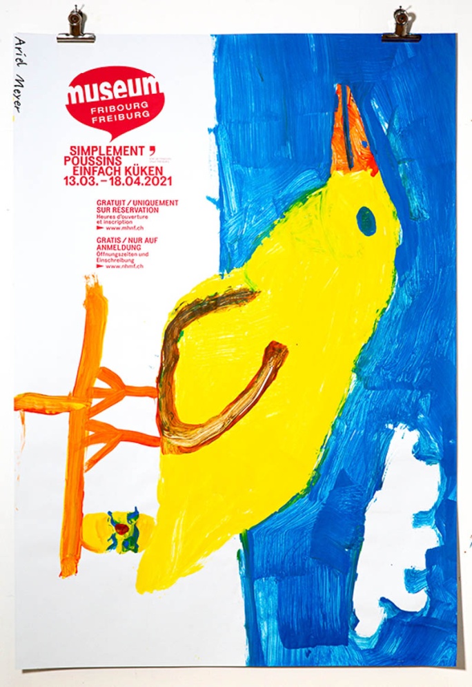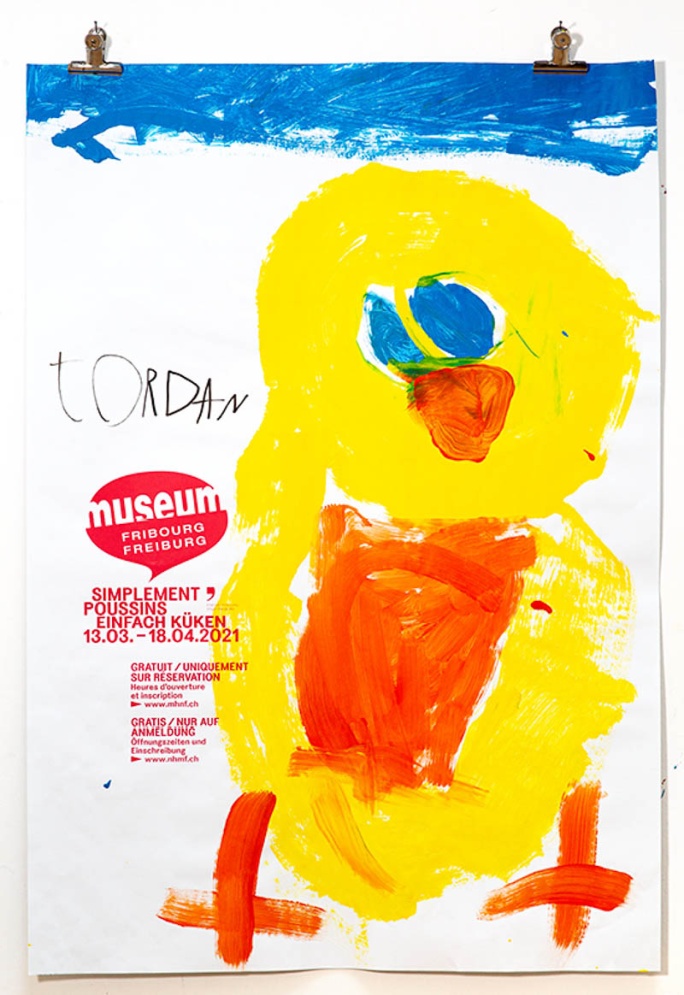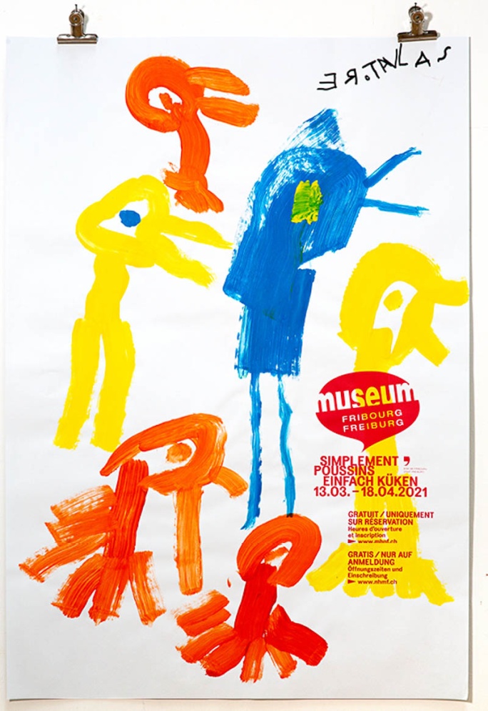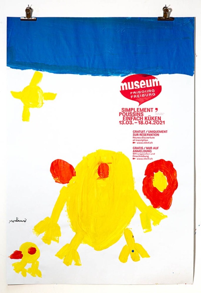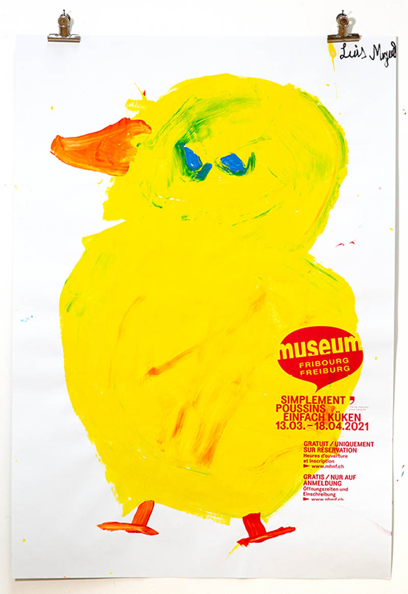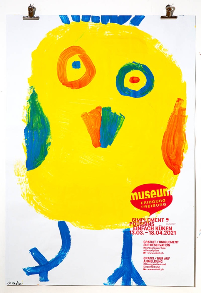 Die Küken sind aber nicht nur im Museum präsent, sondern in der ganzen Stadt Freiburg: Während der Dauer der Ausstellung bringen von Schulkindern gemalte Plakate mit Kükenmotiven Farbe in die Strassen der Stadt. Über 80 Schülerinnen und Schüler aus fünf Primarschulklassen der Stadt Freiburg haben insgesamt rund 120 Plakate gestaltet. Jedes ist ein Unikat: Alle Werke wurden im Atelier des Grafikers René Walker von Hand gemalt und im Siebdruckverfahren hergestellt. Die Plakate sind bis Ende der Ausstellung in drei Etappen zu sehen. Wer will, kann die Plakate mit diesem Stadtplan auf einem Spaziergang entdecken.