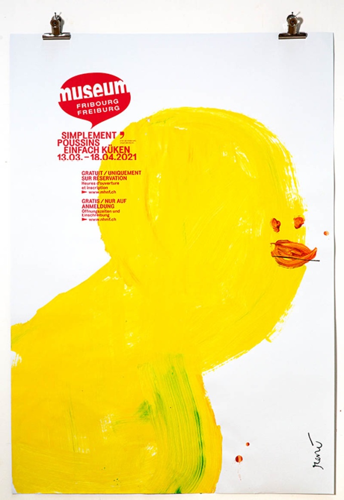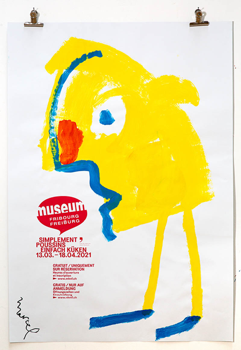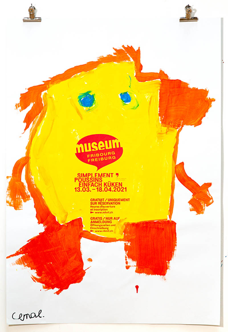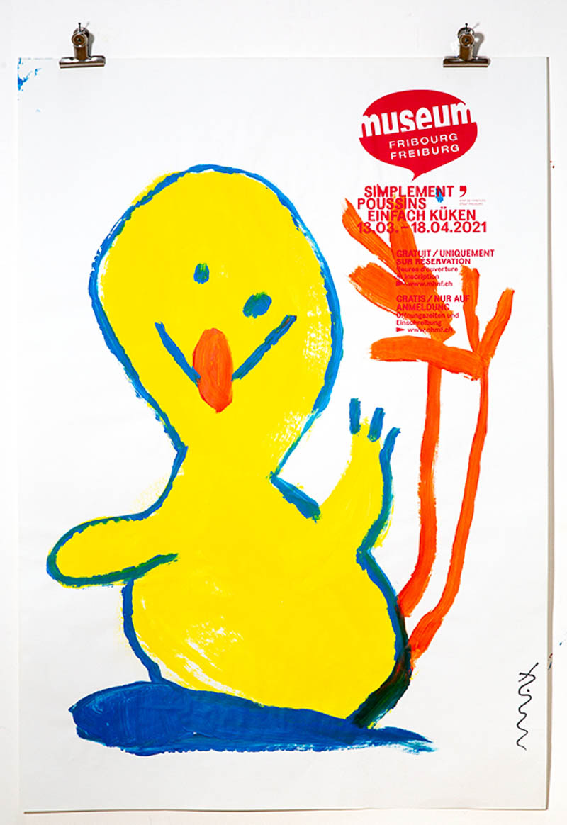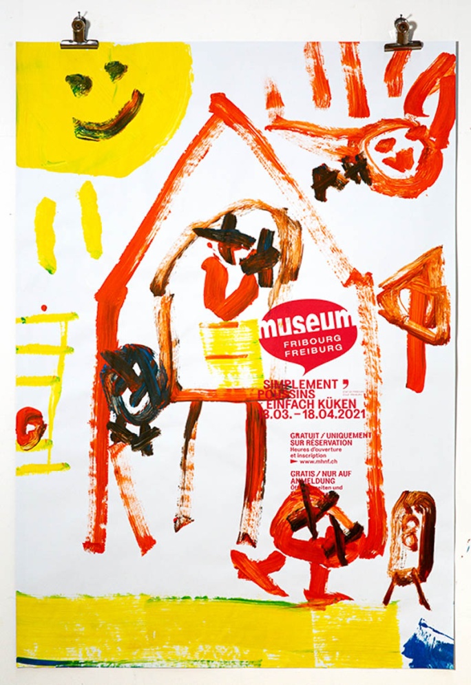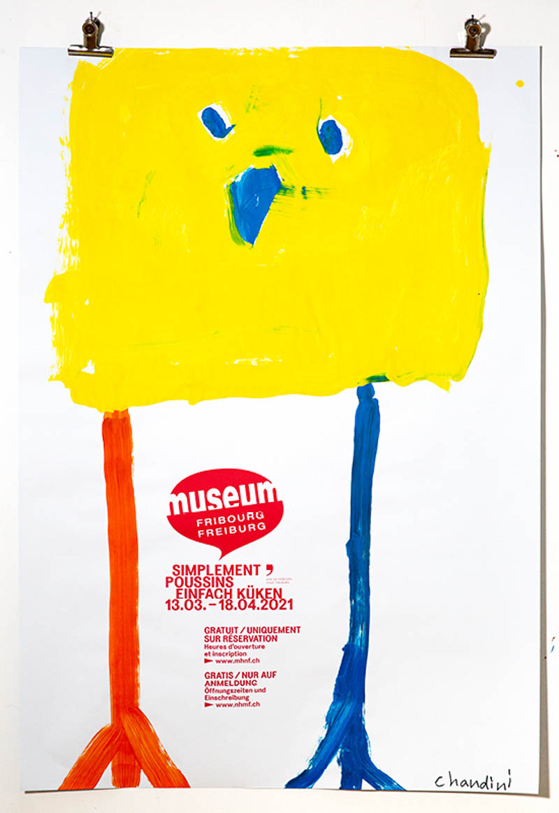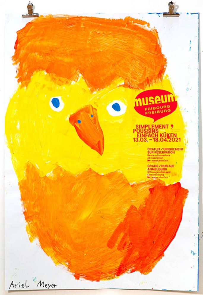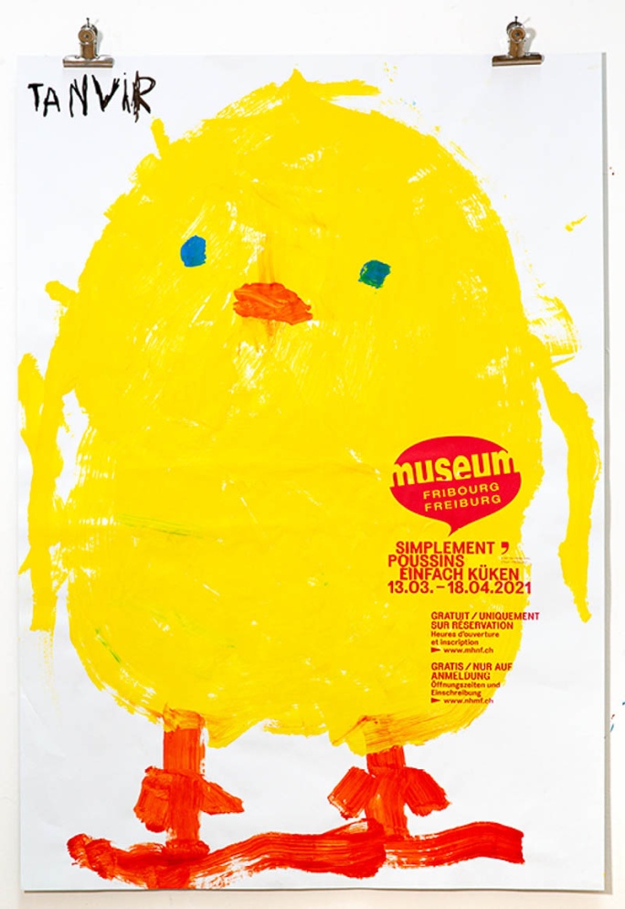 Die Küken sind aber nicht nur im Museum präsent, sondern in der ganzen Stadt Freiburg: Während der Dauer der Ausstellung bringen von Schulkindern gemalte Plakate mit Kükenmotiven Farbe in die Strassen der Stadt. Über 80 Schülerinnen und Schüler aus fünf Primarschulklassen der Stadt Freiburg haben insgesamt rund 120 Plakate gestaltet. Jedes ist ein Unikat: Alle Werke wurden im Atelier des Grafikers René Walker von Hand gemalt und im Siebdruckverfahren hergestellt. Die Plakate sind bis Ende der Ausstellung in drei Etappen zu sehen. Wer will, kann die Plakate mit diesem Stadtplan auf einem Spaziergang entdecken.