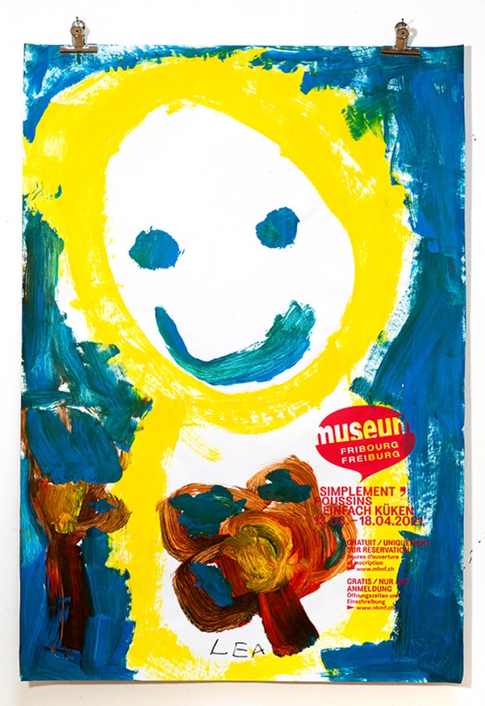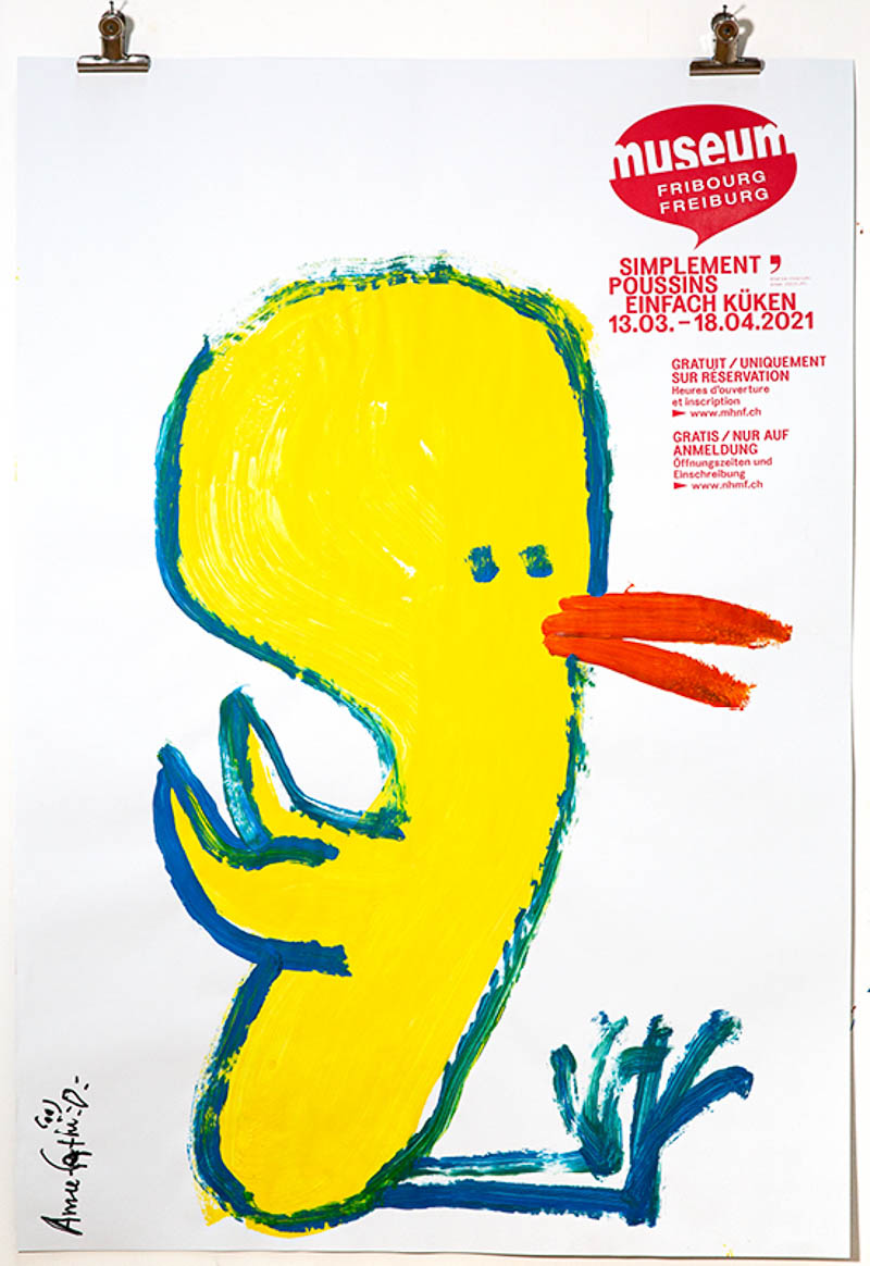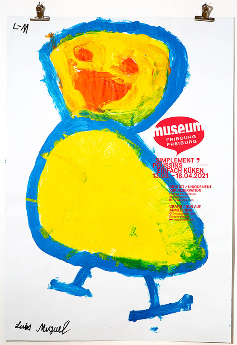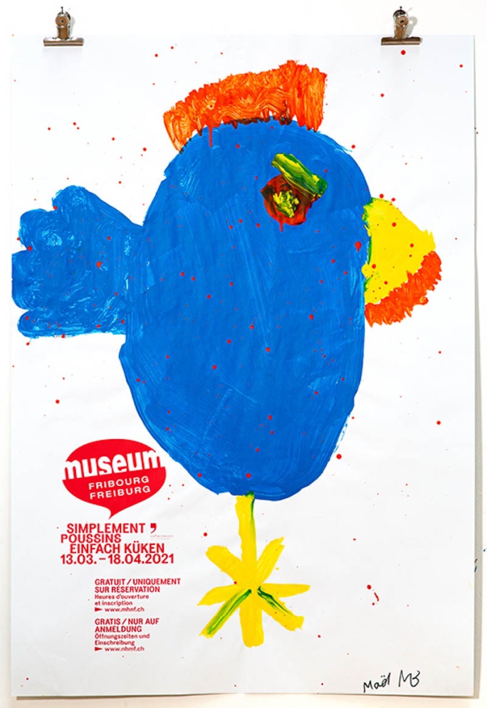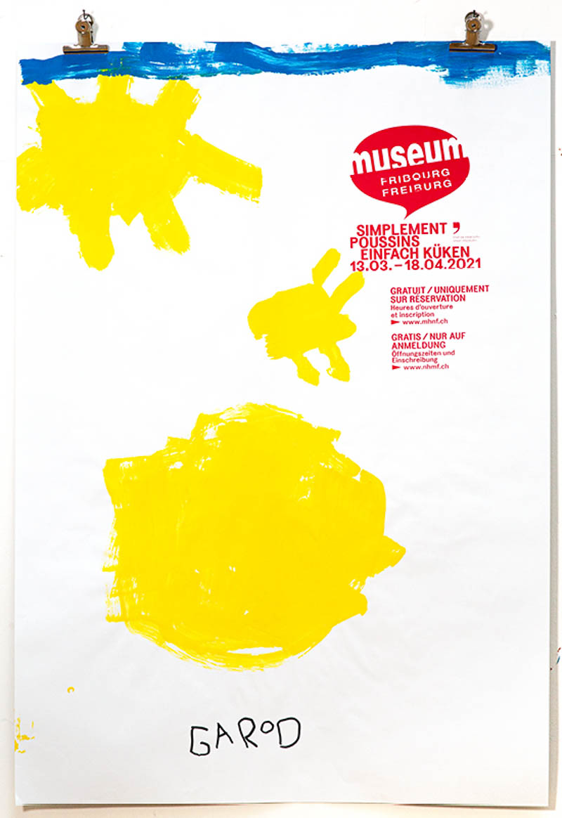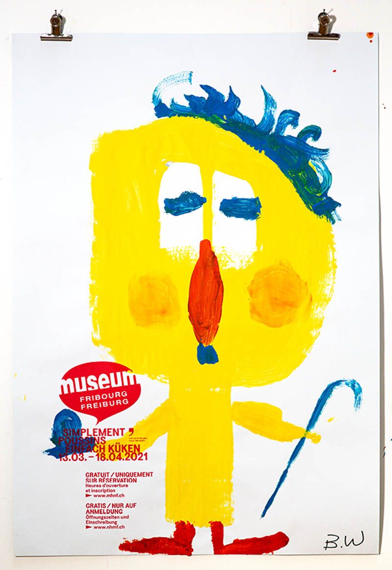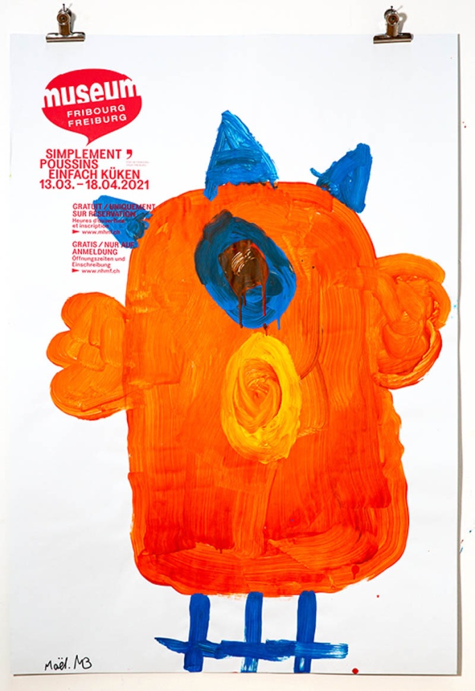 Die Küken sind aber nicht nur im Museum präsent, sondern in der ganzen Stadt Freiburg: Während der Dauer der Ausstellung bringen von Schulkindern gemalte Plakate mit Kükenmotiven Farbe in die Strassen der Stadt. Über 80 Schülerinnen und Schüler aus fünf Primarschulklassen der Stadt Freiburg haben insgesamt rund 120 Plakate gestaltet. Jedes ist ein Unikat: Alle Werke wurden im Atelier des Grafikers René Walker von Hand gemalt und im Siebdruckverfahren hergestellt. Die Plakate sind bis Ende der Ausstellung in drei Etappen zu sehen. Wer will, kann die Plakate mit diesem Stadtplan auf einem Spaziergang entdecken.
