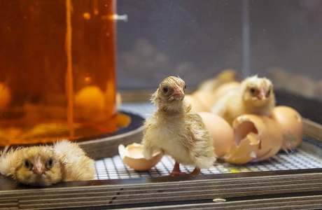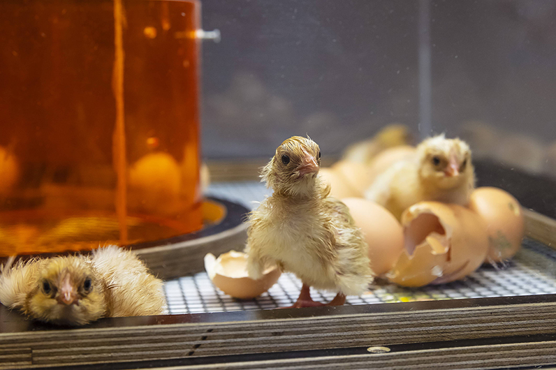 Nachdem wir so viel über die Küken gelernt haben, beobachten wir sie natürlich auch in echt: Im vergrösserten und erhöhten Gehege tummeln sich lebendige Küken, und in den Brutkästen lässt sich mit etwas Glück sogar miterleben, wie eines schlüpft! Schliesslich lohnt sich auch ein Abstecher in den Botanischen Garten gleich neben dem Museum: Dort steht unser mobiler Hühnerstall mit Hahn und Hennen – und manchmal begrüsst der Hahn seine Besucherinnen und Besucher mit einem lauten «Kikeriki» …