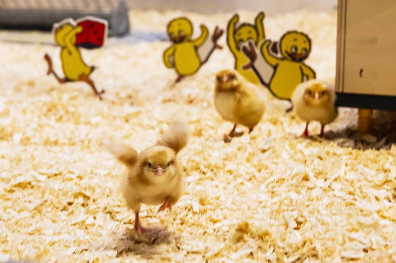 Nebst vielen Zeichnungen von Claude Ponti, bietet die 37. Ausgabe der Ausstellung auch einen Einblick in das Leben und Verhalten der Küken und zeigt, was die herzigen gelben Daunenkugeln den ganzen Tag so treiben. Wer will, schlüpft einfach selbst in die Haut eines Kükens und lernt spielerisch, wie dieses sich bewegt und wie es das richtige Futter findet – und sogar, wie sich Kükenkot von jenem anderer Tiere unterscheidet. Anschliessend gibt es eine Verschnaufpause unter dem kuschelig warmen Bauch einer Riesenhenne.