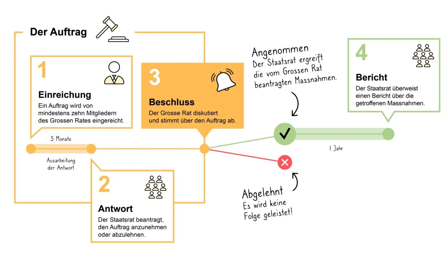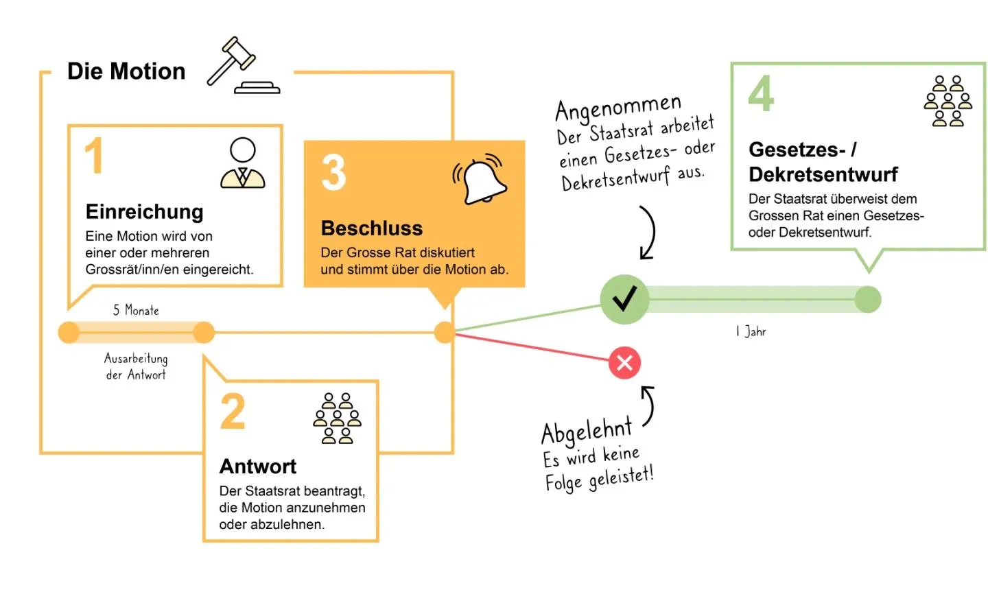 Die Motion verpflichtet den Staatsrat, einen Gesetzes- oder Dekretsentwurf vorzulegen. Die Behandlung einer Motion läuft in mehreren Schritten: