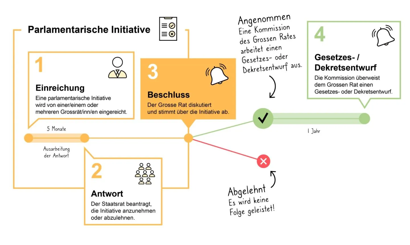 Mit der parlamentarischen Initiative wird derselbe Zweck verfolgt wie mit einer Motion, aber sie ist an den Grossen Rat gerichtet und verlangt von ihm, einen Gesetzesentwurf, einen Dekretsentwurf oder einen Entwurf einer Verfassungsänderung auszuarbeiten.